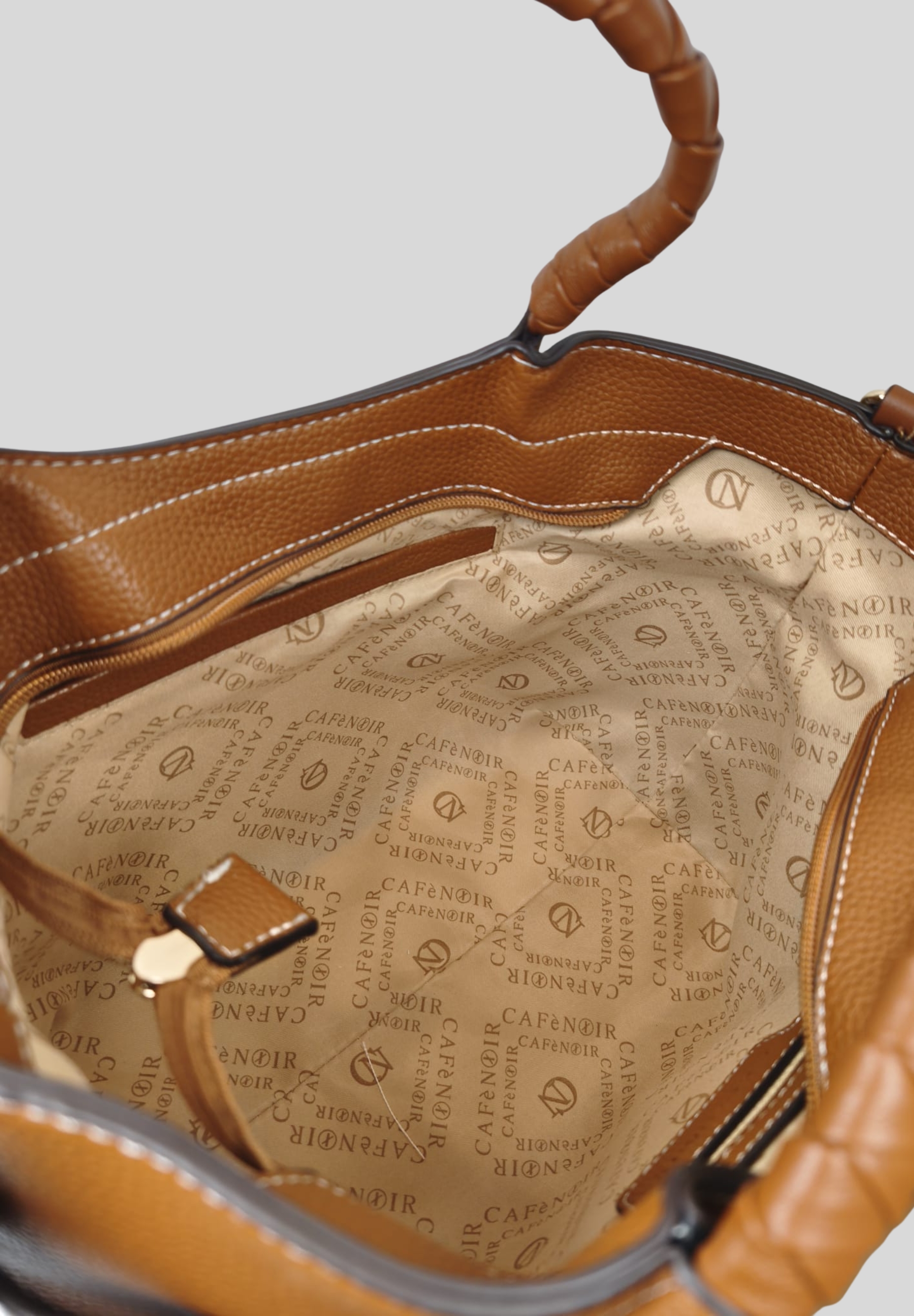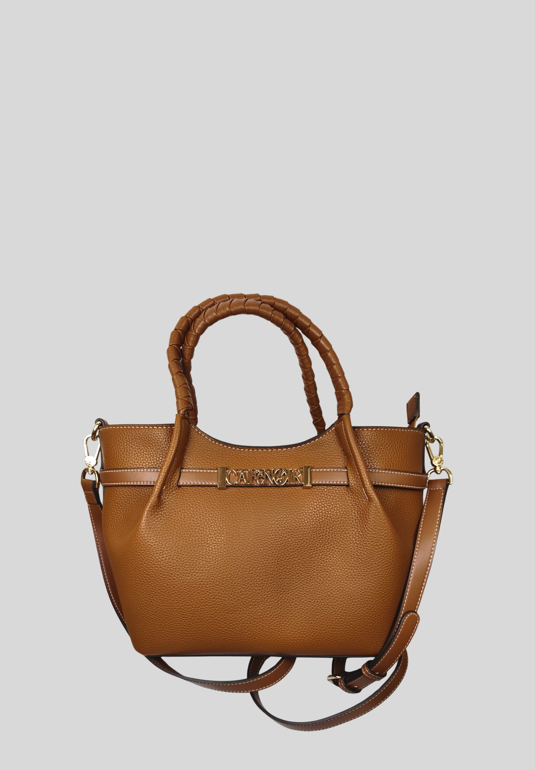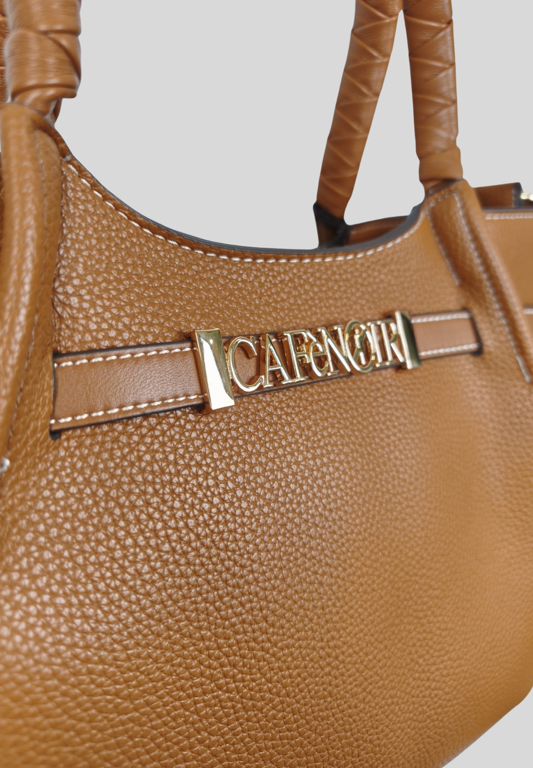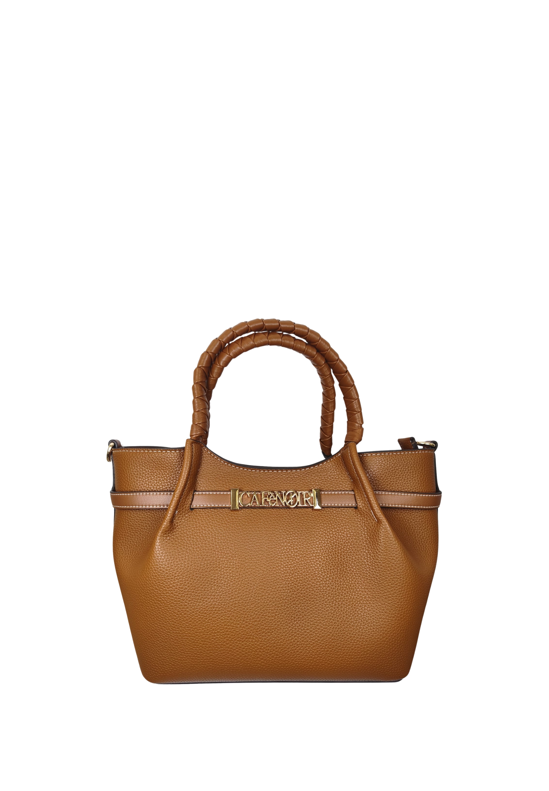 The structured design is enhanced by the front gold-tone Cafè Noir logo, a distinctive detail that adds character and brightness. The rigid handles with woven detailing add a sophisticated and modern touch, making the bag feminine and stylish.