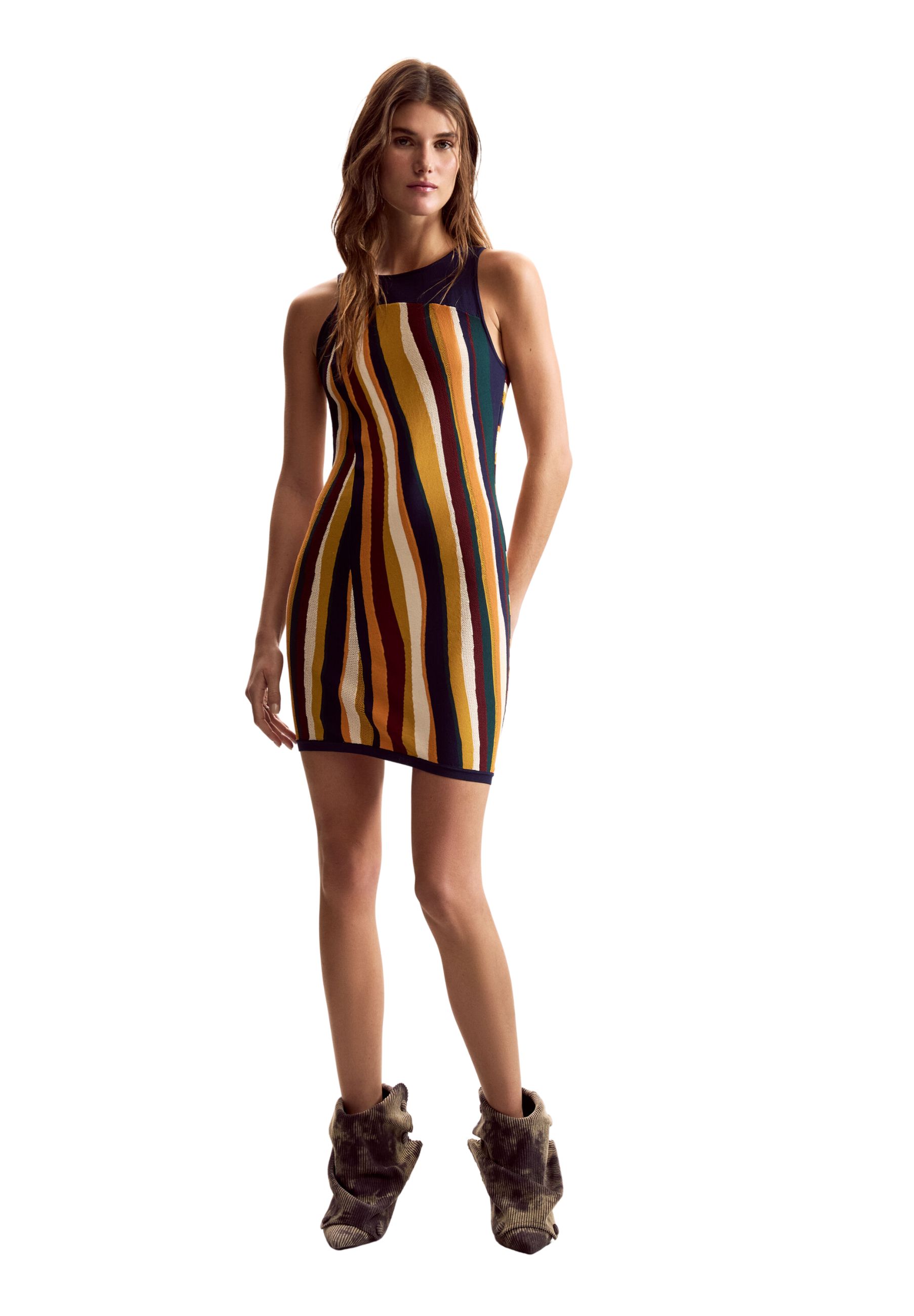 The absolute protagonist of the piece is the vertical stripe print, characterized by intense and harmoniously alternated colors, which visually elongate the silhouette and recall the artistic style of the Lacroix x Desigual collaborations. The viscose fabric, enriched with polyester and polyamide, ensures a fluid drape, lightness, and a pleasant feel on the skin.