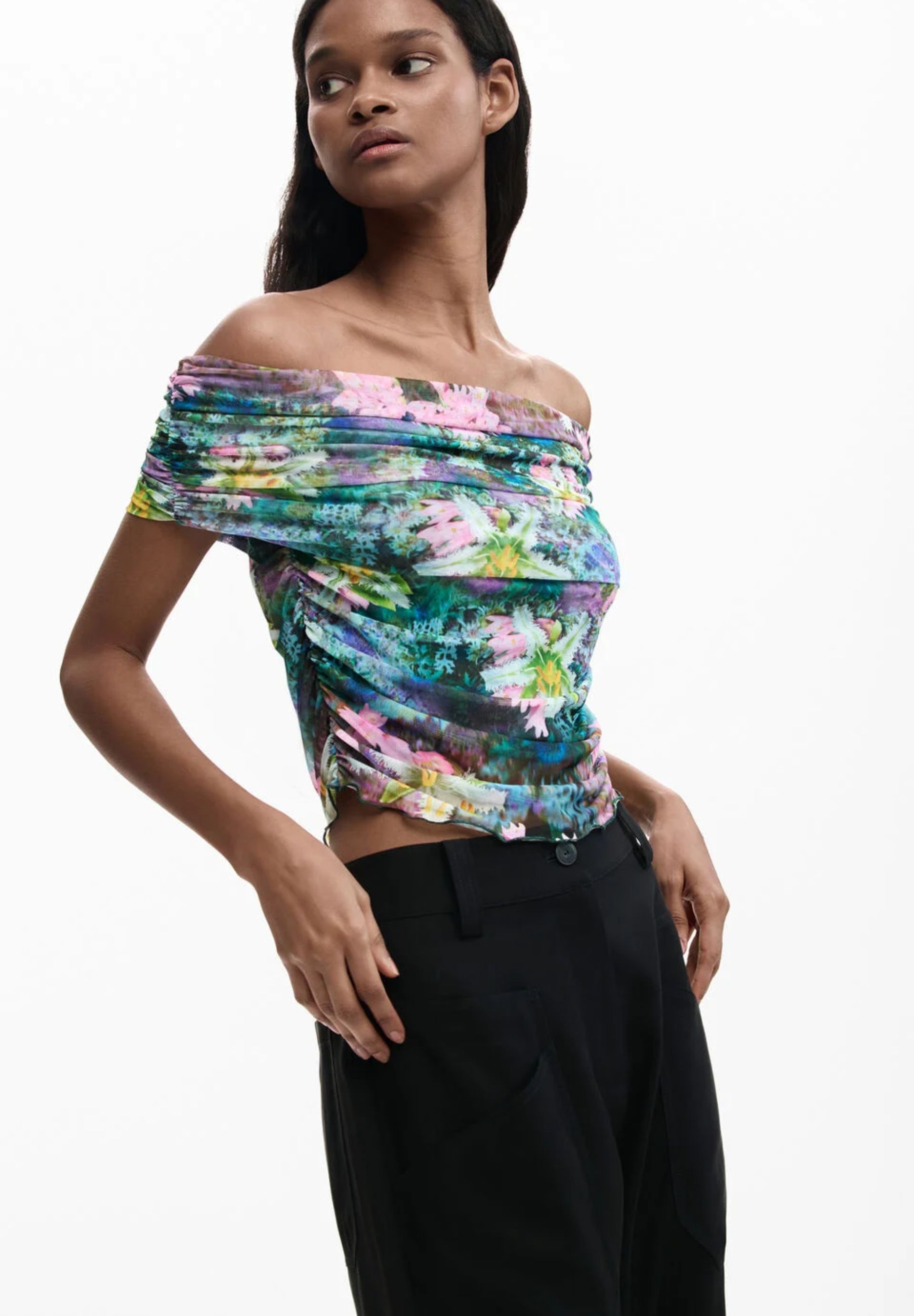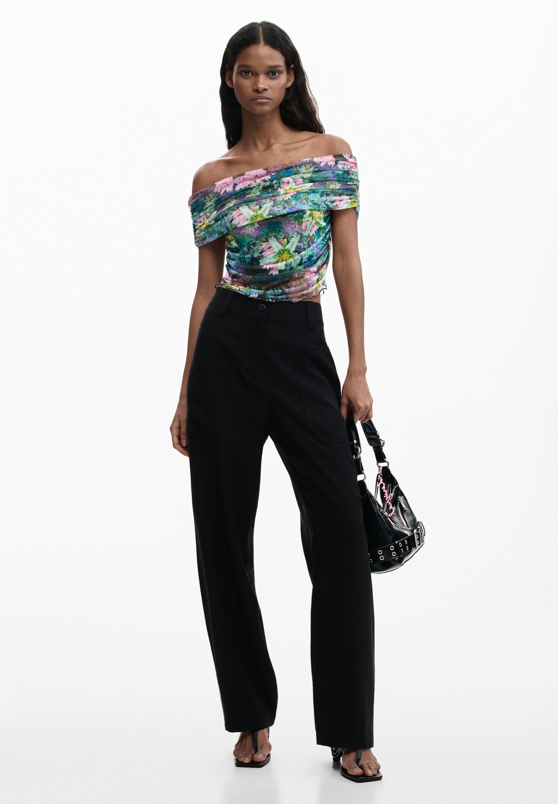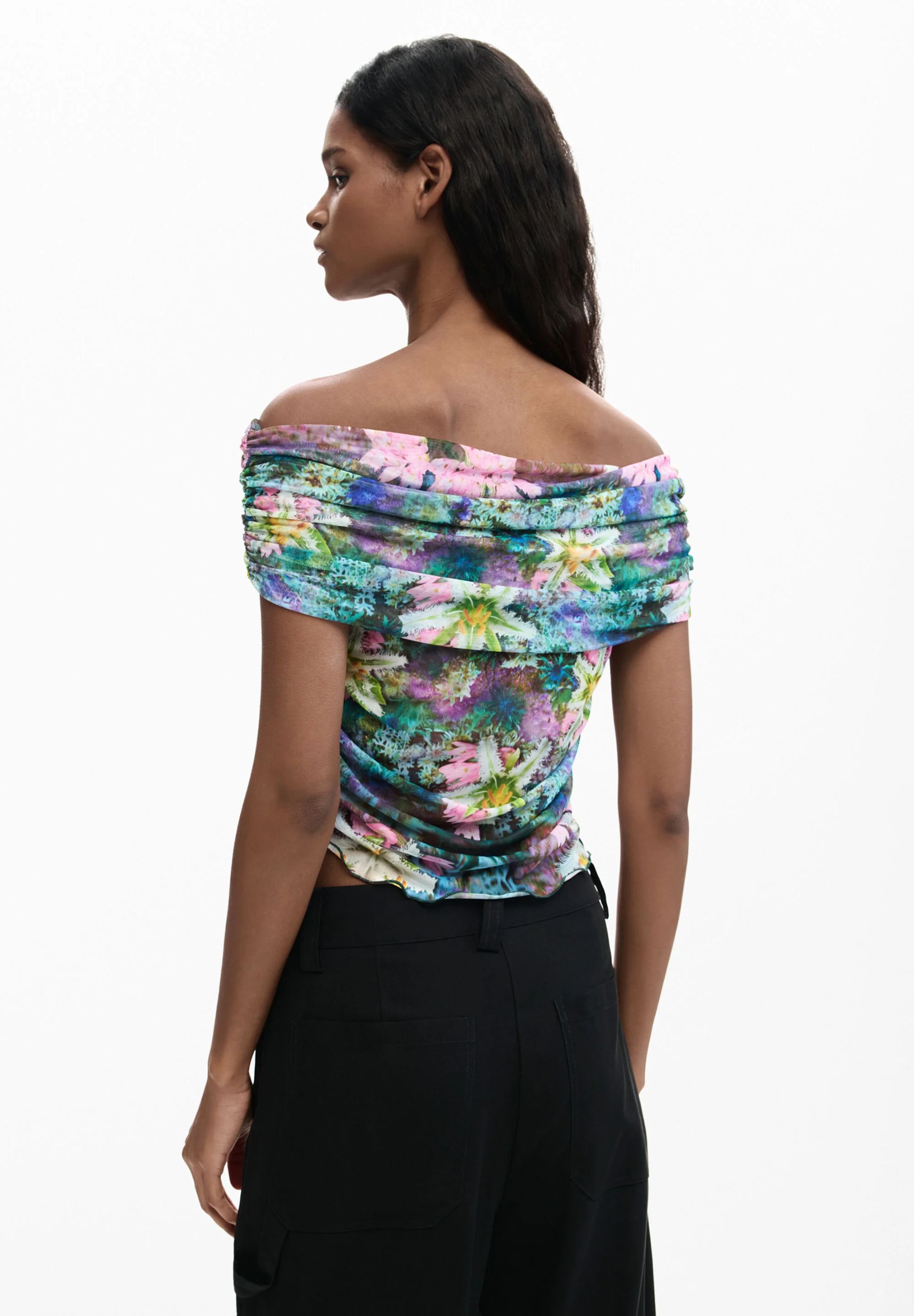 This Desigual top in 93% polyester and 7% elastane is a modern piece full of character, perfect for creating creative and contemporary looks. The model features a wide, straight neckline, which enhances the upper part of the bust with an elegant and feminine effect. The fitted shape follows the silhouette harmoniously, while the stretchy fabric ensures comfort and freedom of movement throughout the day.