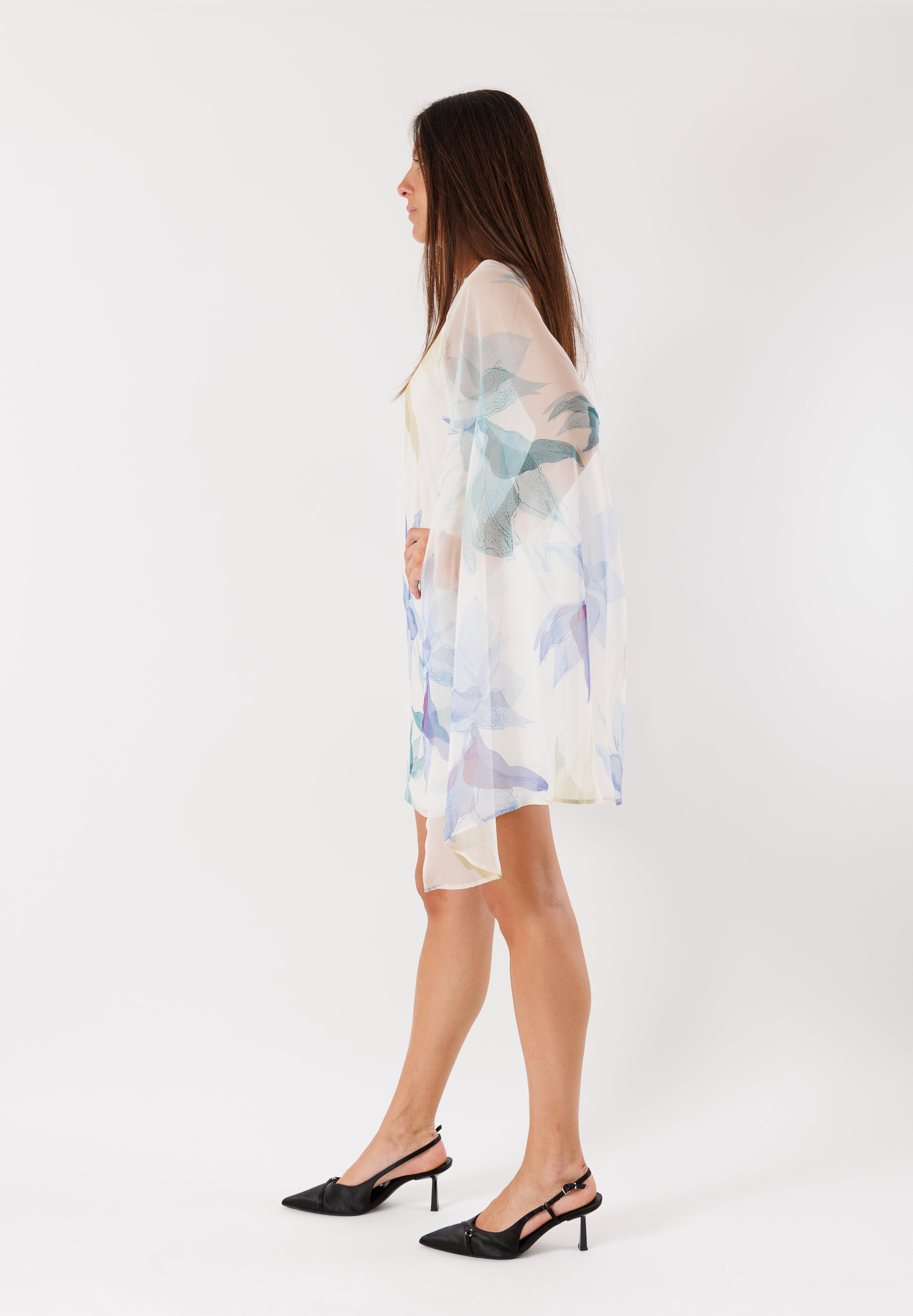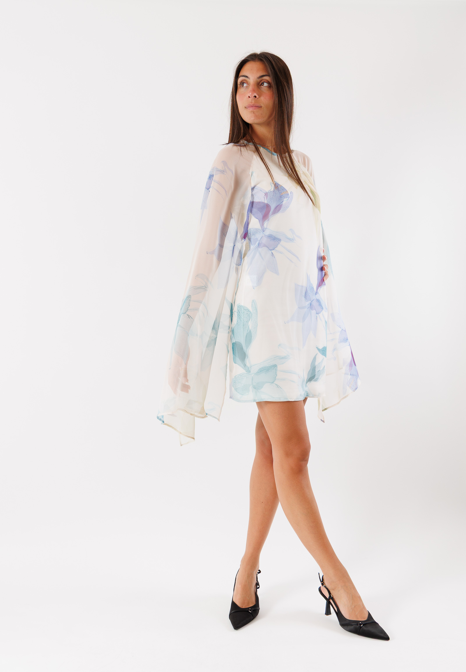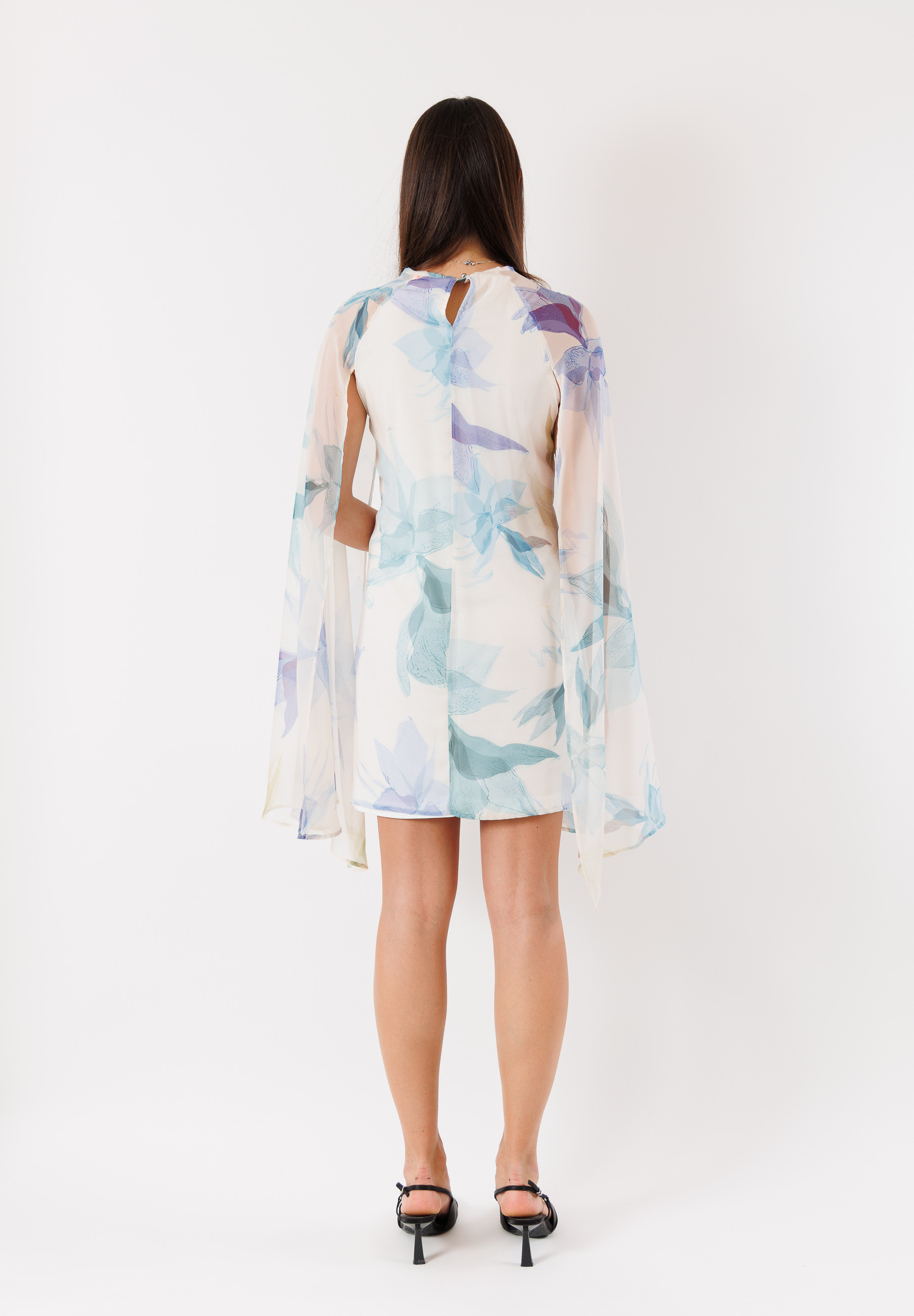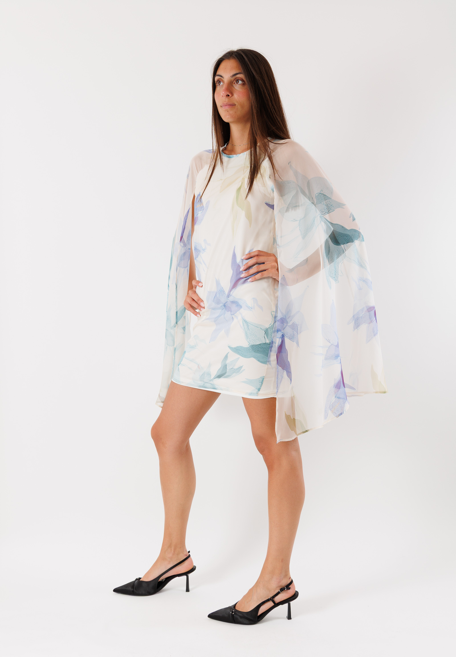 The elegant silhouette is enhanced by wide cape sleeves in transparent chiffon, which add movement and lightness.