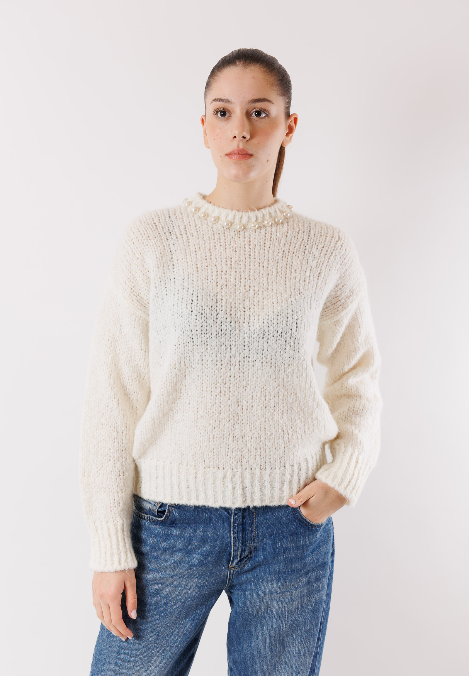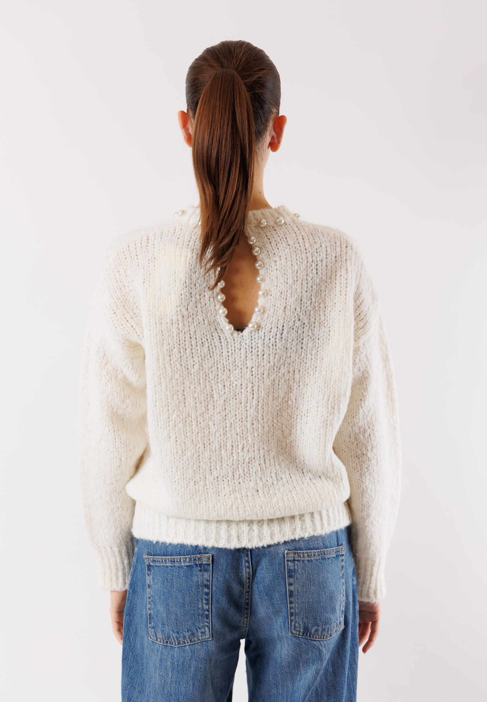 Crew-neck sweater with teardrop opening on the back with pearls