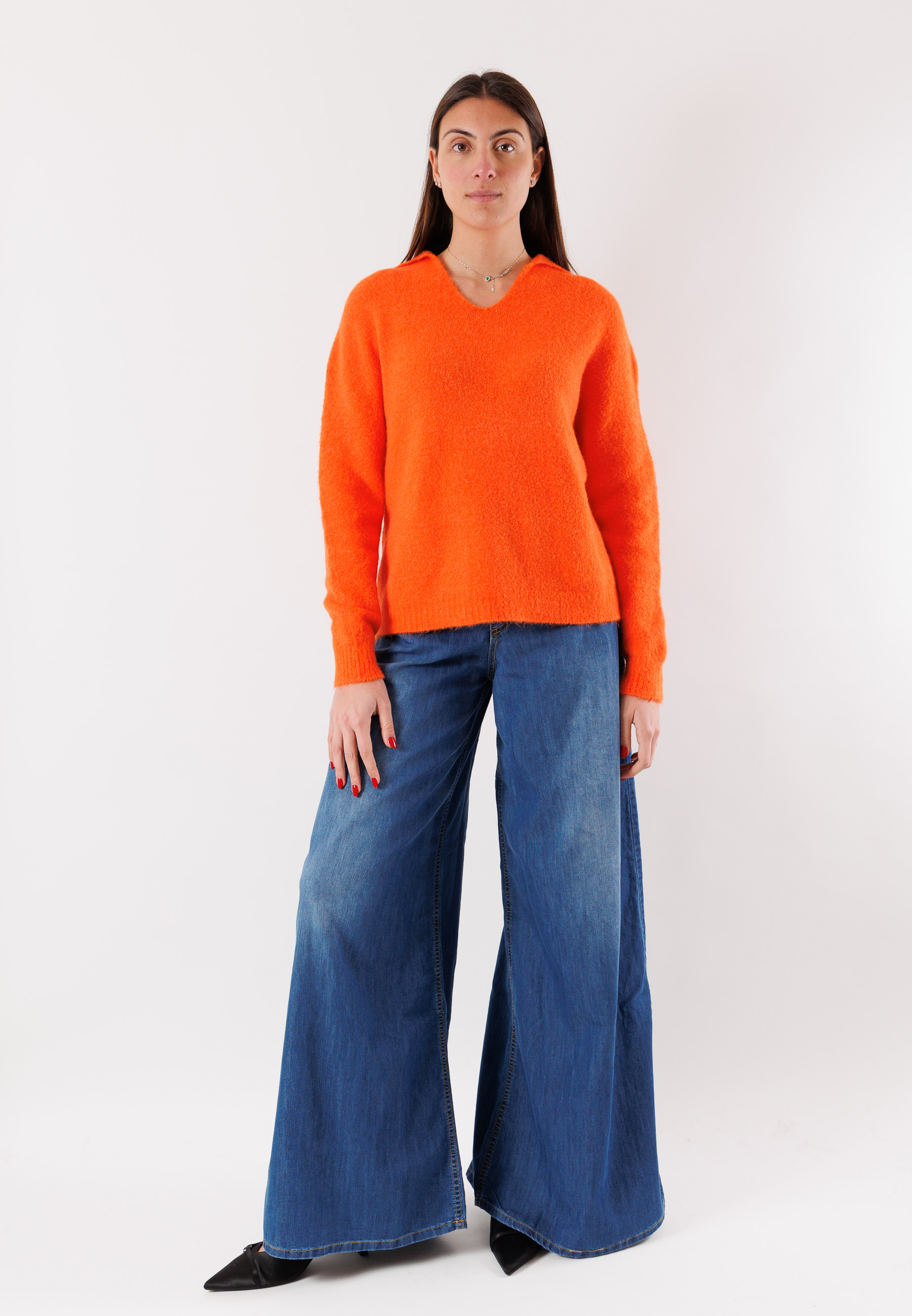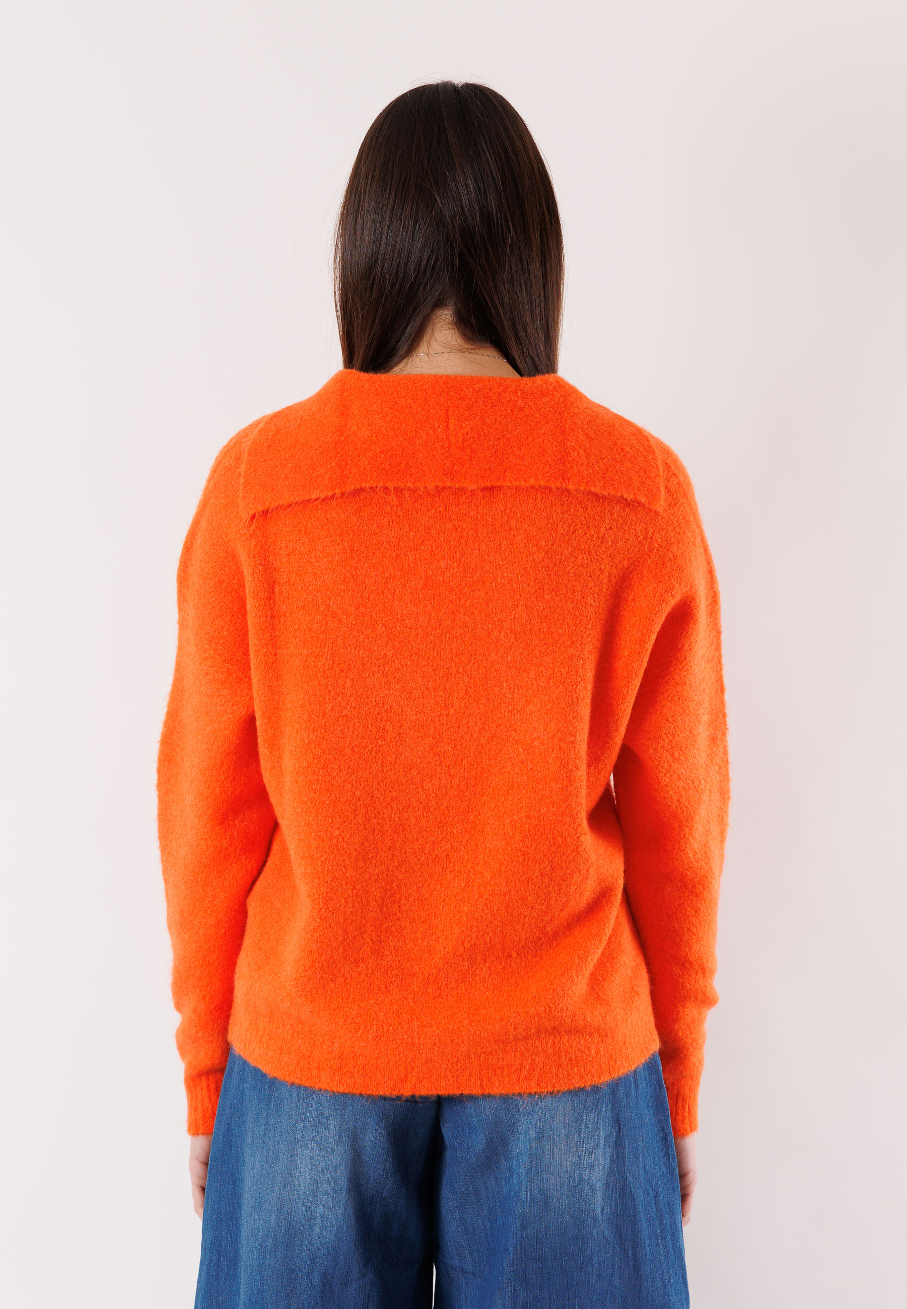 The V-neck enhances the décolleté line, while the clean design and soft texture make it perfect for the colder season. Versatile and easy to match, it pairs well with tailored trousers, denim, or skirts, suitable for both casual chic outfits and more polished looks.