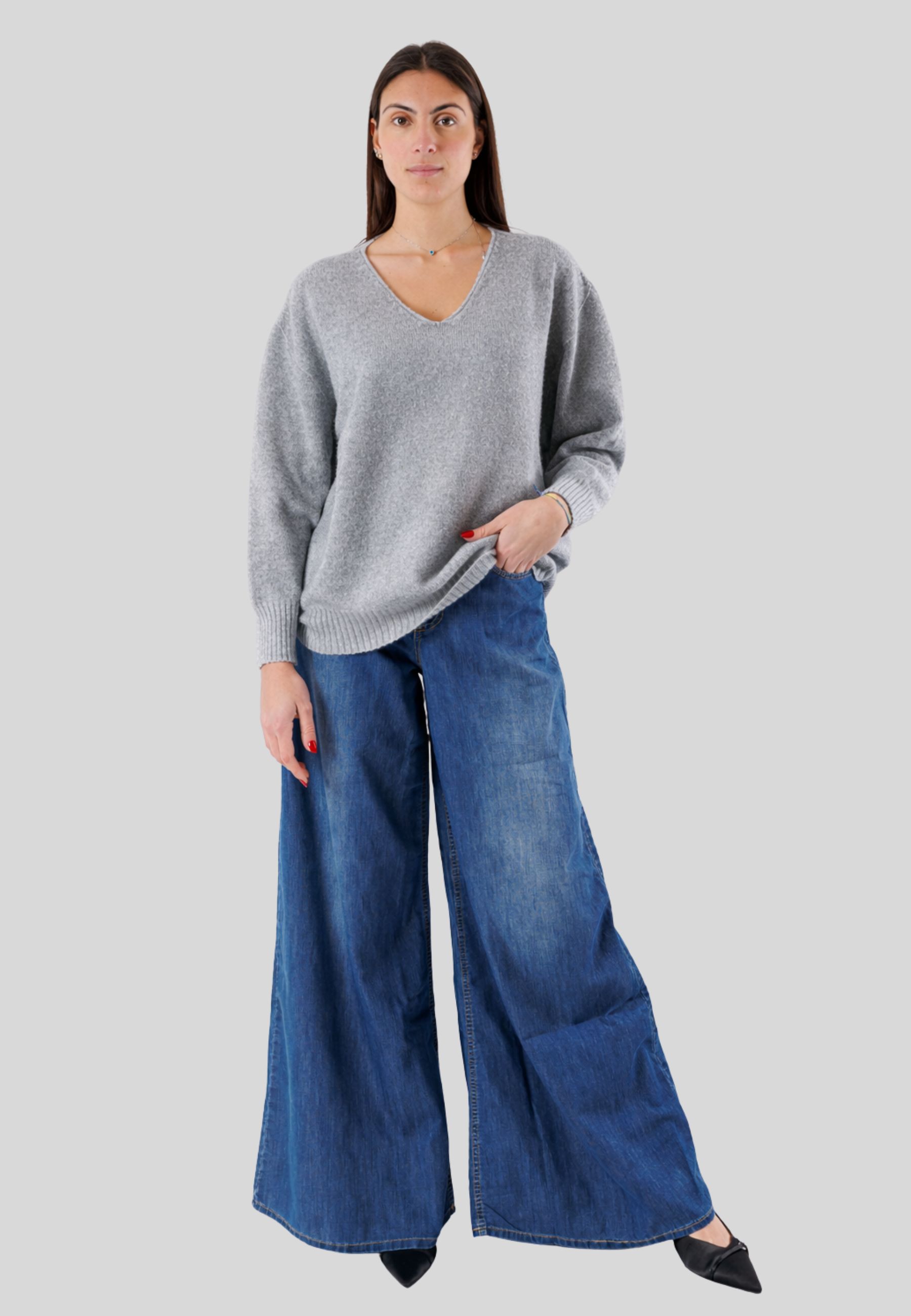 The V-neck enhances the silhouette with elegance, while the relaxed shape makes it perfect for both casual chic looks and more formal combinations. Ideal to wear with tailored trousers, jeans, or skirts, it is a versatile and easily coordinated garment.