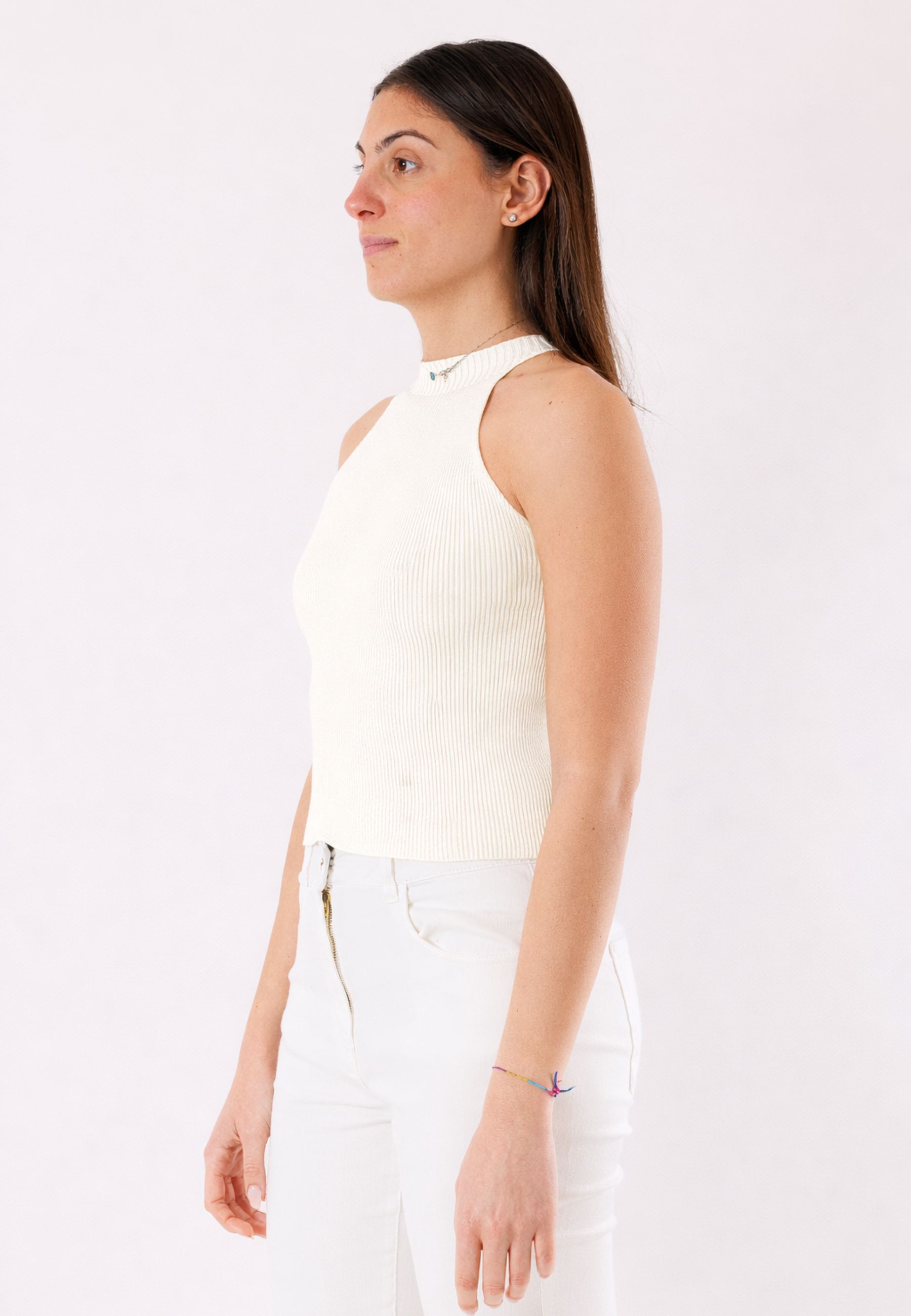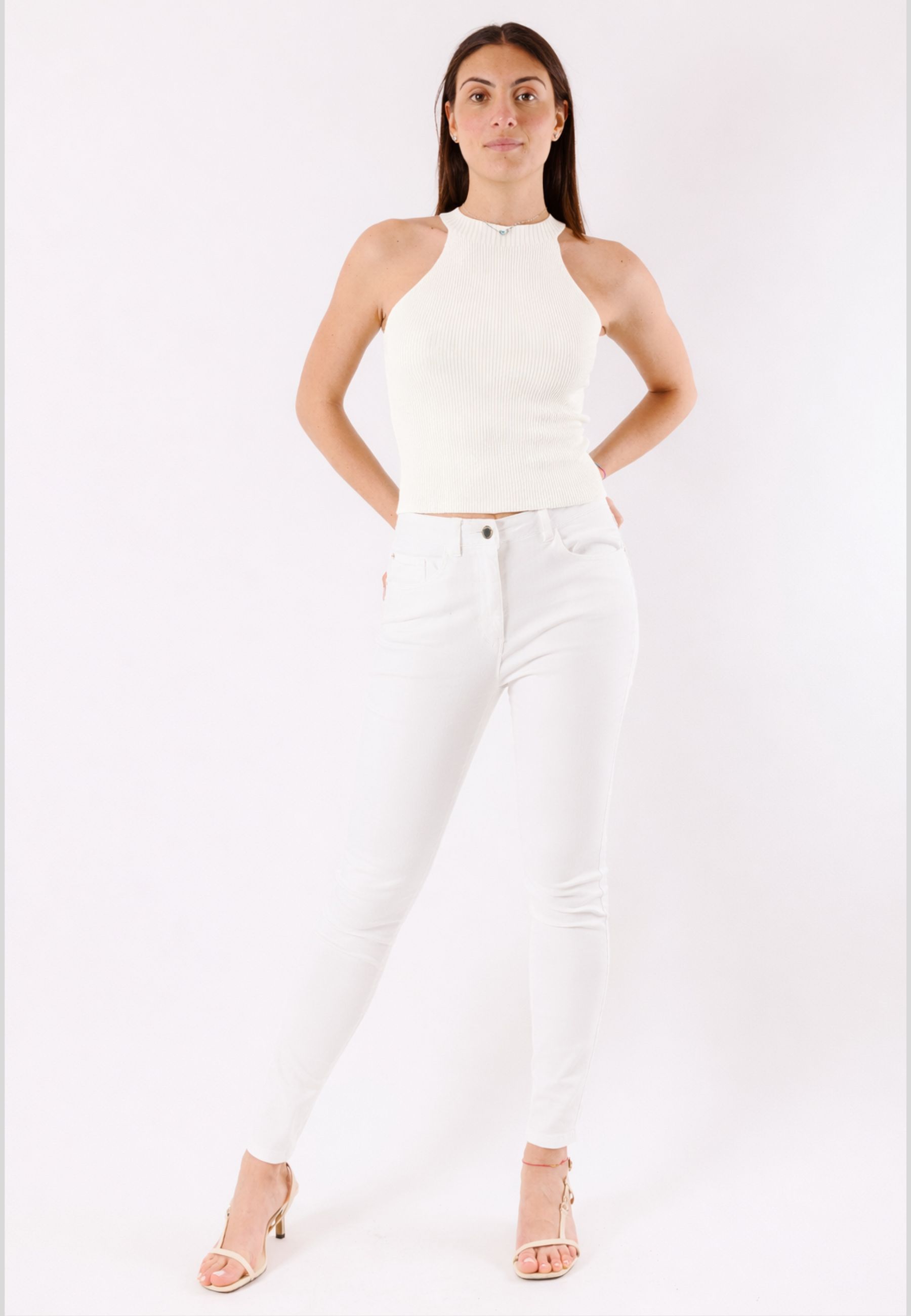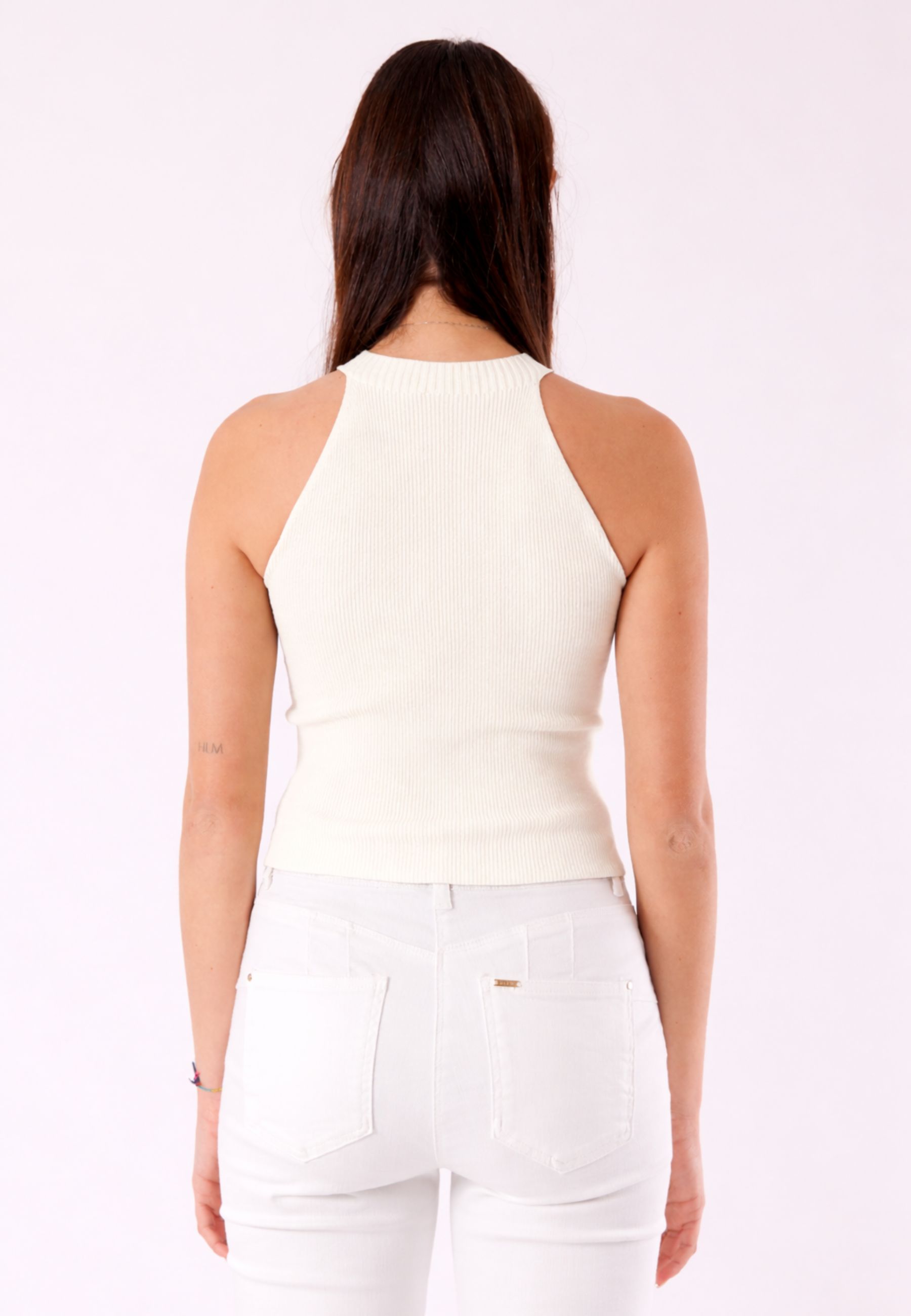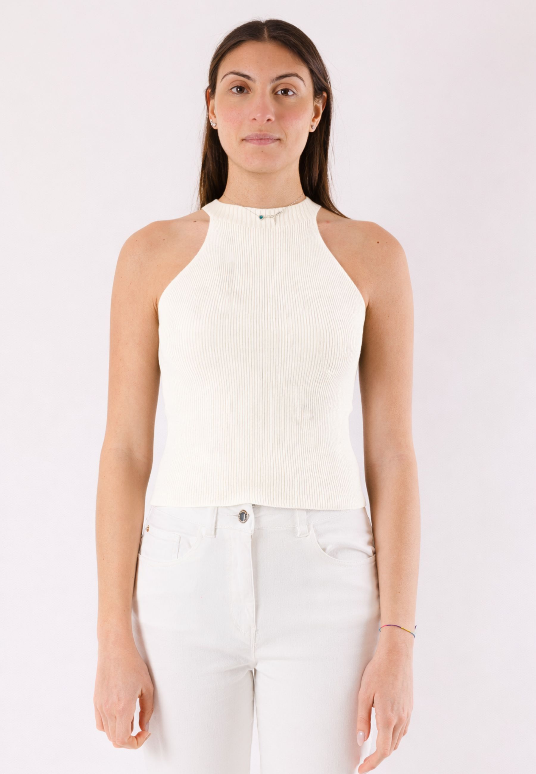This Kontatto top is an essential and versatile piece, perfect for creating modern and minimal outfits. The design features a fitted silhouette that naturally enhances your shape and a soft, shaped neckline, designed to add balance and sophistication to the overall look. The sleeveless cut makes it ideal for warm weather or as a base layer to wear under jackets, cardigans, and blazers. Made from a lightweight and comfortable fabric, the top offers a pleasant fit that moves with you without restrictions. The simplicity of the design allows for endless combinations: perfect with denim, tailored pants, skirts, or more casual-chic looks. An indispensable piece for those who love a clean, contemporary, and functional style.