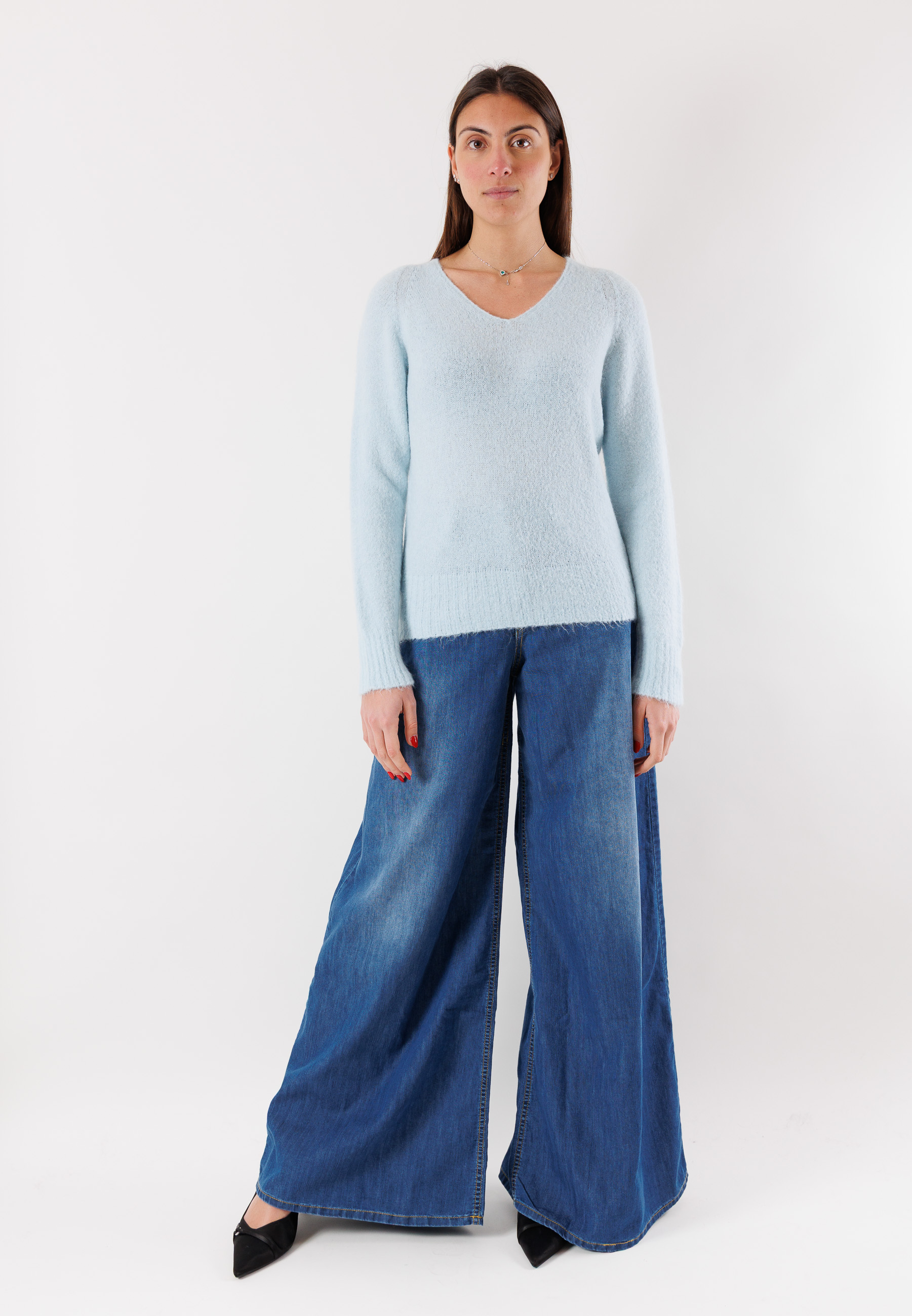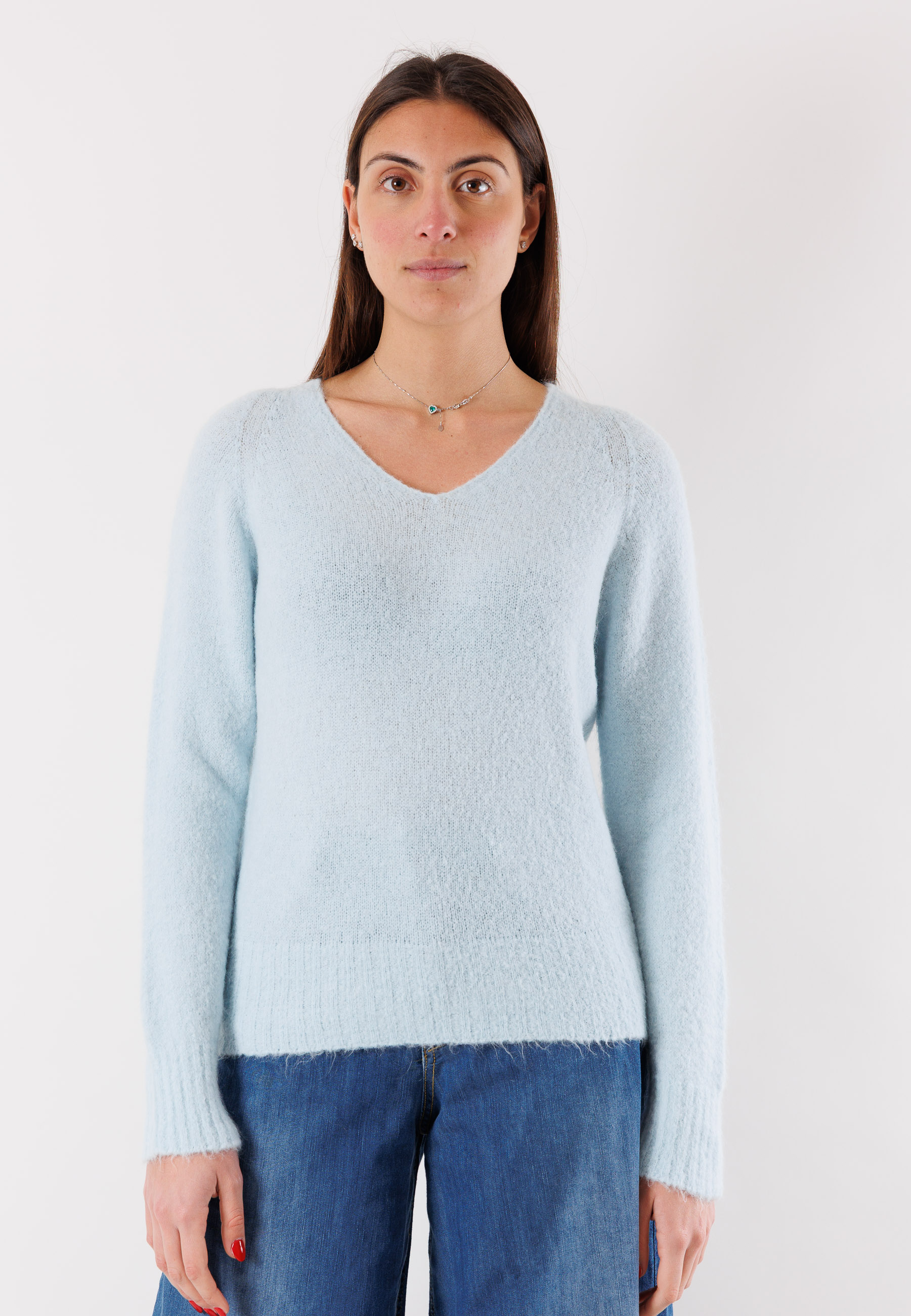 An essential and refined top for the cold season: this Kontatto V-neck sweater is made from a fine blend of yarns, including mohair and elastic fibers, for a soft and enveloping effect. The minimal and elegant design, combined with the regular cut, makes it extremely versatile and easy to pair with tailored trousers or denim. The ribbed detail at the hem and cuffs adds a touch of structure to the look. Available in one size, it comfortably adapts to different body shapes thanks to its comfortable and elastic fit.