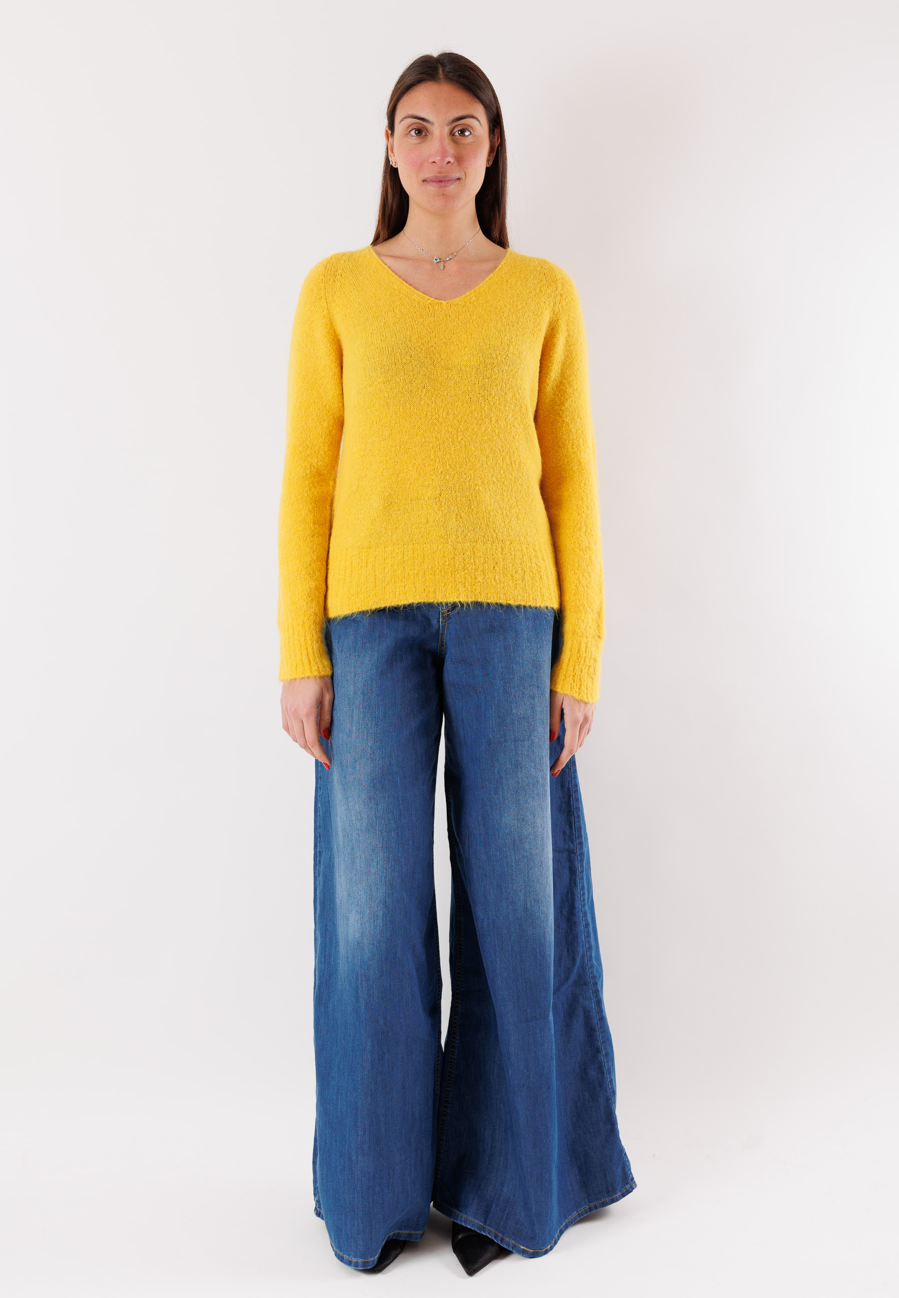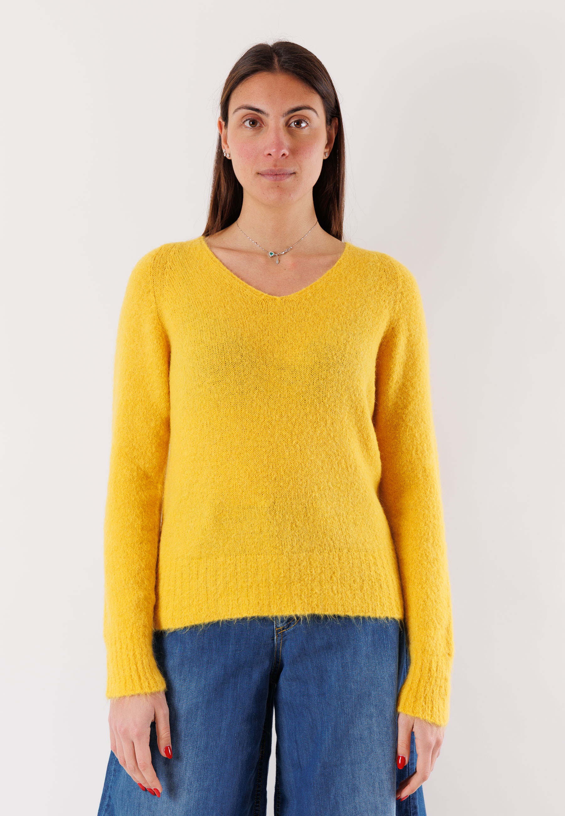 An essential and refined top for the cold season: this Kontatto V-neck sweater is made from a fine blend of yarns, including mohair and elastic fibers, for a soft and enveloping effect. The minimal and elegant design, combined with the regular cut, makes it extremely versatile and easy to pair with tailored trousers or denim. The ribbed detail at the hem and cuffs adds a touch of structure to the look. Available in one size, it comfortably adapts to different body shapes thanks to its comfortable and elastic fit.