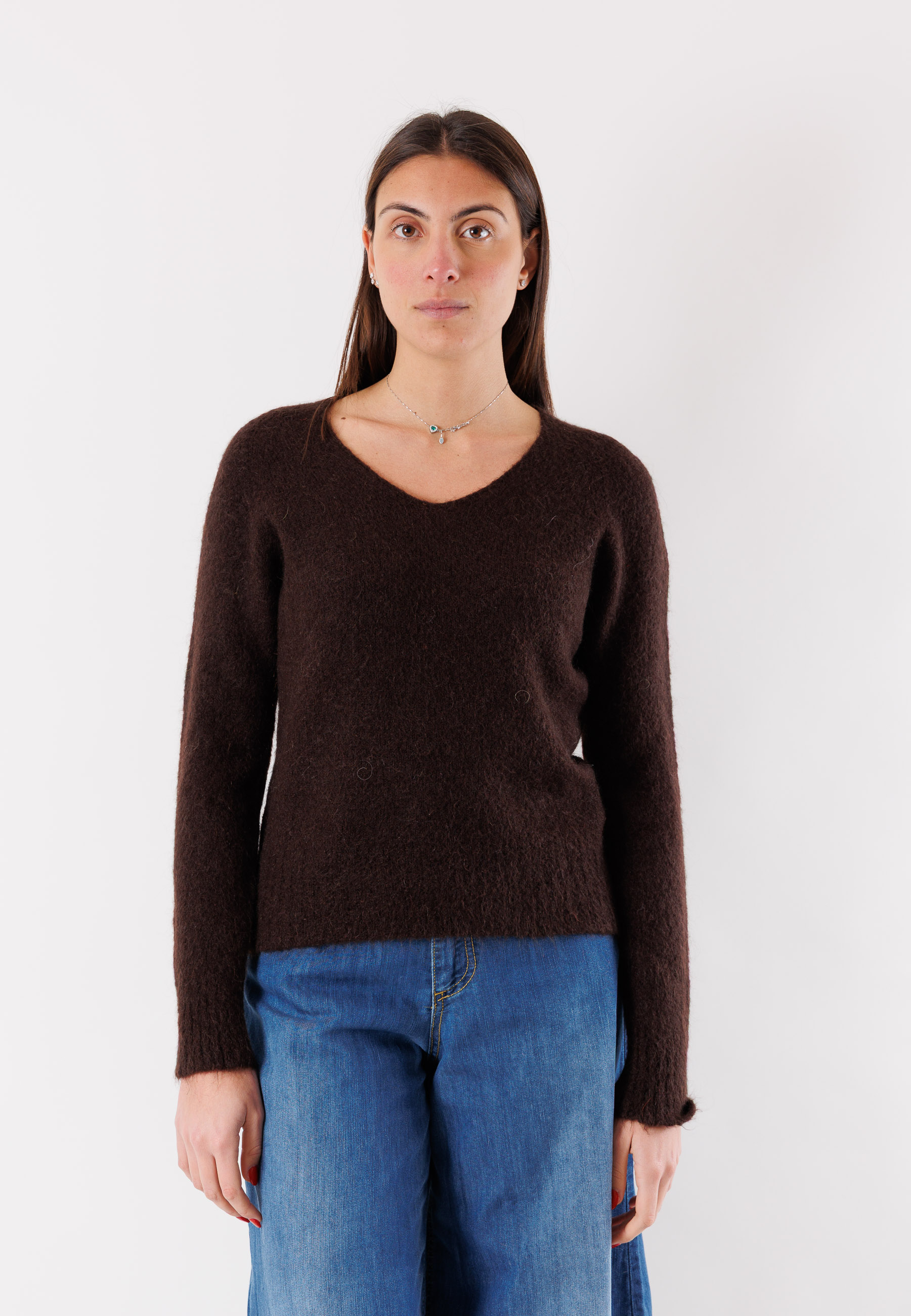 An essential and refined top for the cold season: this Kontatto V-neck sweater is made from a fine blend of yarns, including mohair and elastic fibers, for a soft and enveloping effect. The minimal and elegant design, combined with the regular cut, makes it extremely versatile and easy to pair with tailored trousers or denim. The ribbed detail at the hem and cuffs adds a touch of structure to the look. Available in one size, it comfortably adapts to different body shapes thanks to its comfortable and elastic fit.