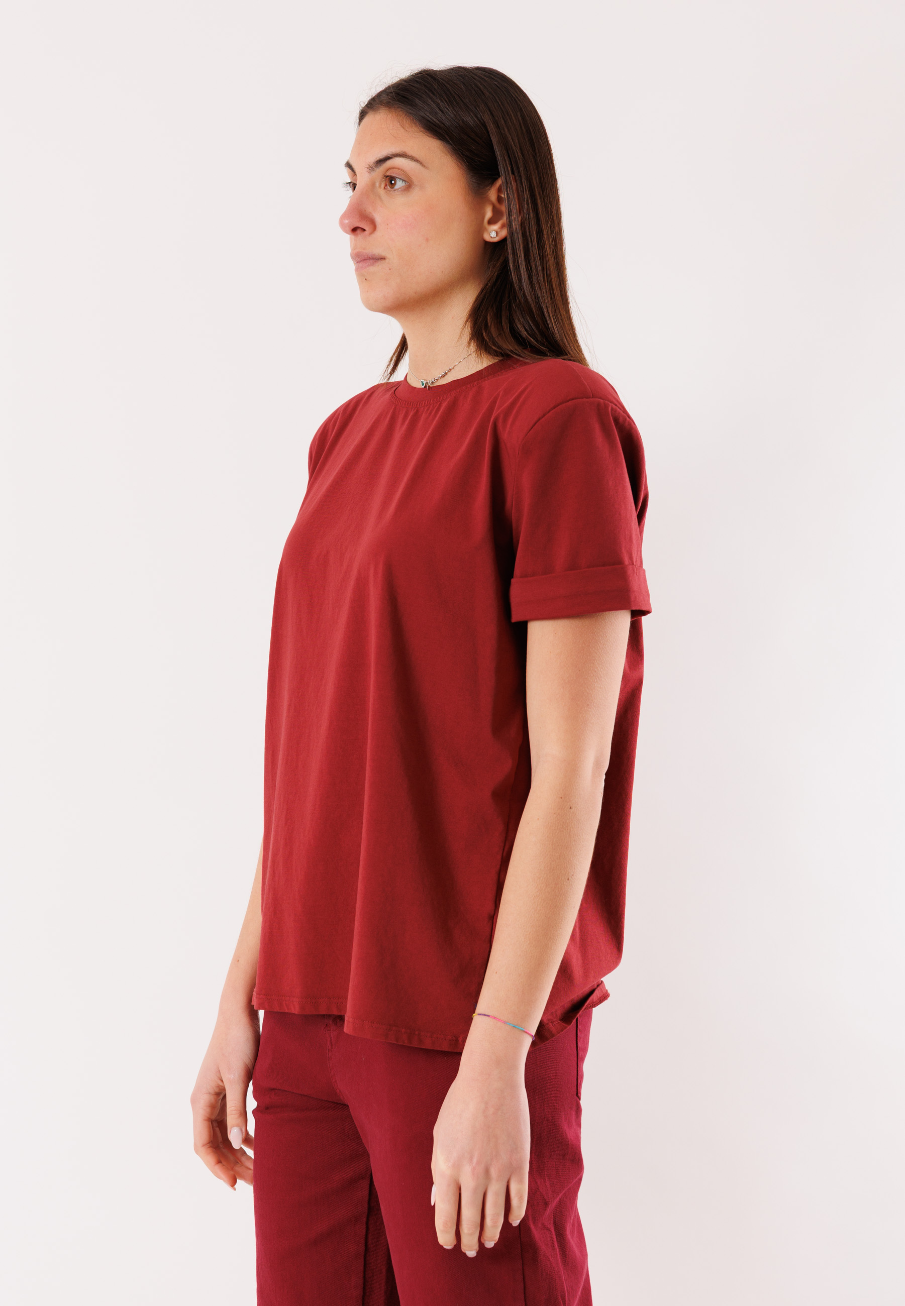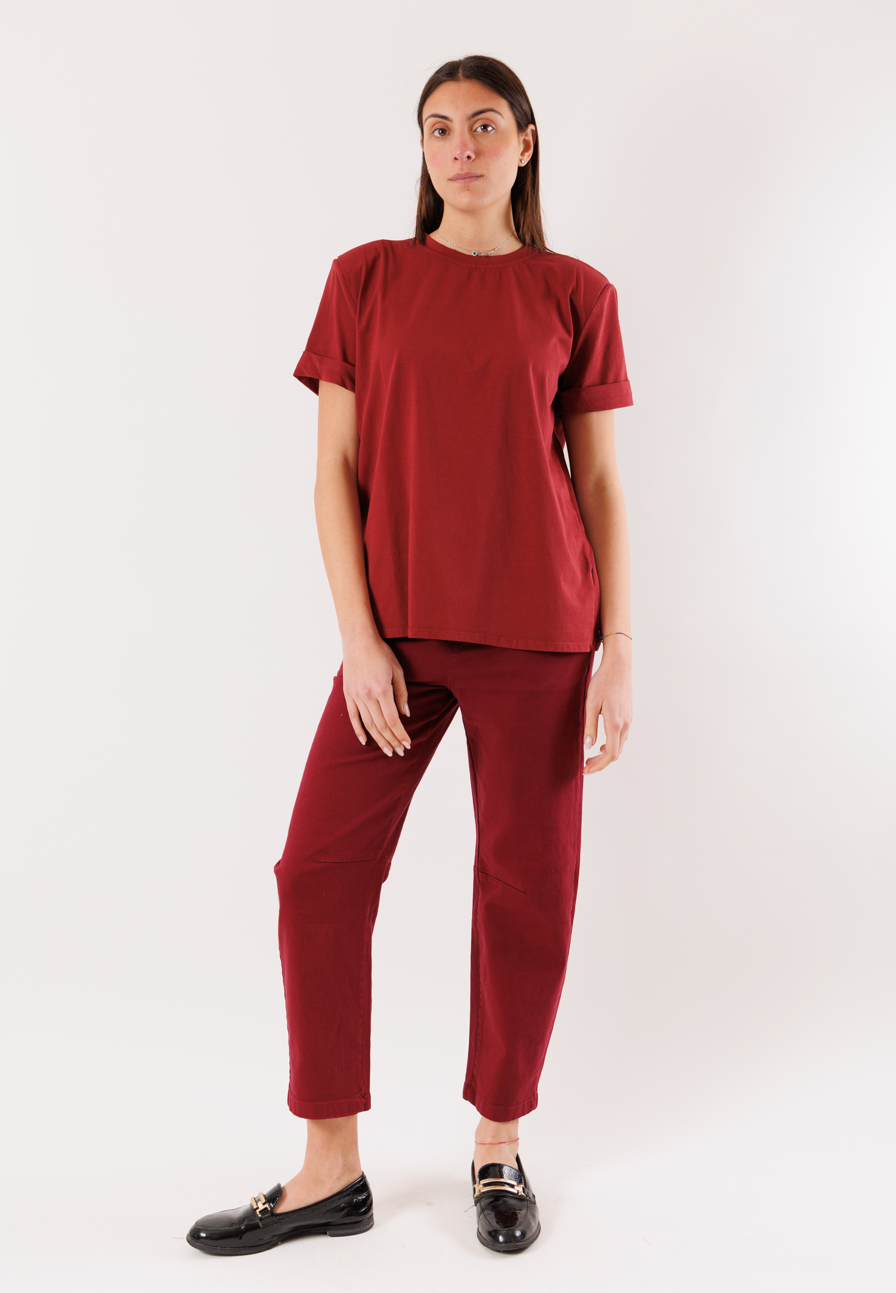 This Kontatto T-shirt with structured straps is a modern and versatile piece, perfect for creating minimal yet distinctive outfits. The design features a soft and slightly loose fit, ensuring comfort and a natural silhouette. The defined straps add shape to the silhouette, making the T-shirt ideal for casual, trendy looks or to wear under blazers and light jackets. The round neckline maintains a clean, easy-to-style look, while the stretch cotton fabric provides comfort, breathability, and freedom of movement. An essential piece for the season, perfect with jeans, high-waisted pants, shorts, or skirts for a polished and contemporary look. Composition: 90% Cotton, 10% Elastane.