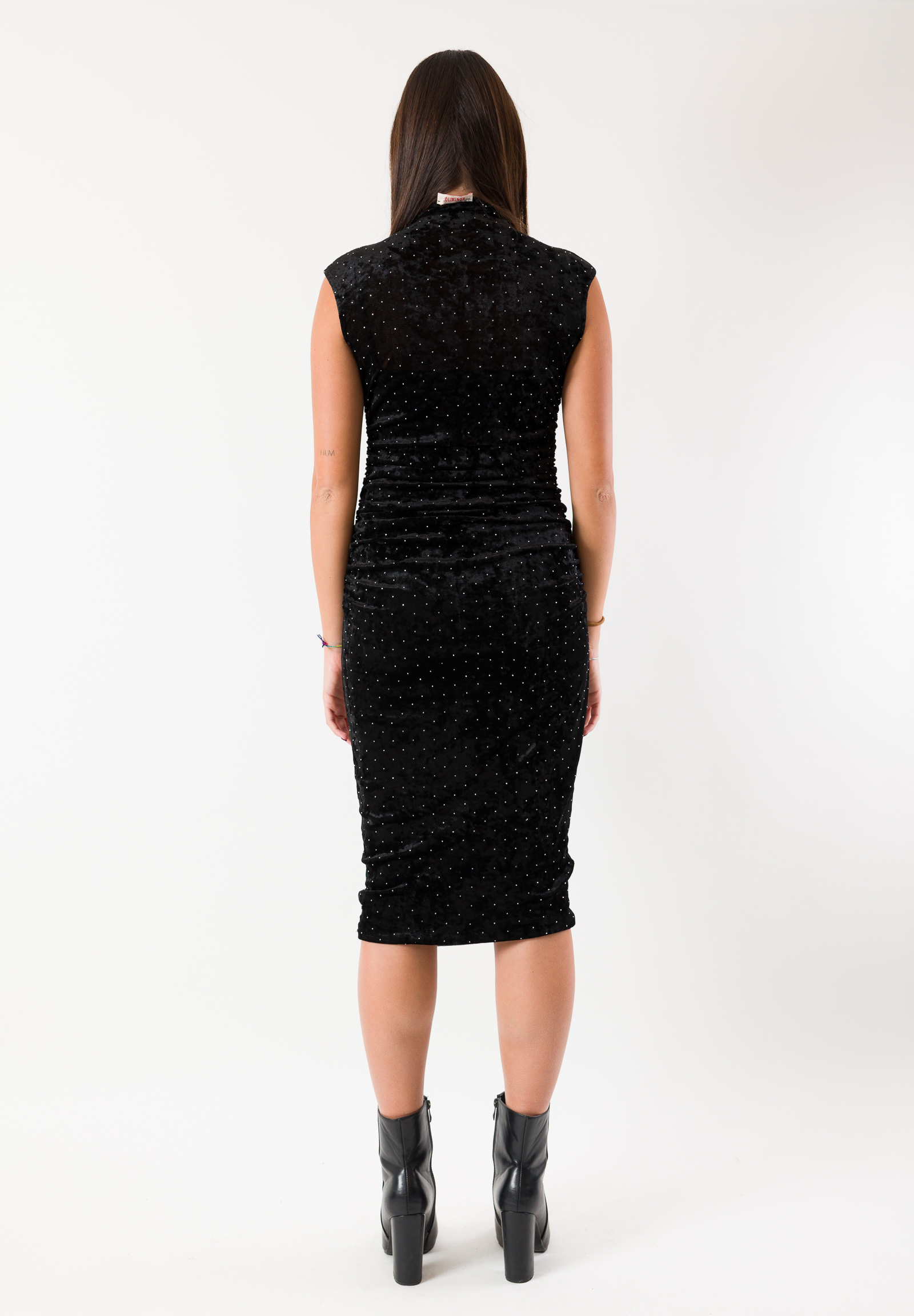 The fitted midi cut enhances the silhouette, while the soft and stretchy fabric ensures comfort all night long. The high neckline and structured shoulder add a sophisticated touch, enhanced by micro-strass that catch the light with every movement. Ideal for Christmas dinners, exclusive parties, and special evenings, it is the must-have dress for anyone who wants to shine in style during the holidays.