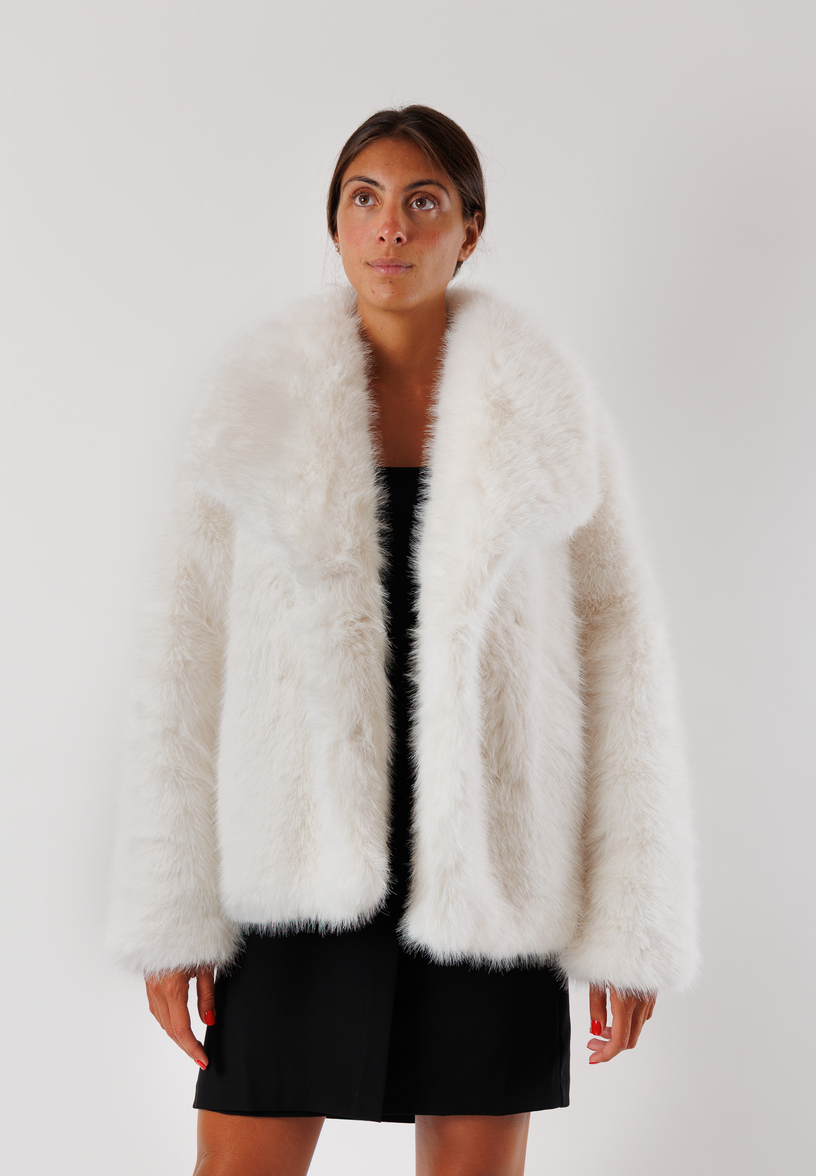 Feminine, elegant, and cruelty-free: this faux fur coat by Kontatto is a must-have of the season for those who love to stand out in style. The short model with a wide and enveloping collar, long sleeves, and a soft line adds volume and refinement to every outfit. Made of ultra-soft faux fur fabric, this jacket is perfect for special occasions but also for chic everyday looks. A sophisticated, warm, and comfortable piece to face winter with class.