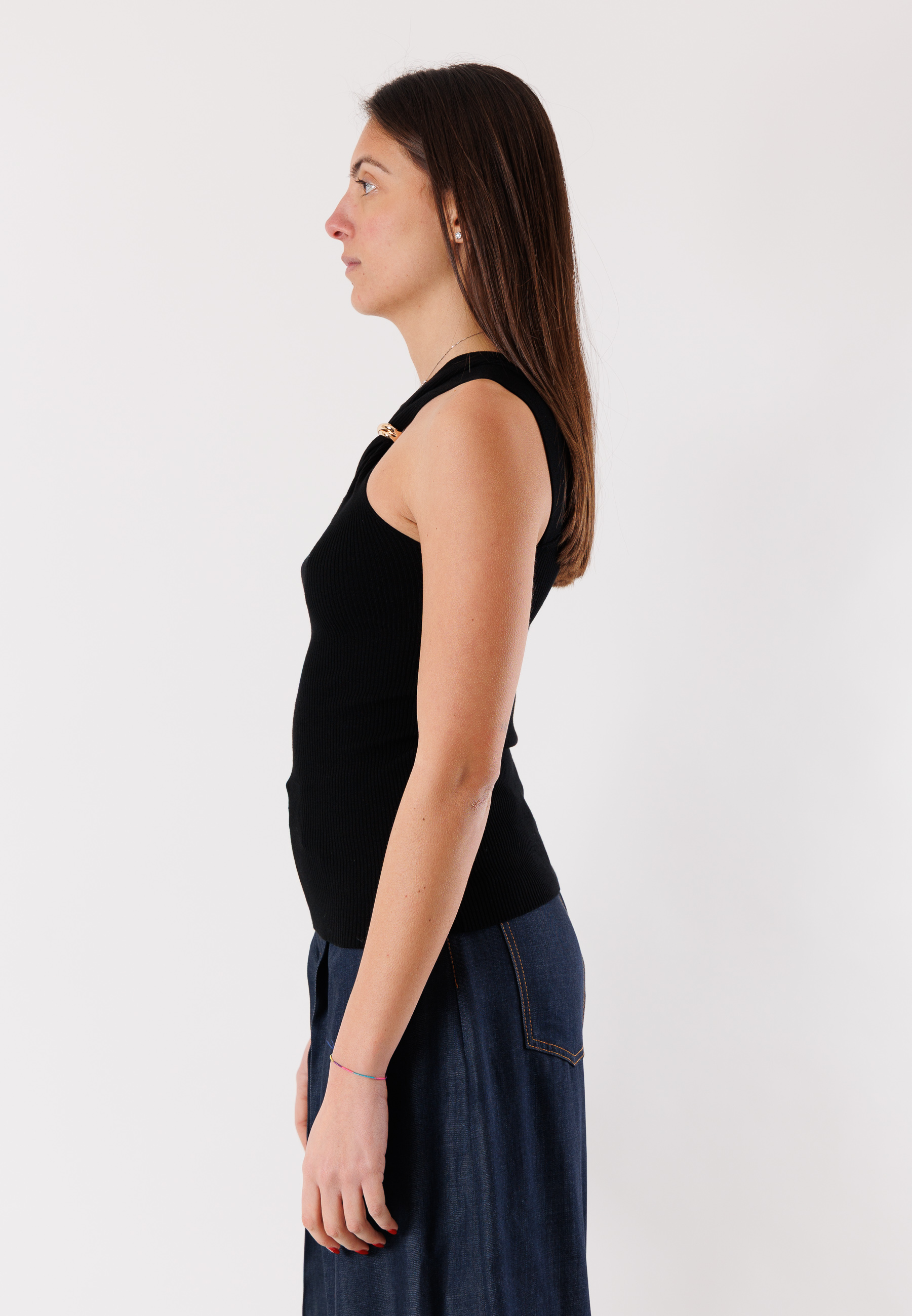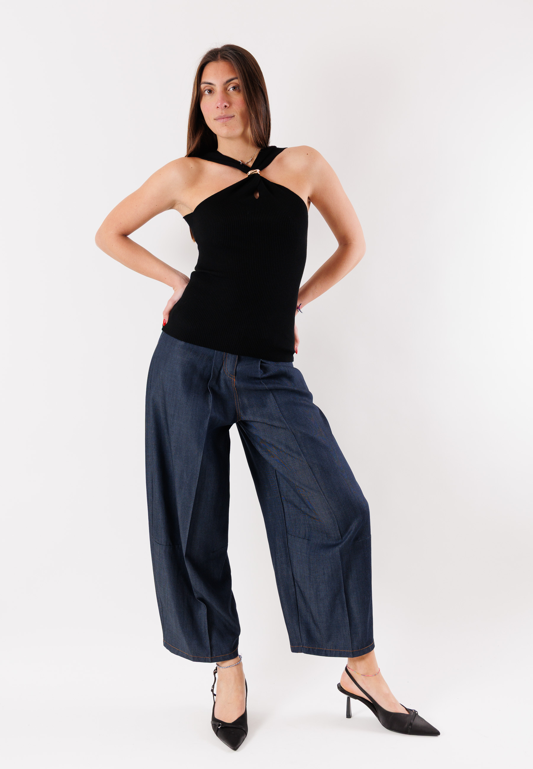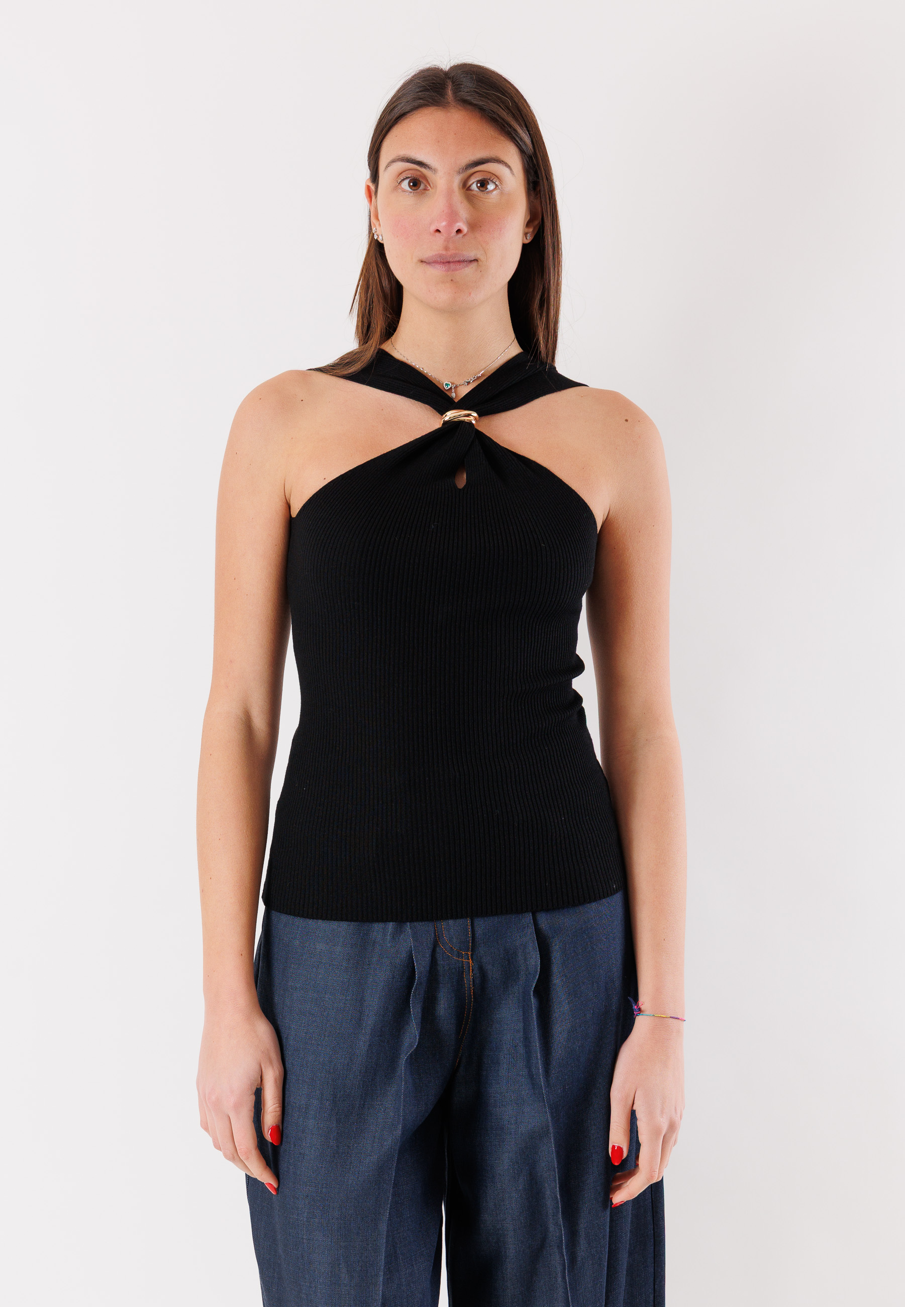 Women's Kontatto top with a feminine and contemporary design, featuring an elegant halter neckline with a front crossover that enhances the upper bust and adds personality to the look. The fitted line highlights the silhouette while maintaining a comfortable fit.