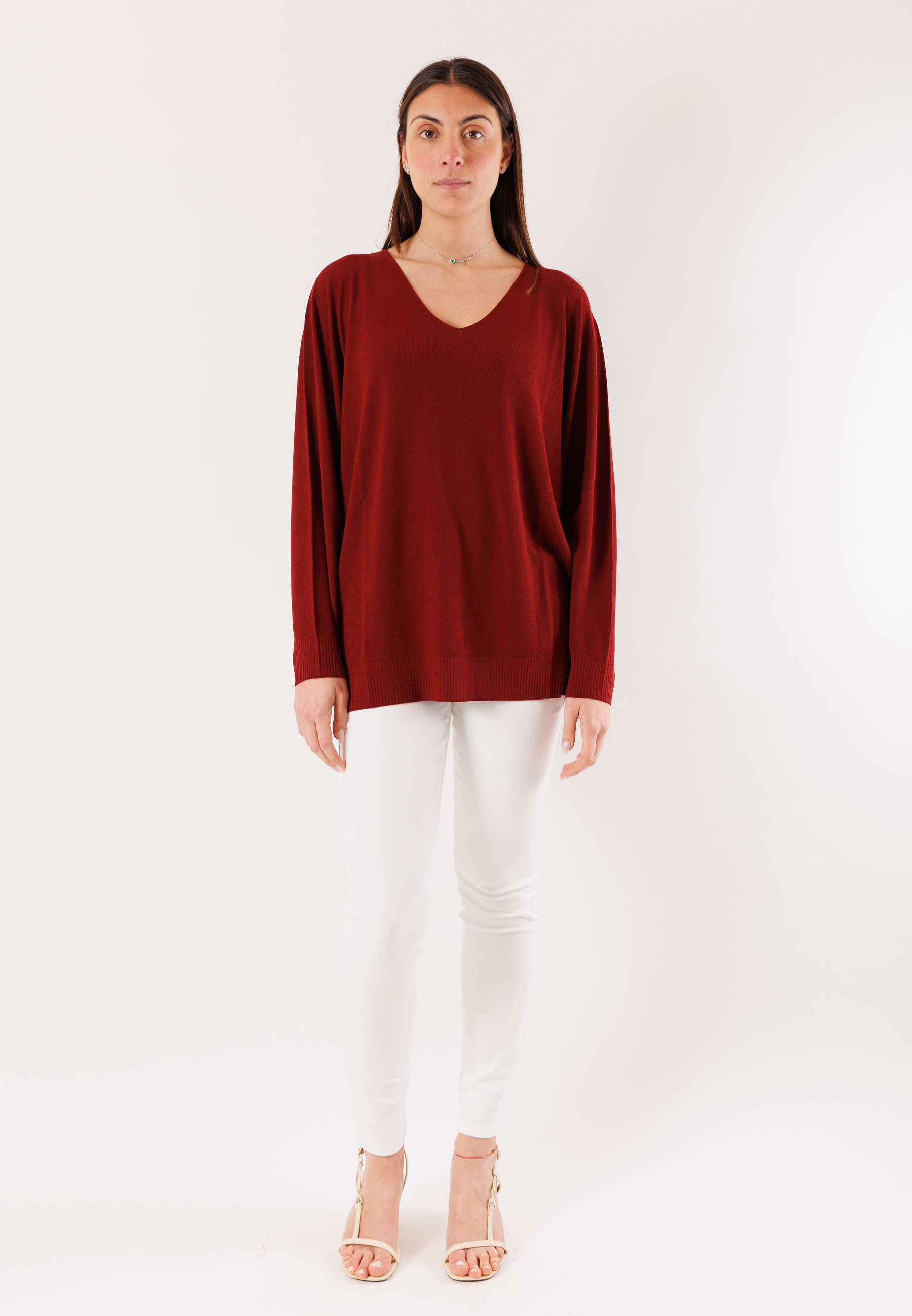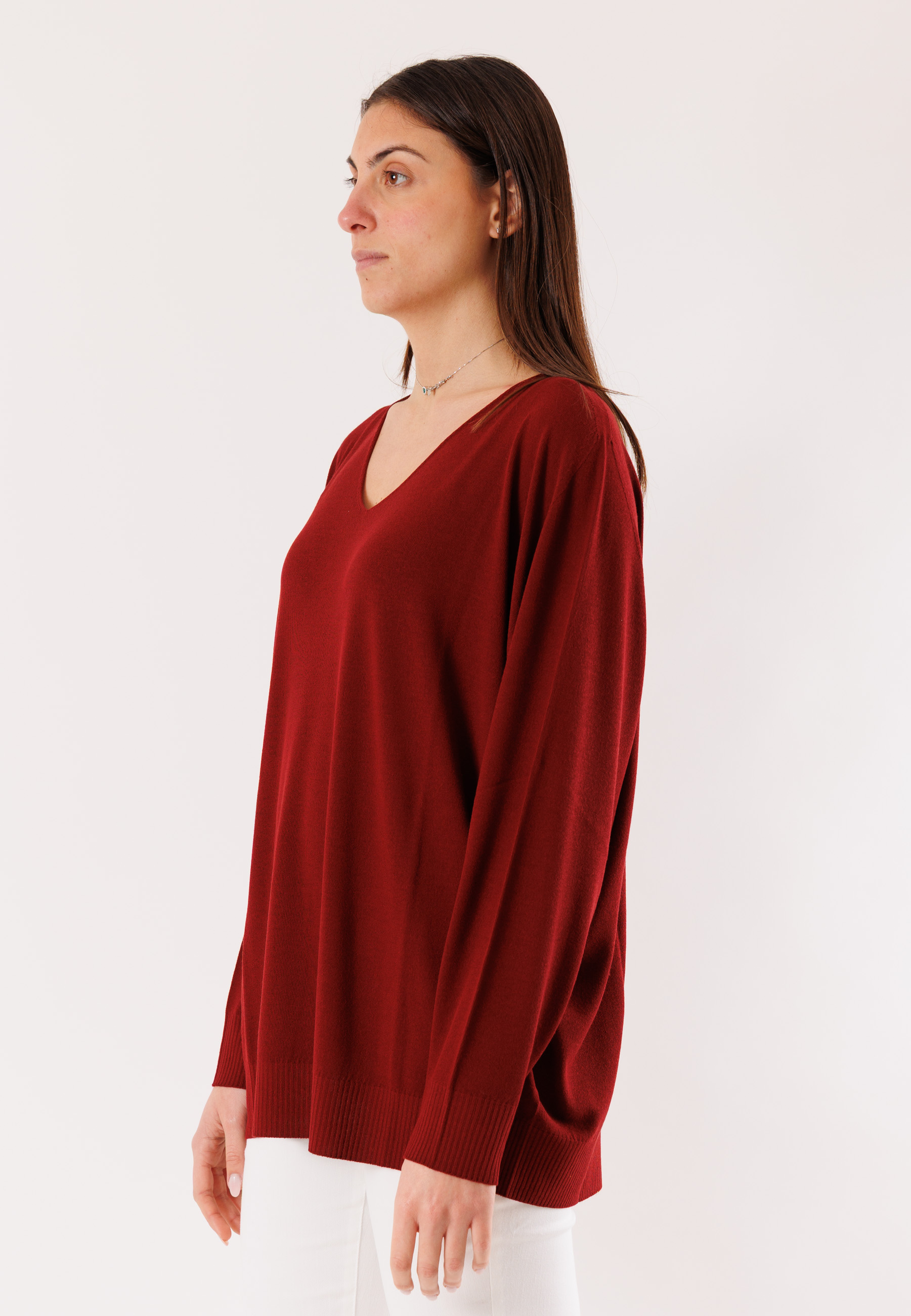 This Kontatto sweater is an essential and versatile piece, ideal for completing casual and refined looks with ease. The design features a soft V-neck, perfect for elongating the neckline and highlighting the upper part of the garment. The loose fit and slightly dropped long sleeves offer comfort and a relaxed silhouette while maintaining a polished, contemporary style.