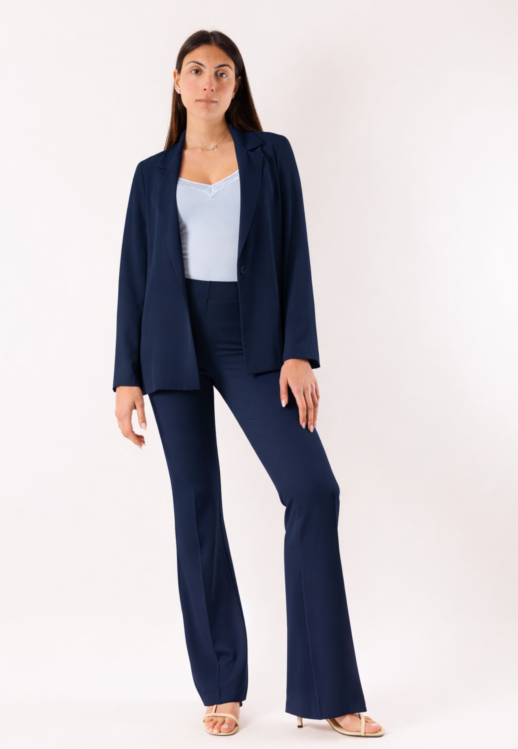 The Mesange flared pants Made in Italy are a refined and contemporary garment, designed to enhance the silhouette with a long and slender line. Made from a technical fabric composed of 96% polyester and 4% elastane, they offer an ideal mix of comfort, elasticity, and durability. The material gently follows movements, ensuring a comfortable fit and a consistently neat look.