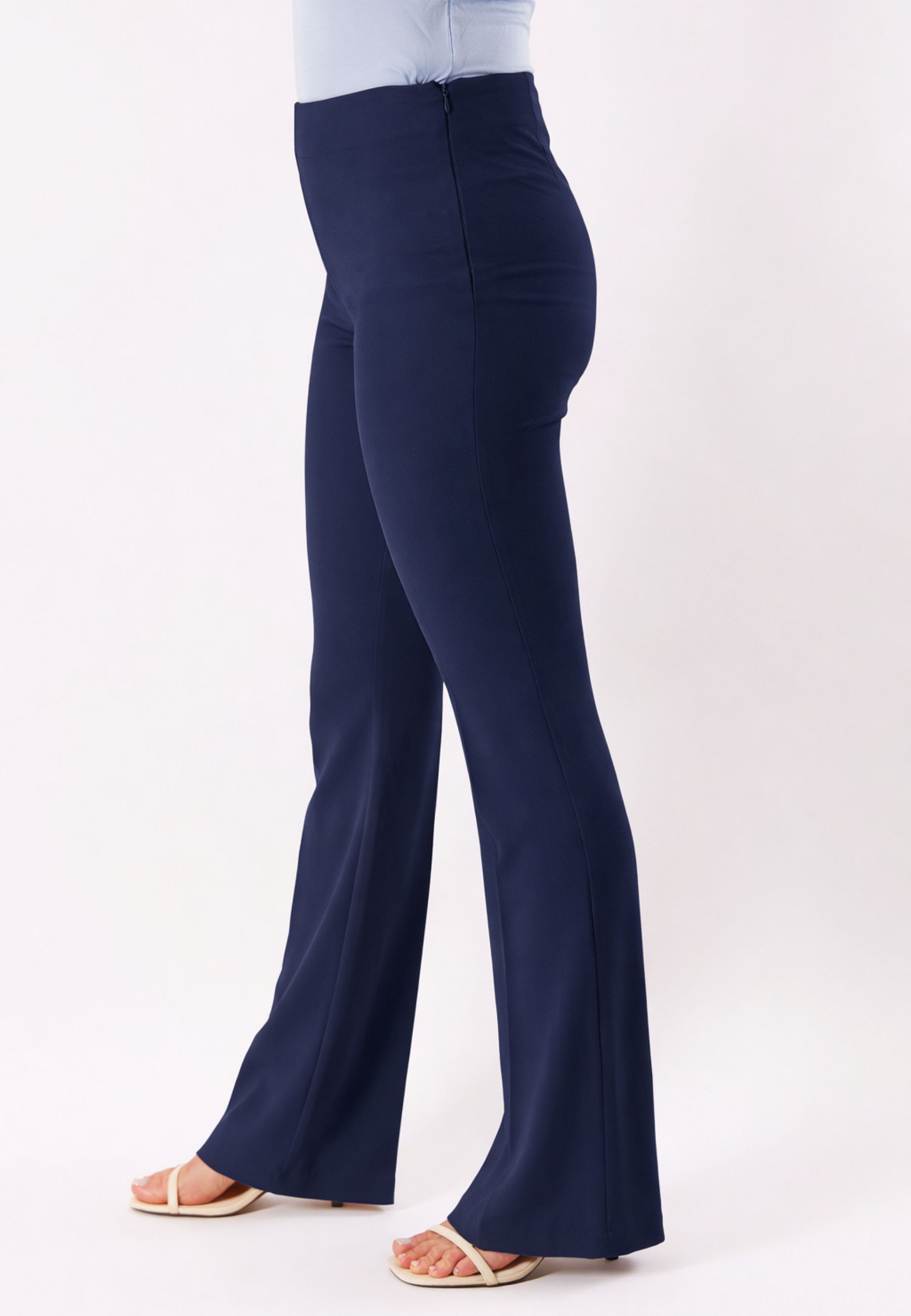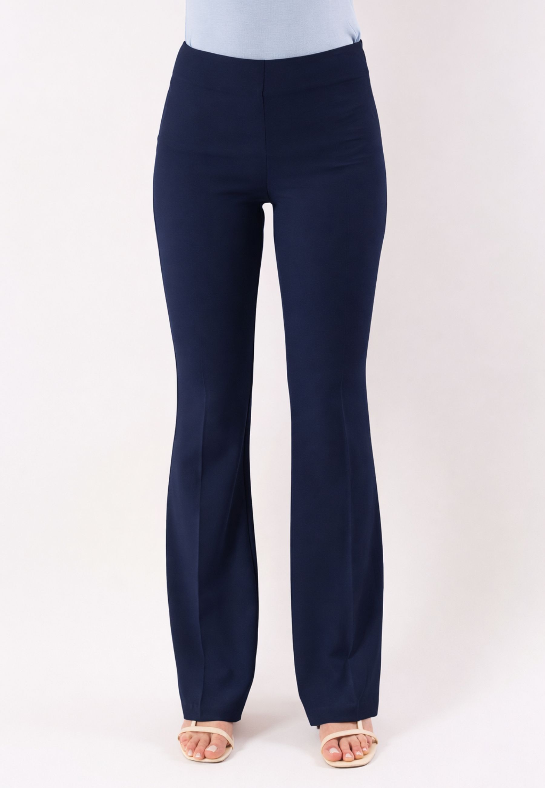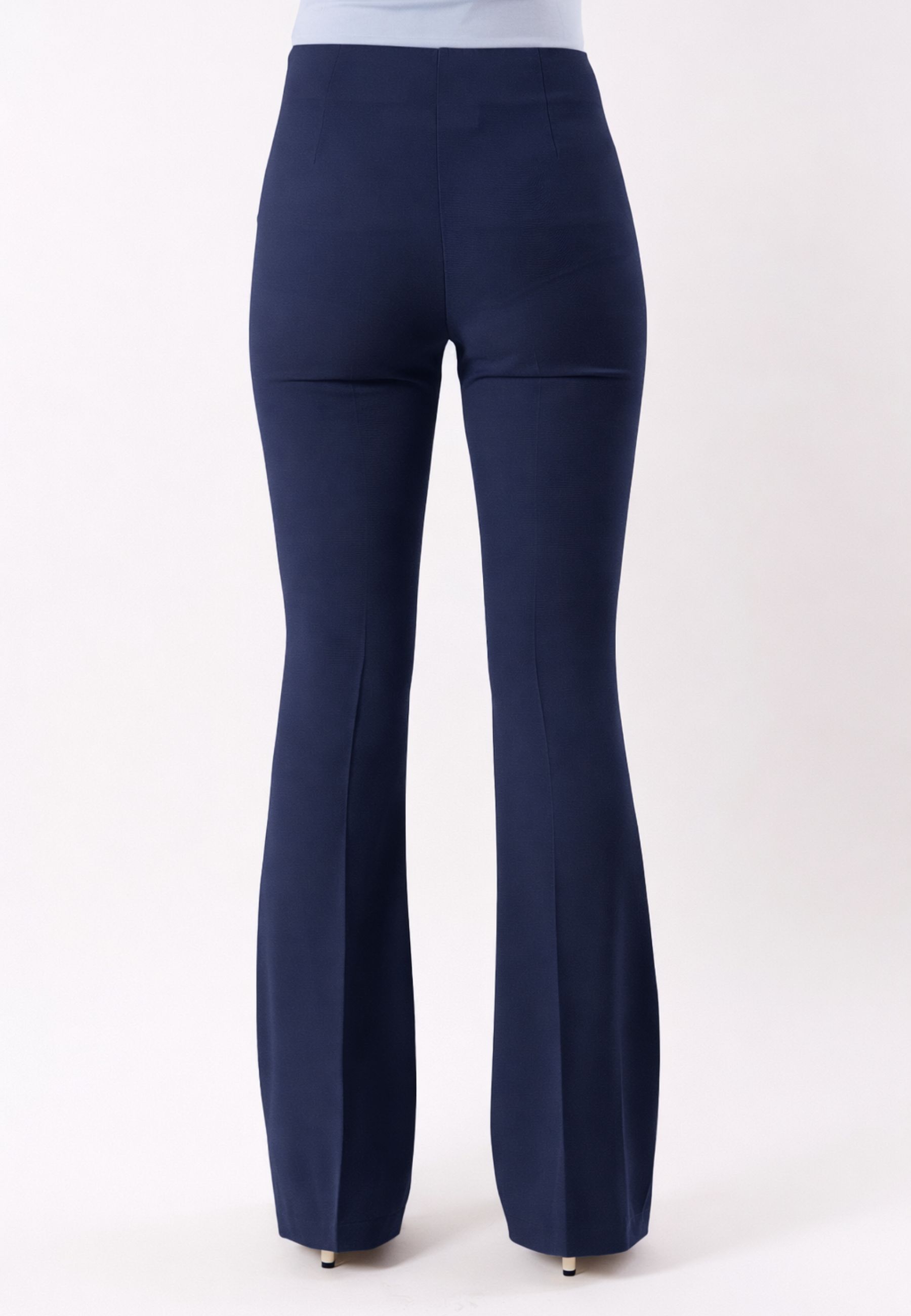 The design features a flared leg, perfect for creating a harmonious and elongated figure, while the smooth waistband without intrusive seams gives a clean and minimalist effect, ideal for pairing with fitted tops, elegant shirts, or soft sweaters. The fall of the fabric is fluid and sophisticated, making these pants suitable for both formal looks and casual chic outfits.