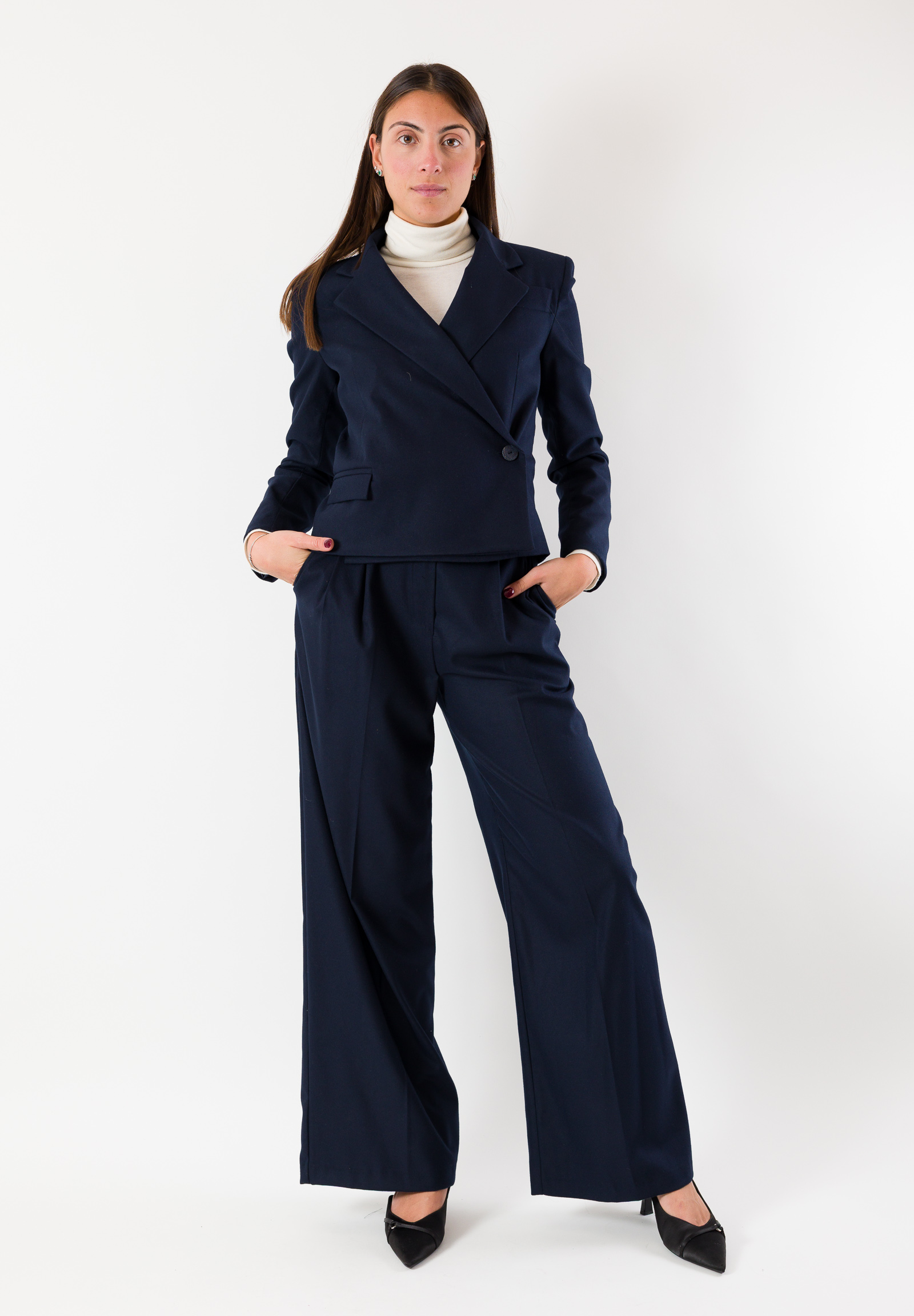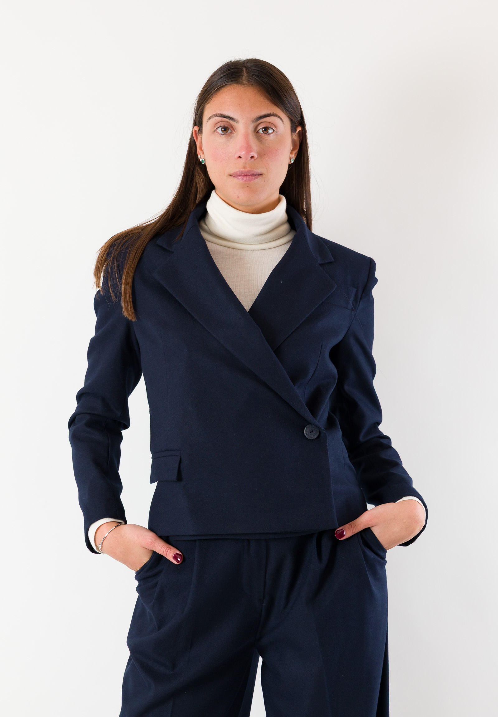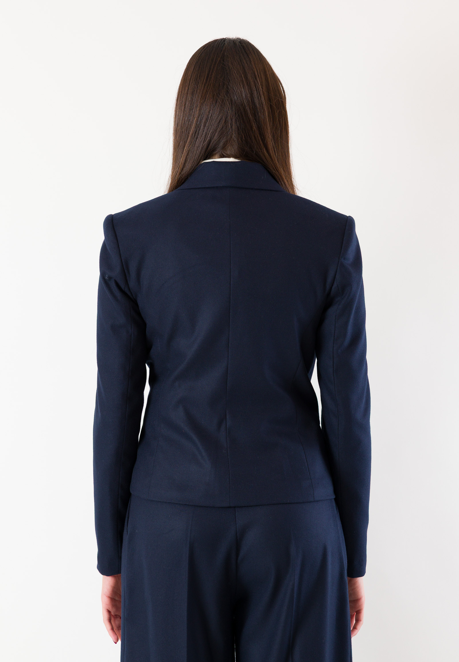 The blue melange flannel fabric gives a sophisticated and versatile look, ideal for both professional attire and more casual outfits. The double-breasted design with structured lapels enhances the silhouette, while the slightly tailored waist ensures a feminine and harmonious line.