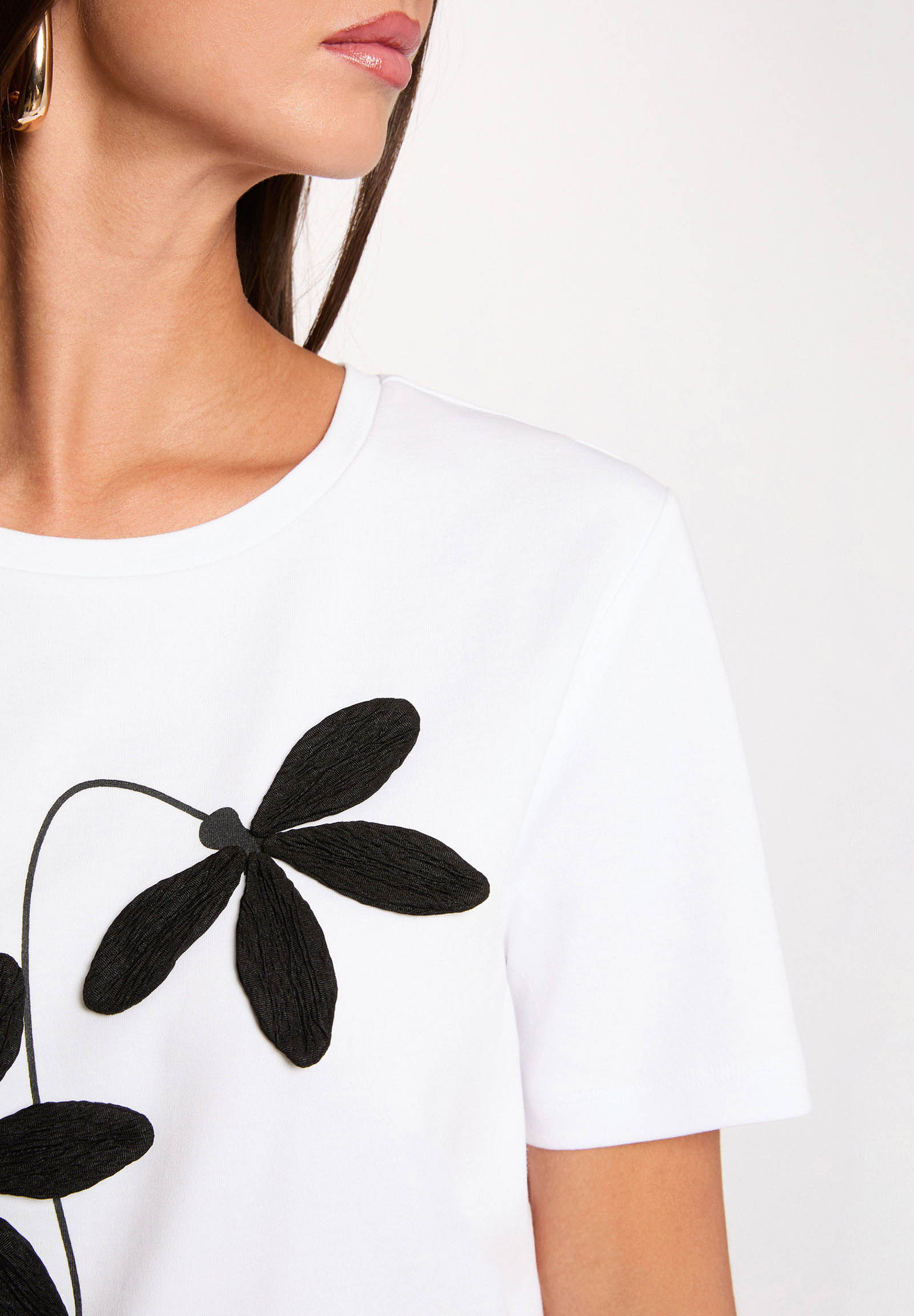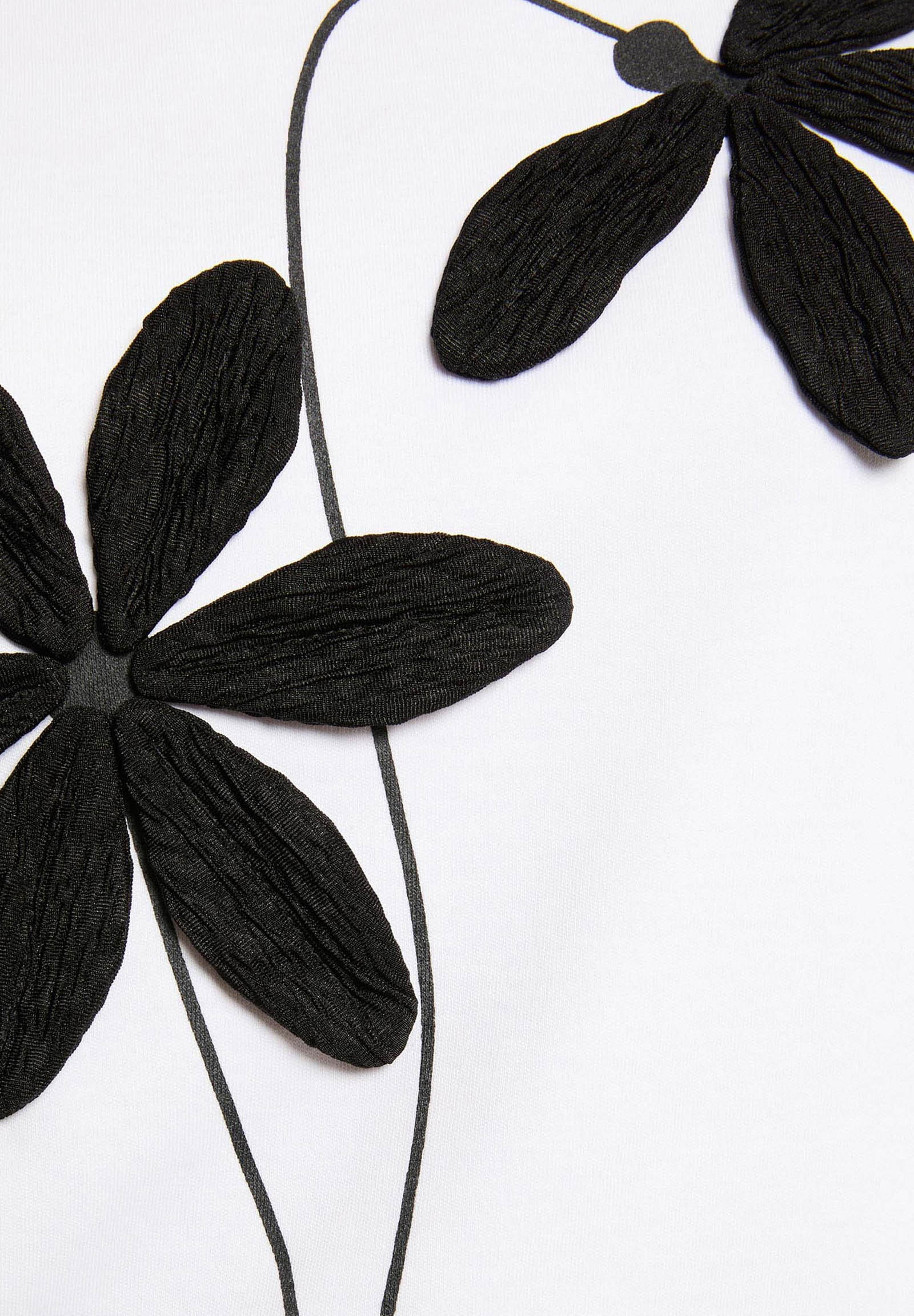The design is enhanced by a contrasting floral pattern, with a modern and graphic taste, adding character to the look while maintaining minimal elegance. The simple cut with a round neckline and short sleeves makes it perfect for casual chic outfits, ideal to pair with jeans, skirts, or tailored trousers.