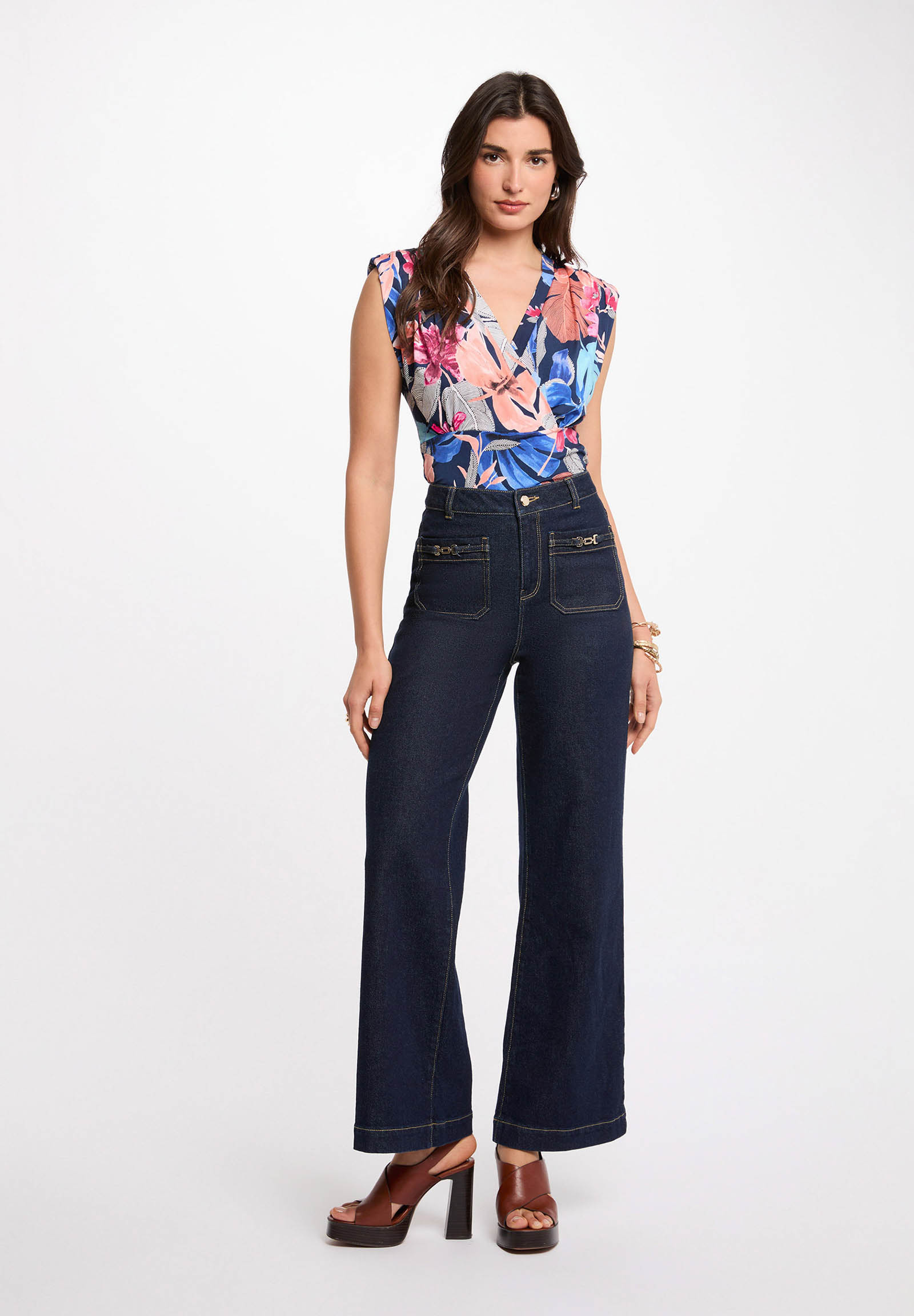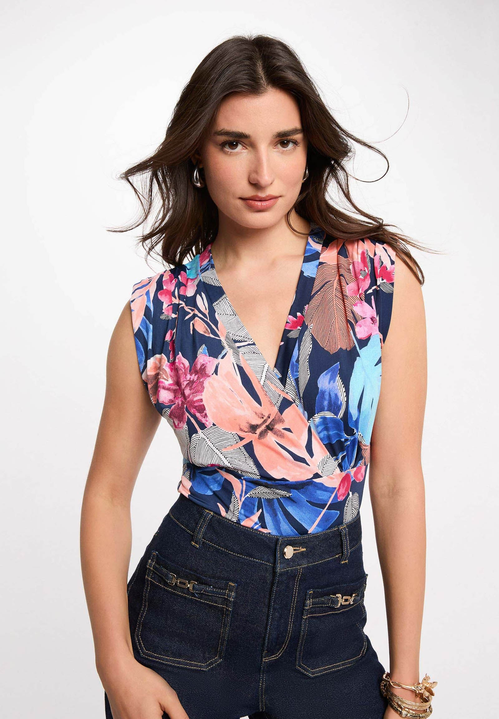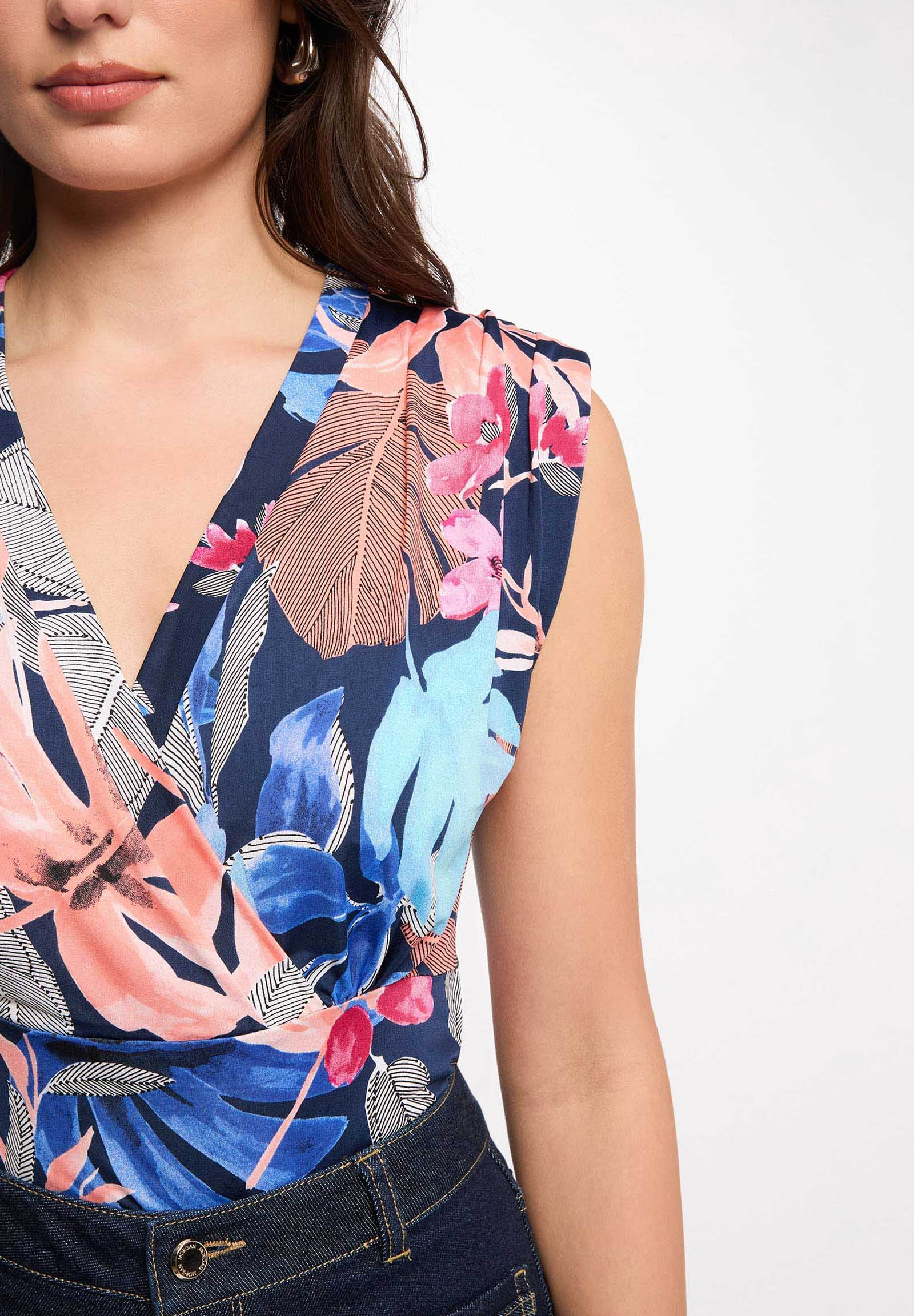 The exclusive pattern adds character and style to the garment, making it perfect for dynamic and contemporary outfits. The crossed neckline highlights the décolleté, while the regular cut ensures elegance and practicality for everyday wear.