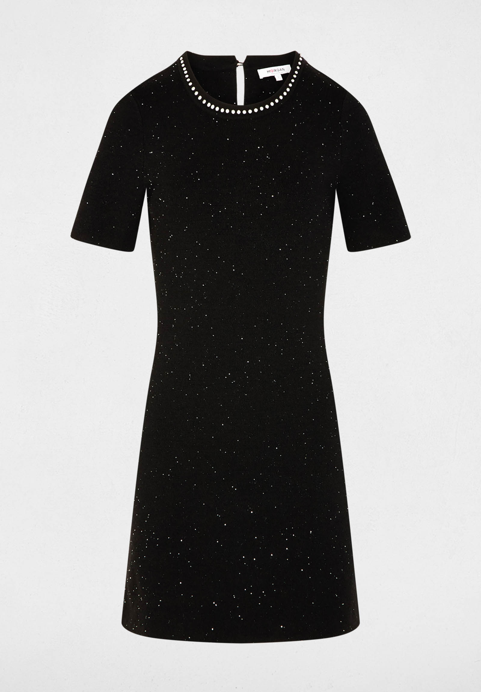 Short knitted dress with shiny details, perfect for an elegant and contemporary style. The fitted silhouette enhances the figure, while the soft and slightly stretchy fabric ensures comfort and freedom of movement. Ideal for the autumn-winter season, this dress combines sophistication and modernity with a sparkling touch that makes it suitable for both day and evening wear. Made from polyester, ECOVERO viscose, and polyamide, it combines sustainability and quality for a timeless piece.