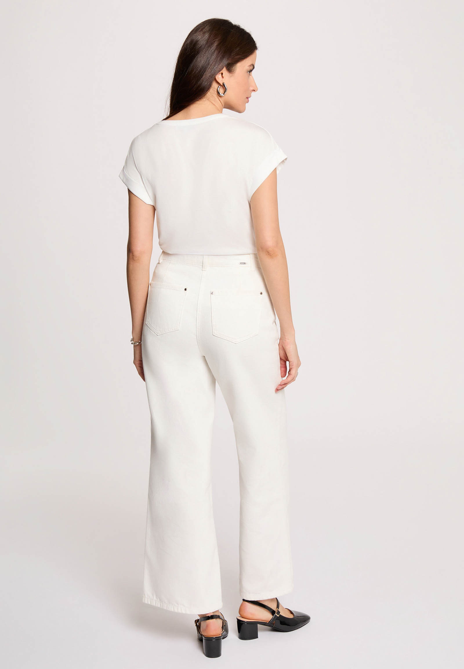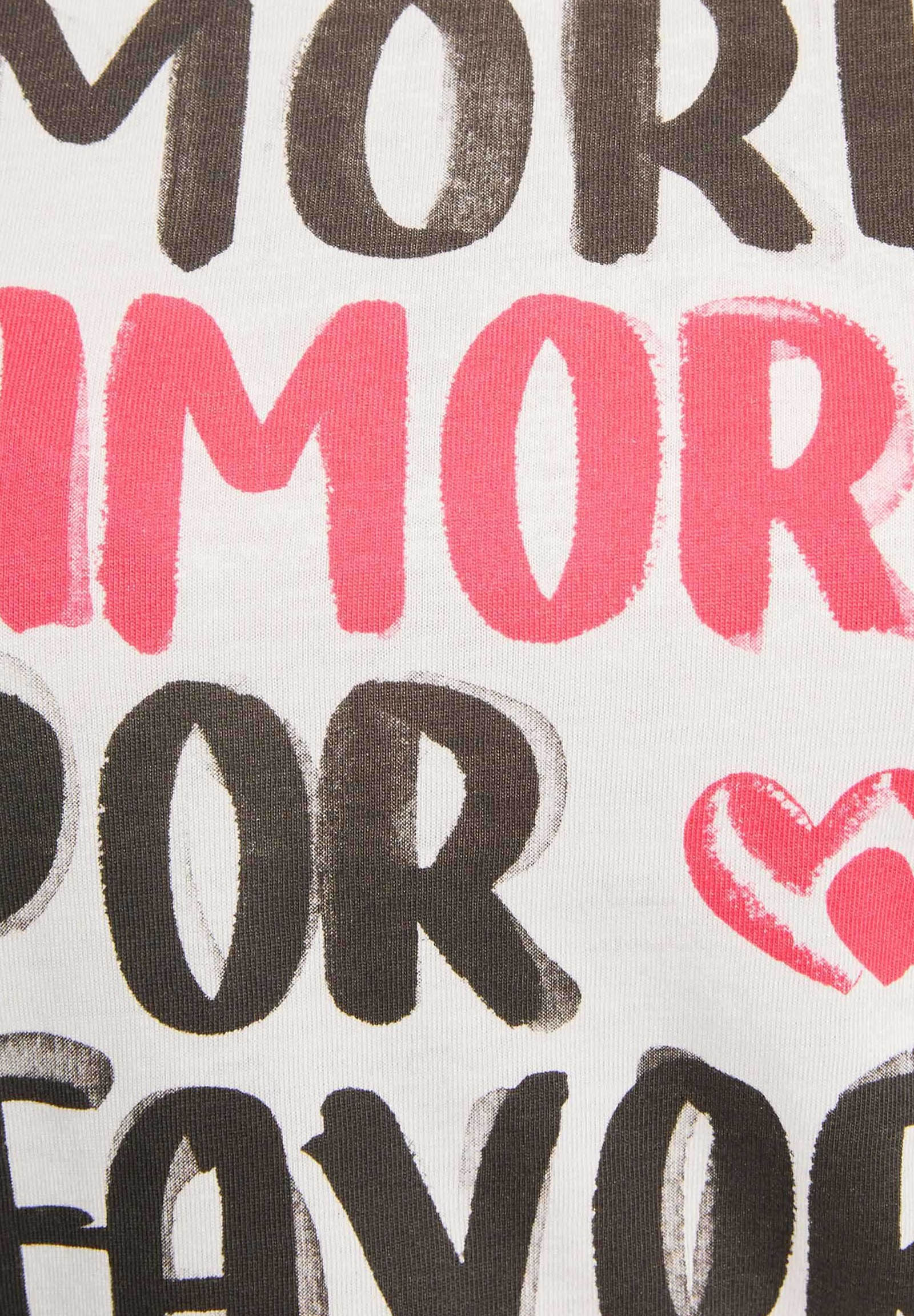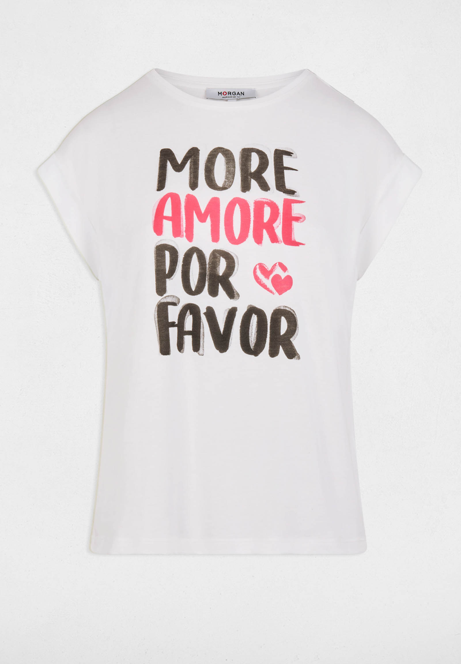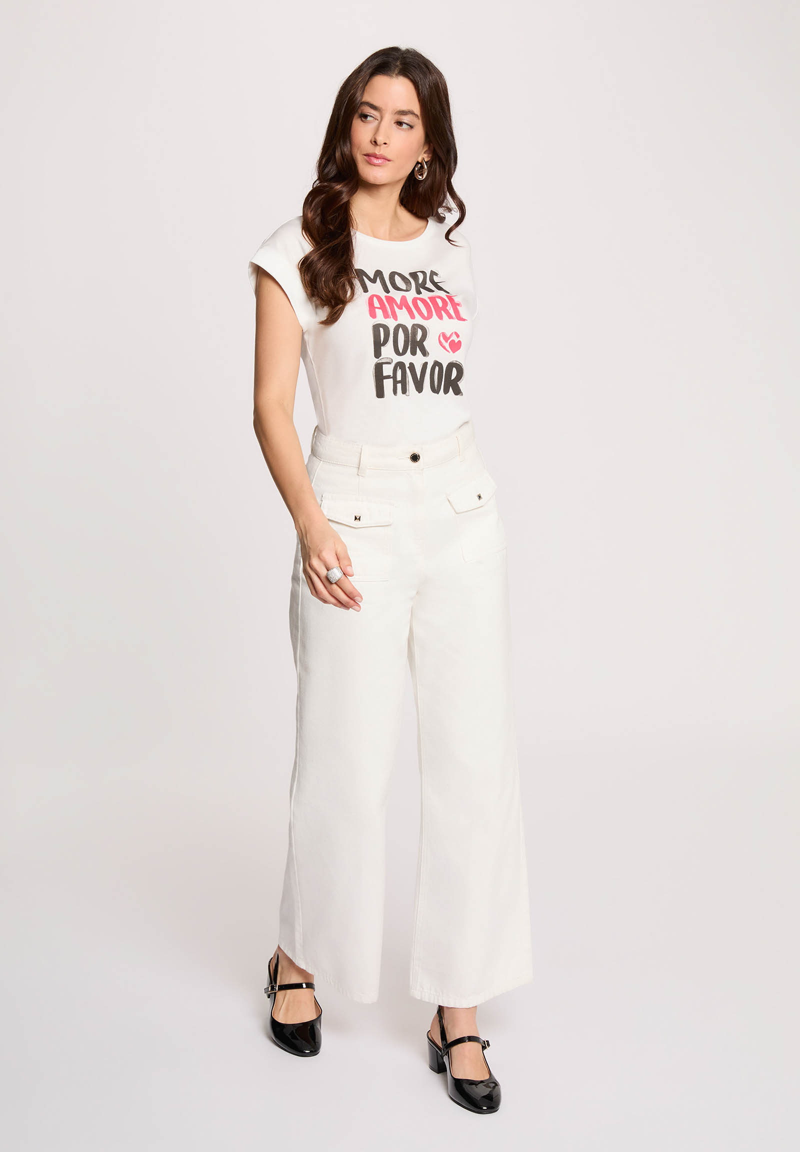 The women's T-shirt by Morgan De Toi is a fresh, modern piece with a strong fashion character, ideal for enhancing any everyday outfit with a touch of personality. Made from 50% cotton and 50% modal, it offers a feeling of extreme softness on the skin, excellent breathability, and long-lasting comfort throughout the day. The lightweight and fluid fabric ensures a natural and pleasant fit, perfect for the spring and summer seasons. The front print More Amore Por Favor gives it an ironic and romantic vibe, making this T-shirt a true centerpiece of any look. The feminine and versatile cut easily pairs with jeans, skirts, shorts, or dressy trousers, creating casual chic or refined urban outfits. Ideal for leisure, shopping, or outings with friends, this T-shirt is a must-have in the female wardrobe. It combines quality materials, contemporary style, and attention to comfort, all in true Morgan De Toi fashion.