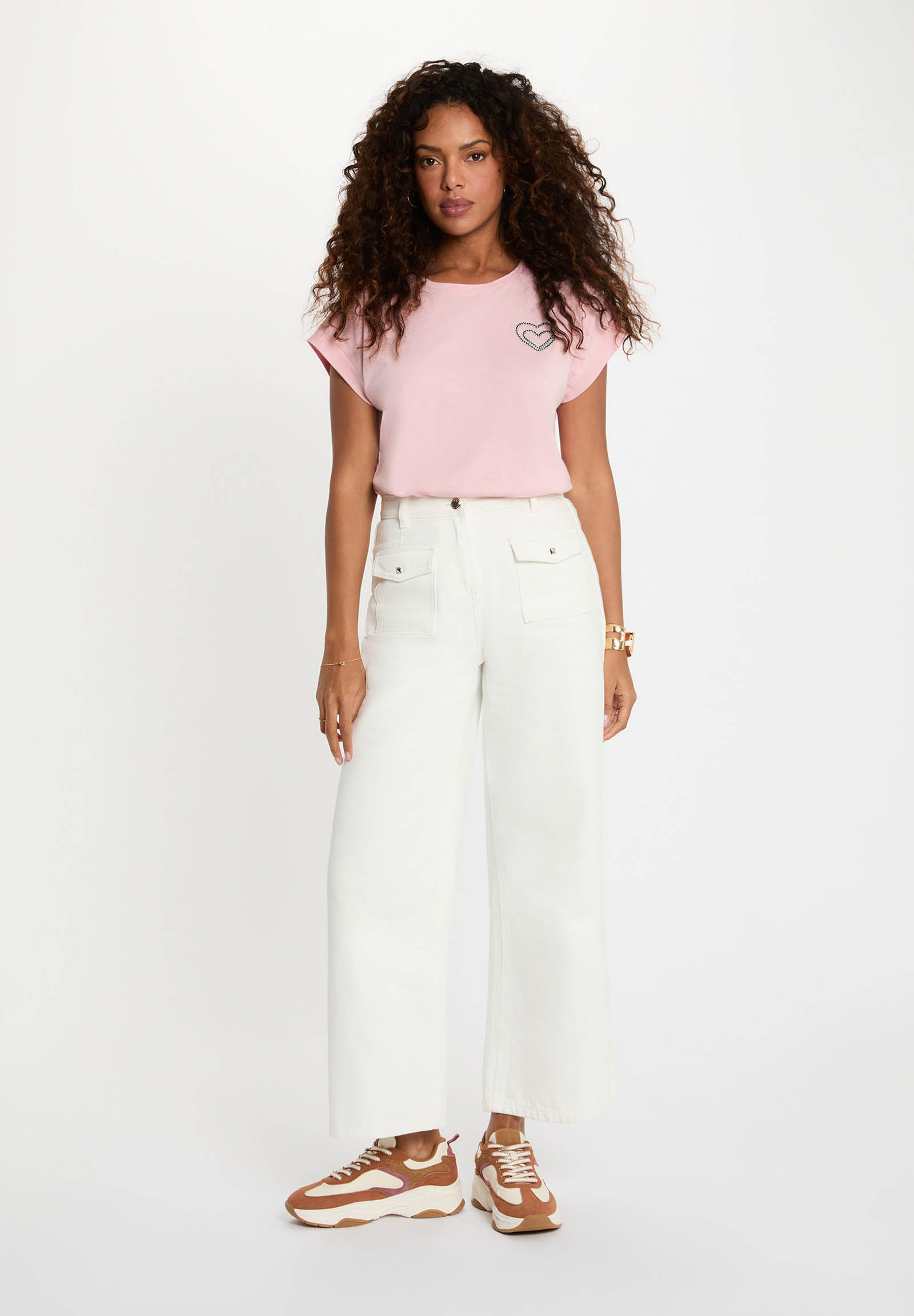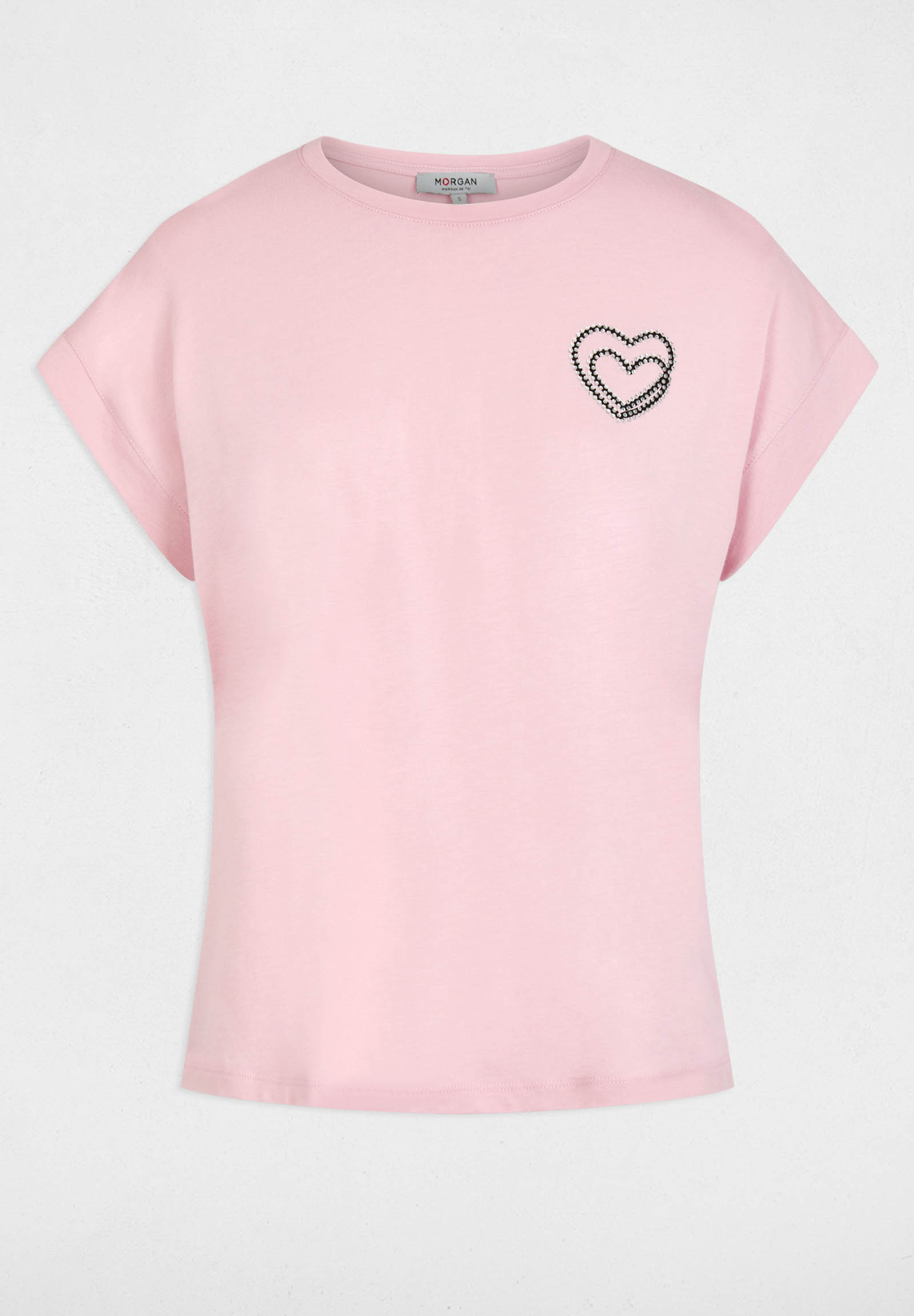 The women's T-shirt by Morgan De Toi is an essential wardrobe piece reimagined with a refined and feminine detail. The clean design is enhanced by the small heart applique on the chest, adding a romantic and elegant touch to the look.