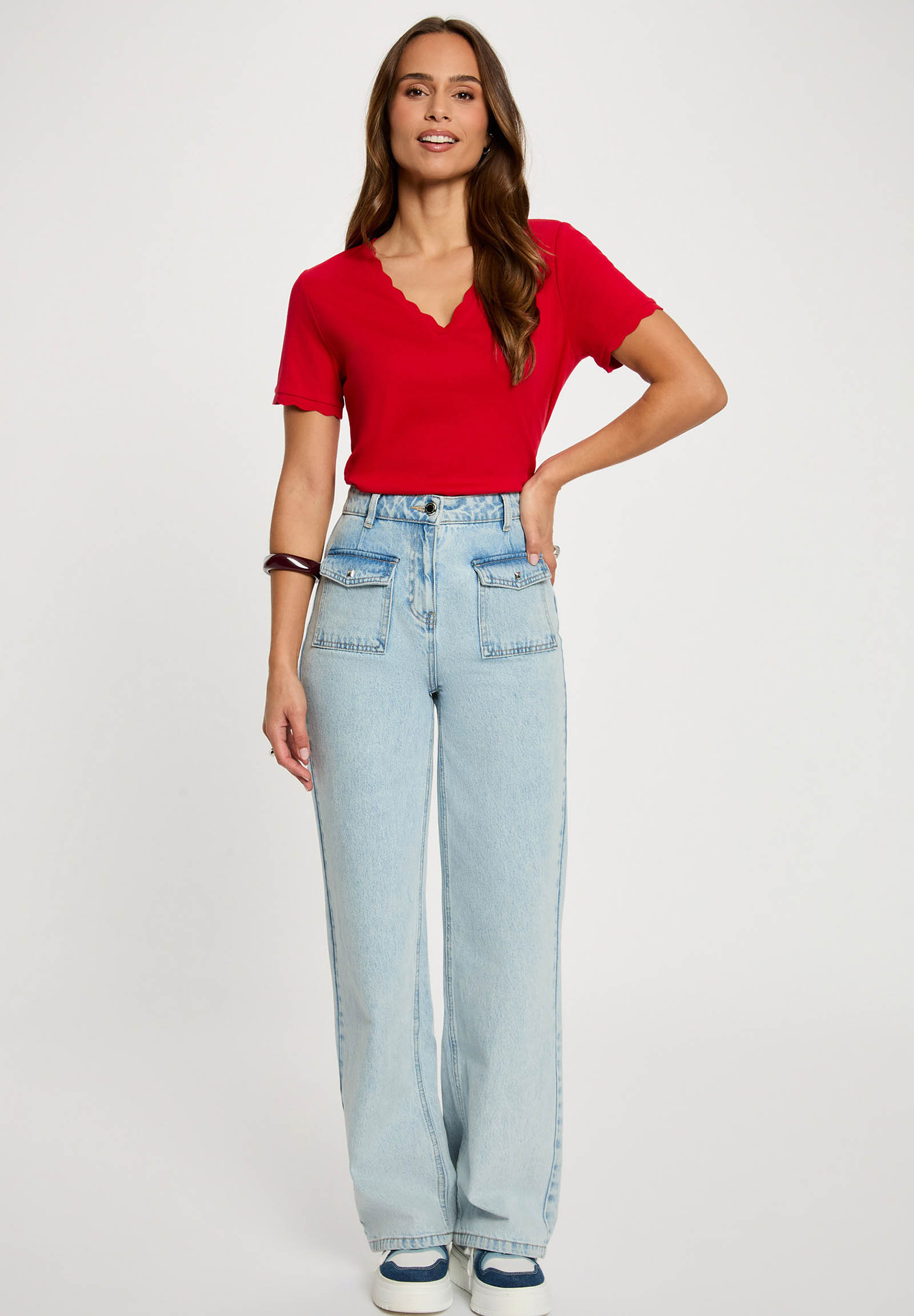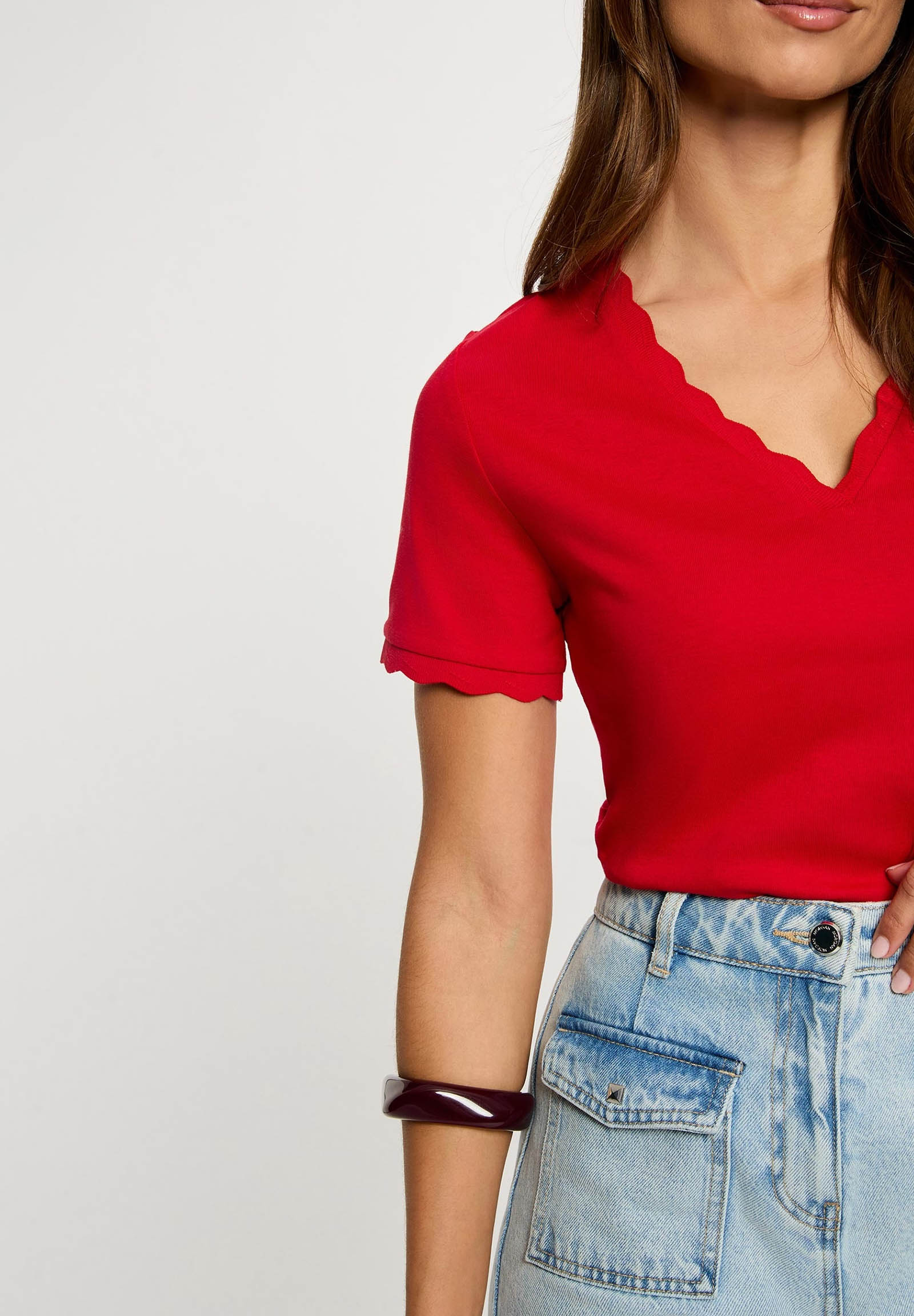 The model features a V-neck with a delicately finished edge and short sleeves, enhancing the silhouette with simplicity and elegance. The slightly fitted cut makes this T-shirt perfect for both casual looks and more polished outfits.