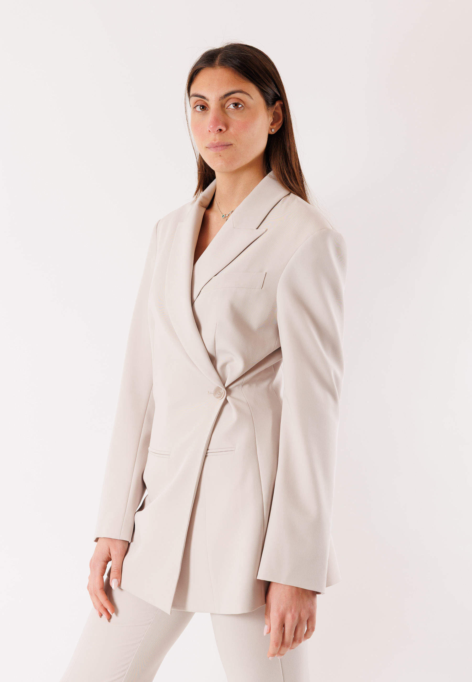 The refined cut with a crossover closure and structured line enhances the female silhouette, giving a professional and polished appearance. The mixed fabric ensures durability, softness, and impeccable performance over time, maintaining its shape even after numerous wears.