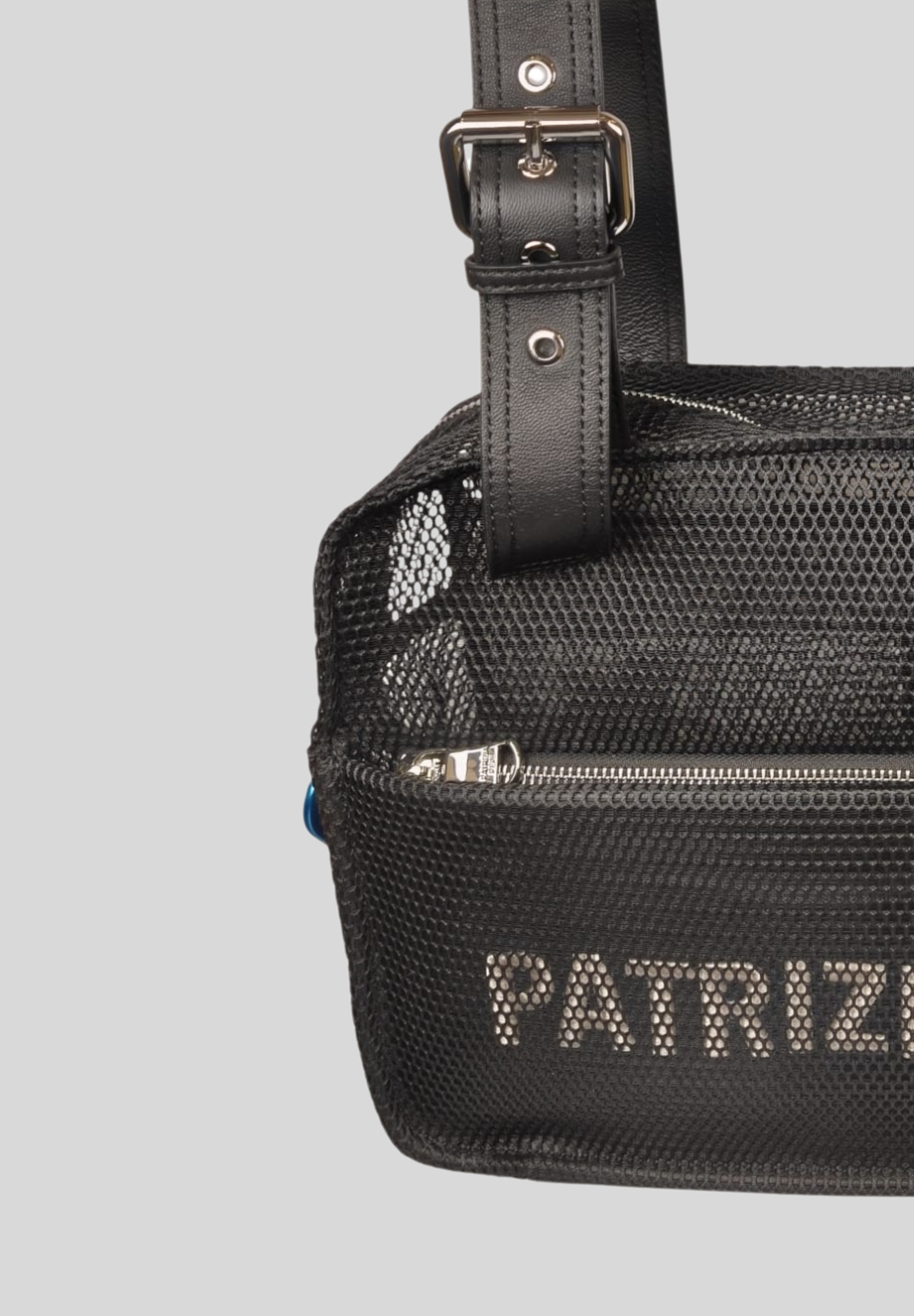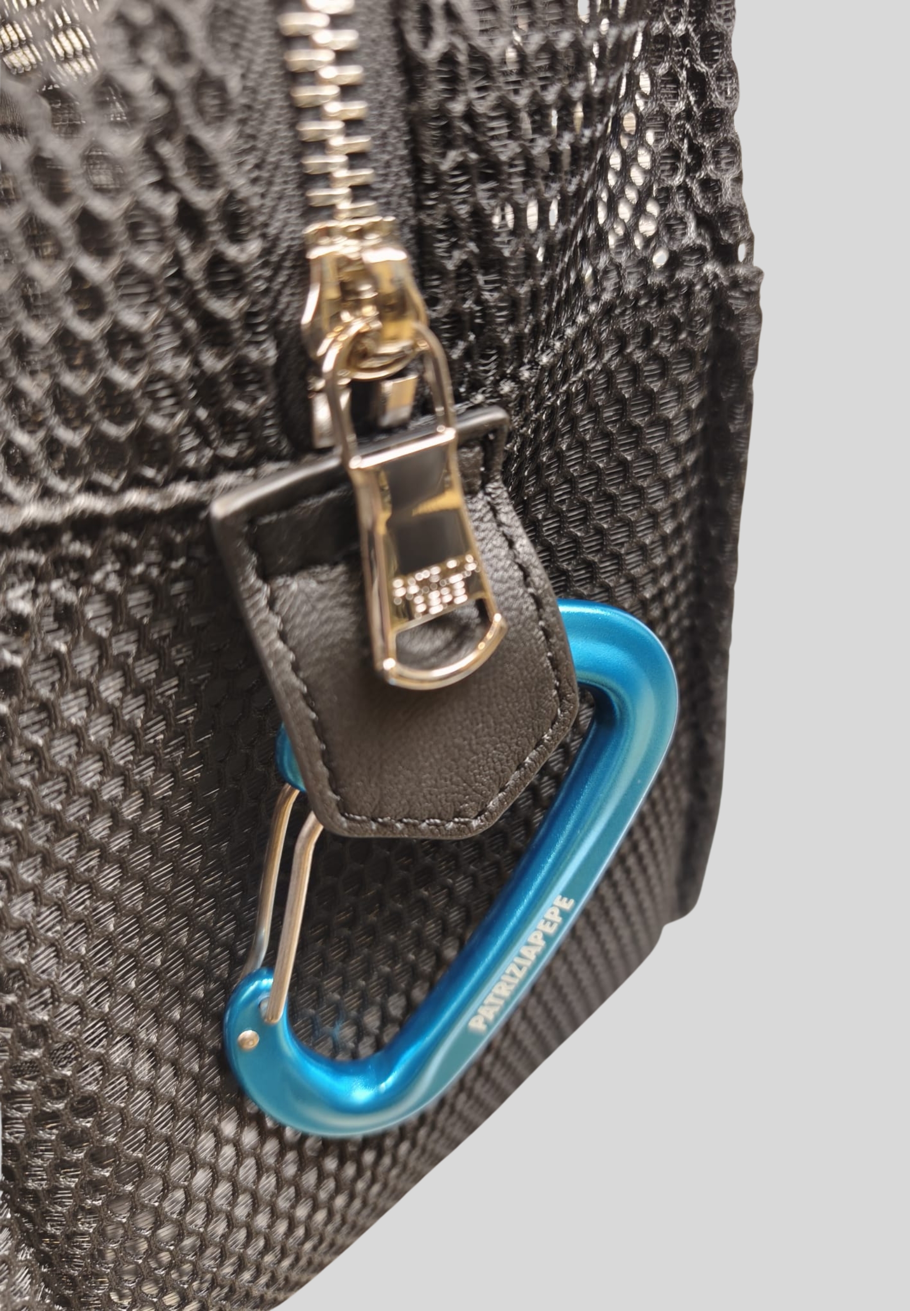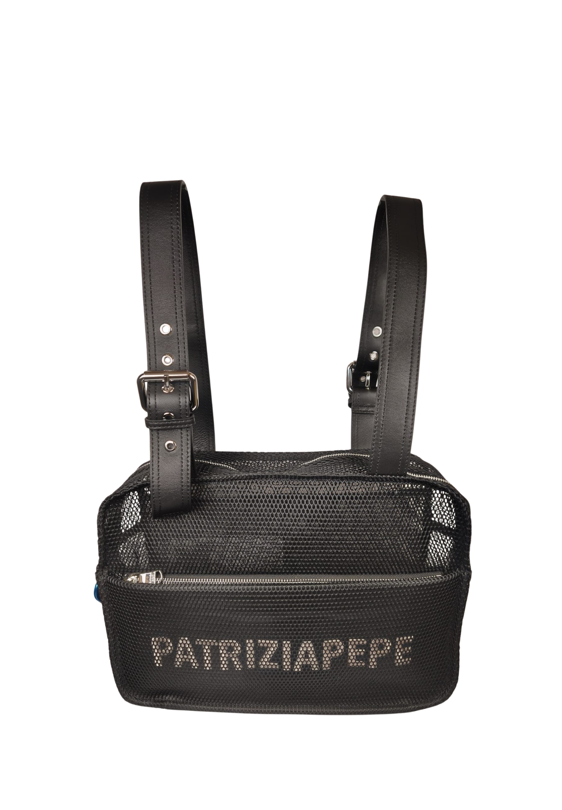 Patrizia Pepe backpack made of 100% polyester with handles in 100% leather, designed to offer practicality and character in a lightweight and structured design. The perforated texture gives a contemporary look, while the front zip pocket allows for easy organization of everyday items.