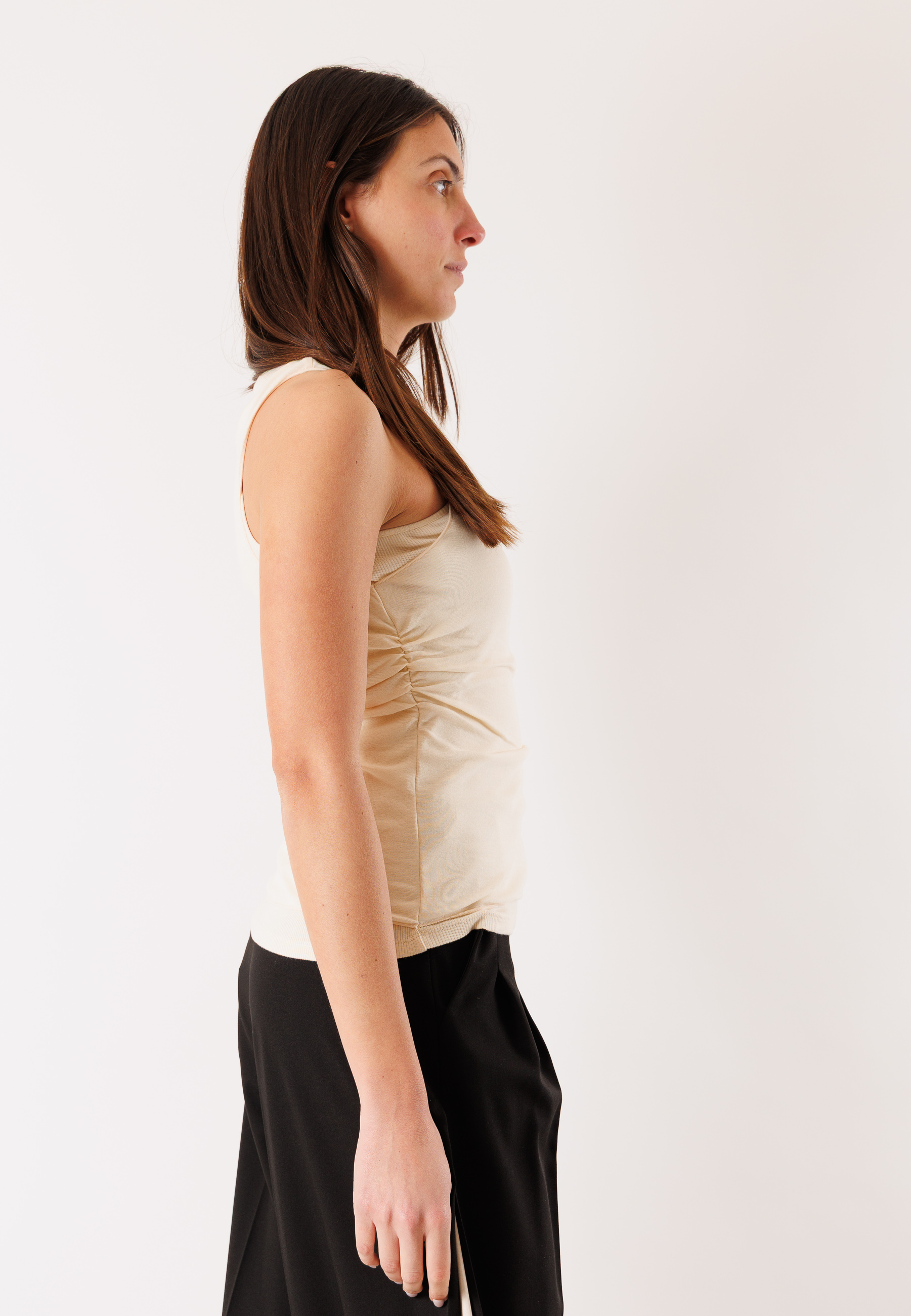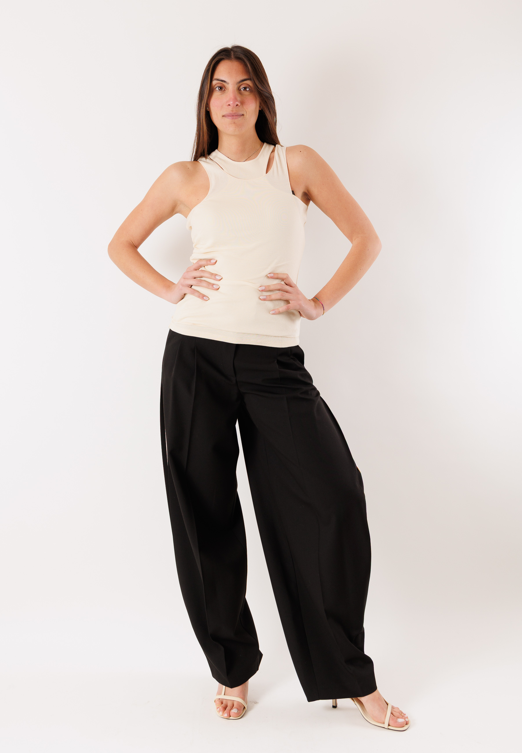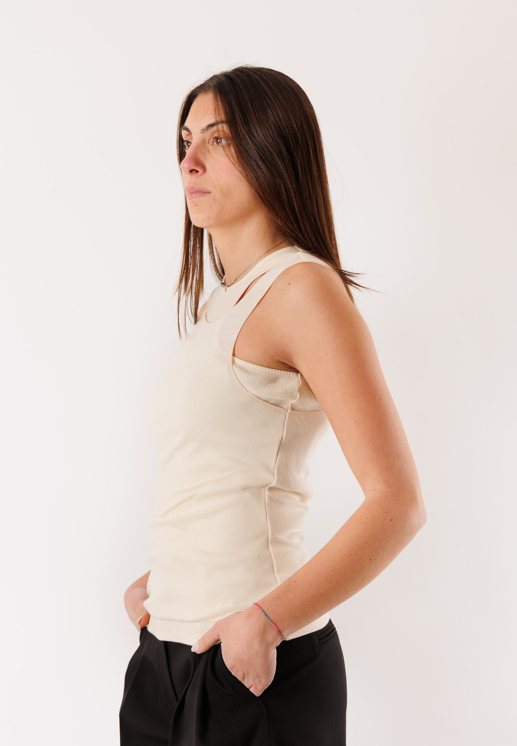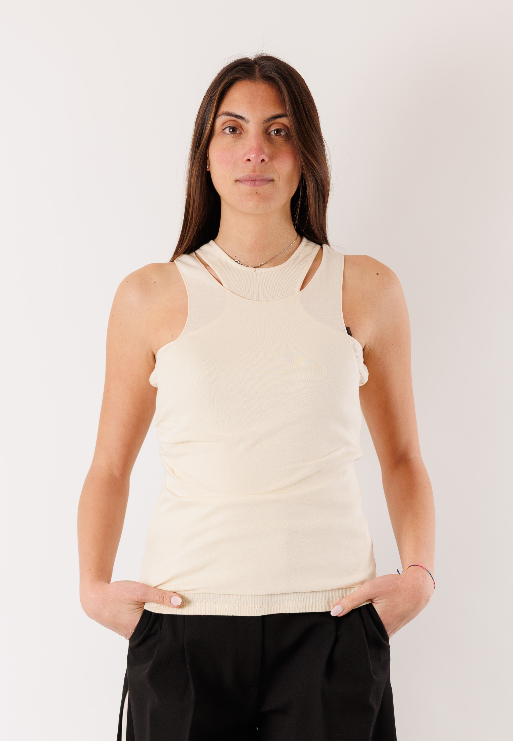 The sleeveless cut and balanced fit naturally enhance the silhouette, offering a feminine and contemporary look. The high-quality fabric guarantees durability, freshness, and a pleasant feel on the skin, making it ideal even in warmer seasons.