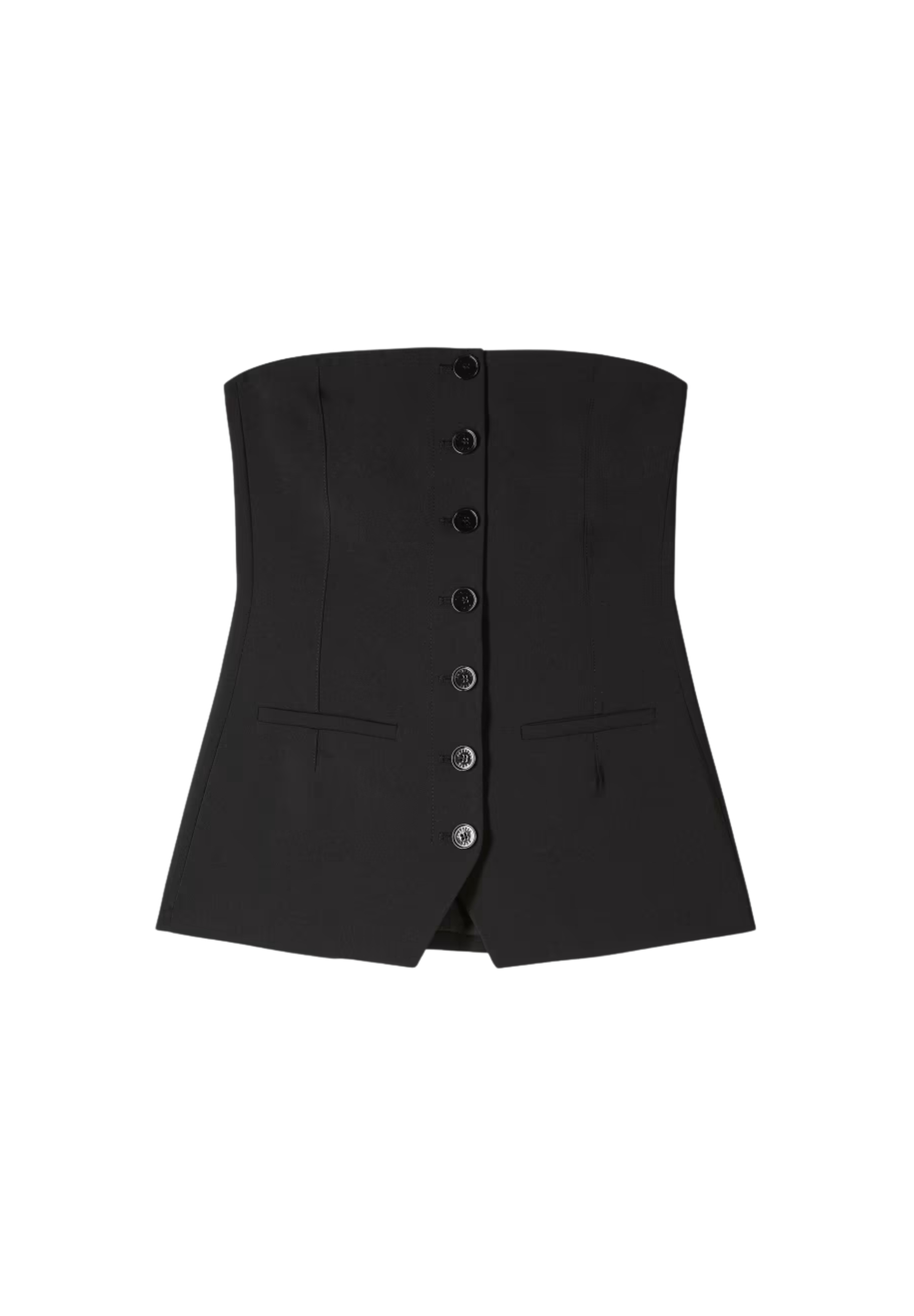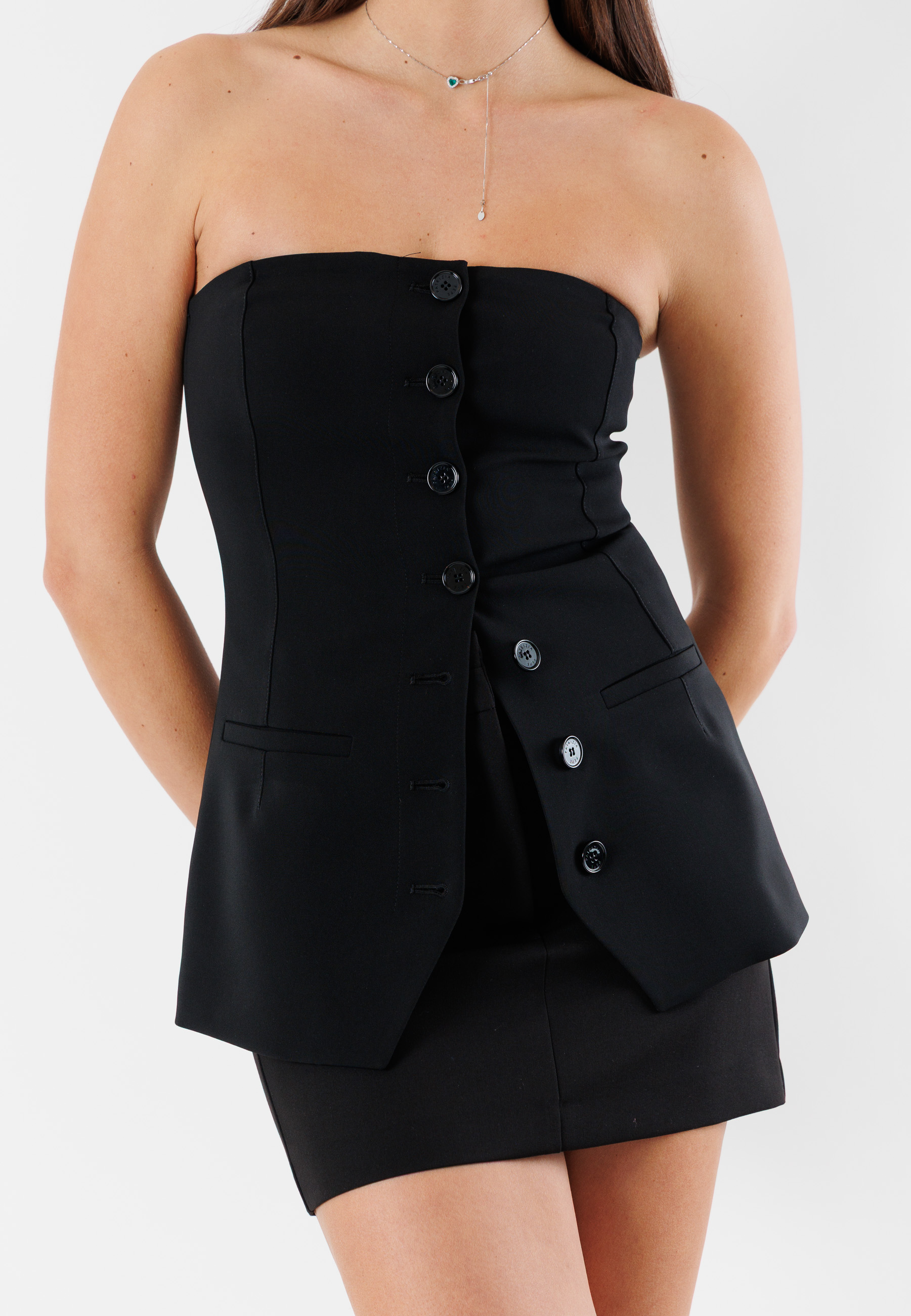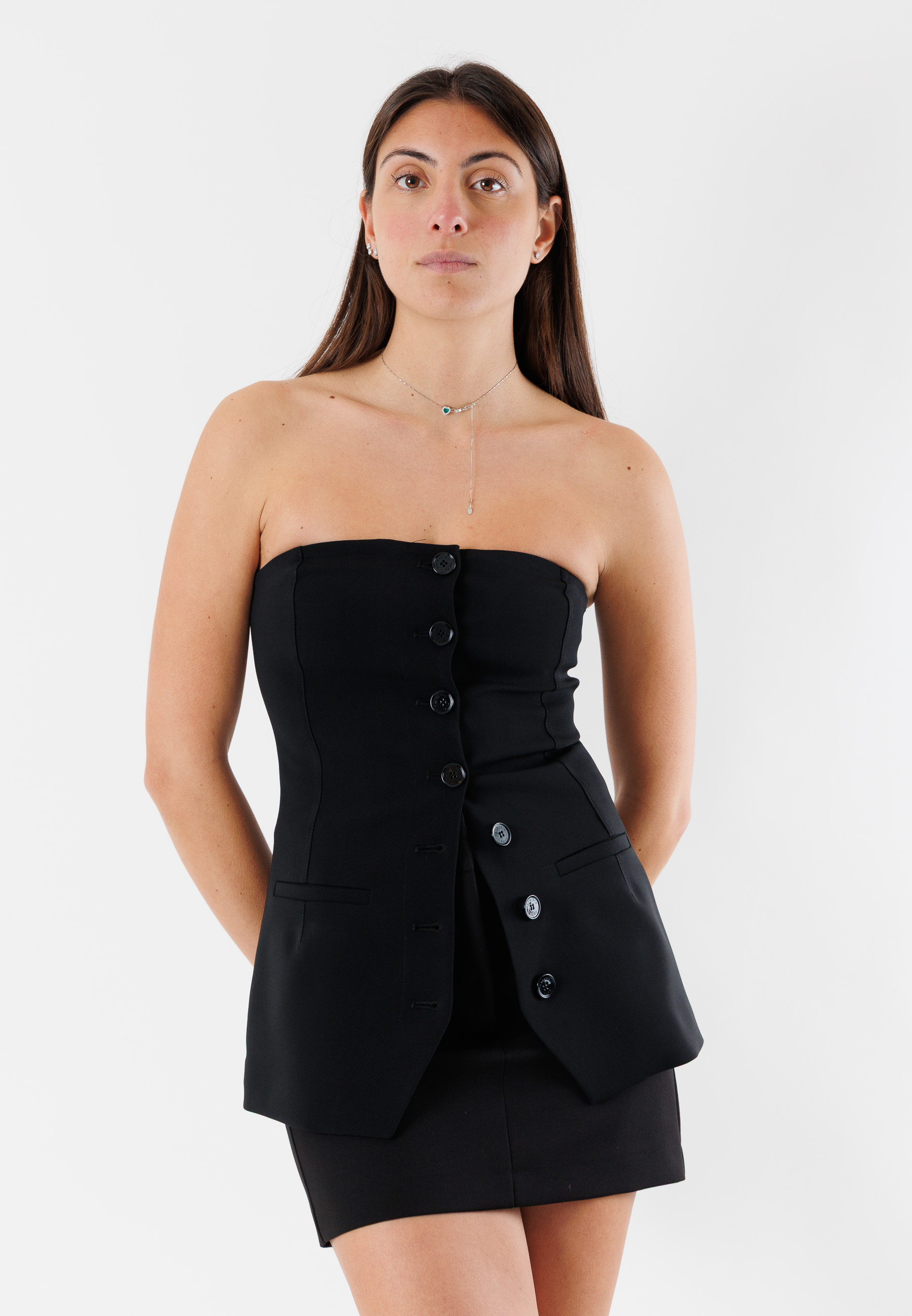 Patrizia Pepe women's top with a bold and contemporary design, inspired by the world of tailoring. The strapless bustier model features a front button structure and details reminiscent of a jacket cut, for a sophisticated and feminine look.