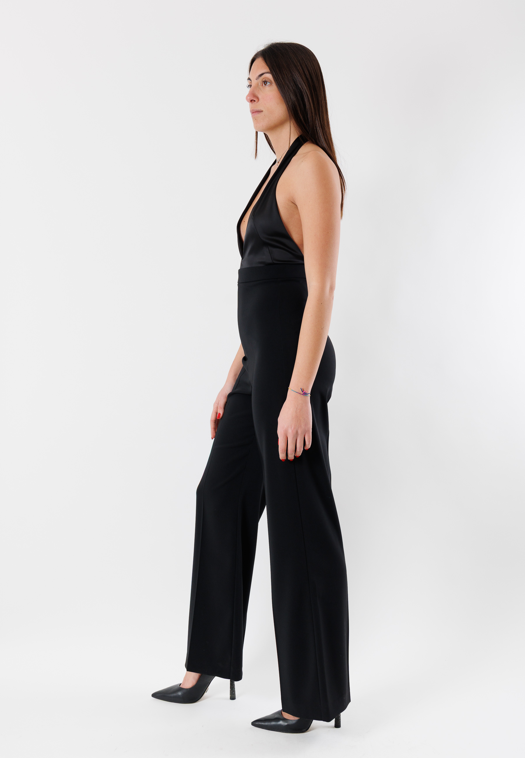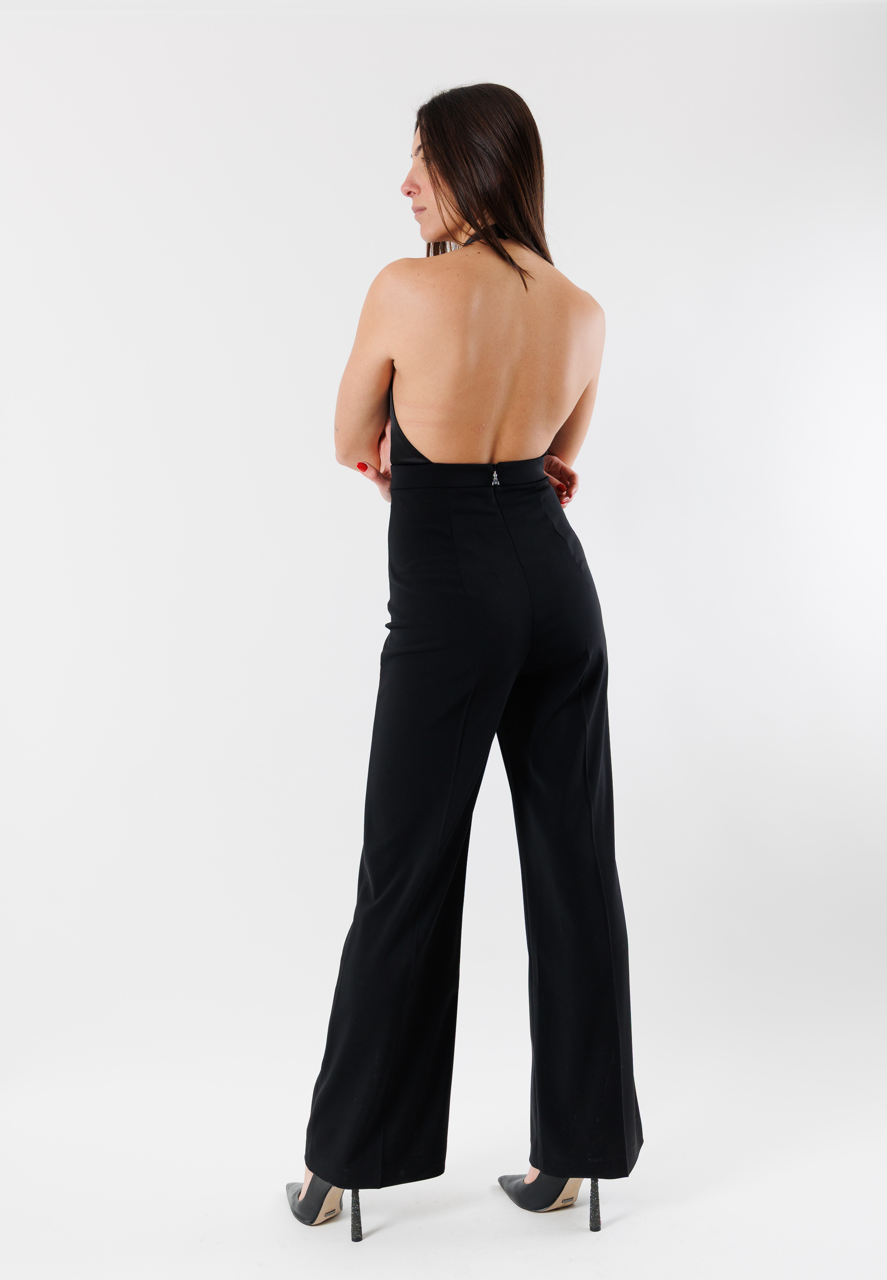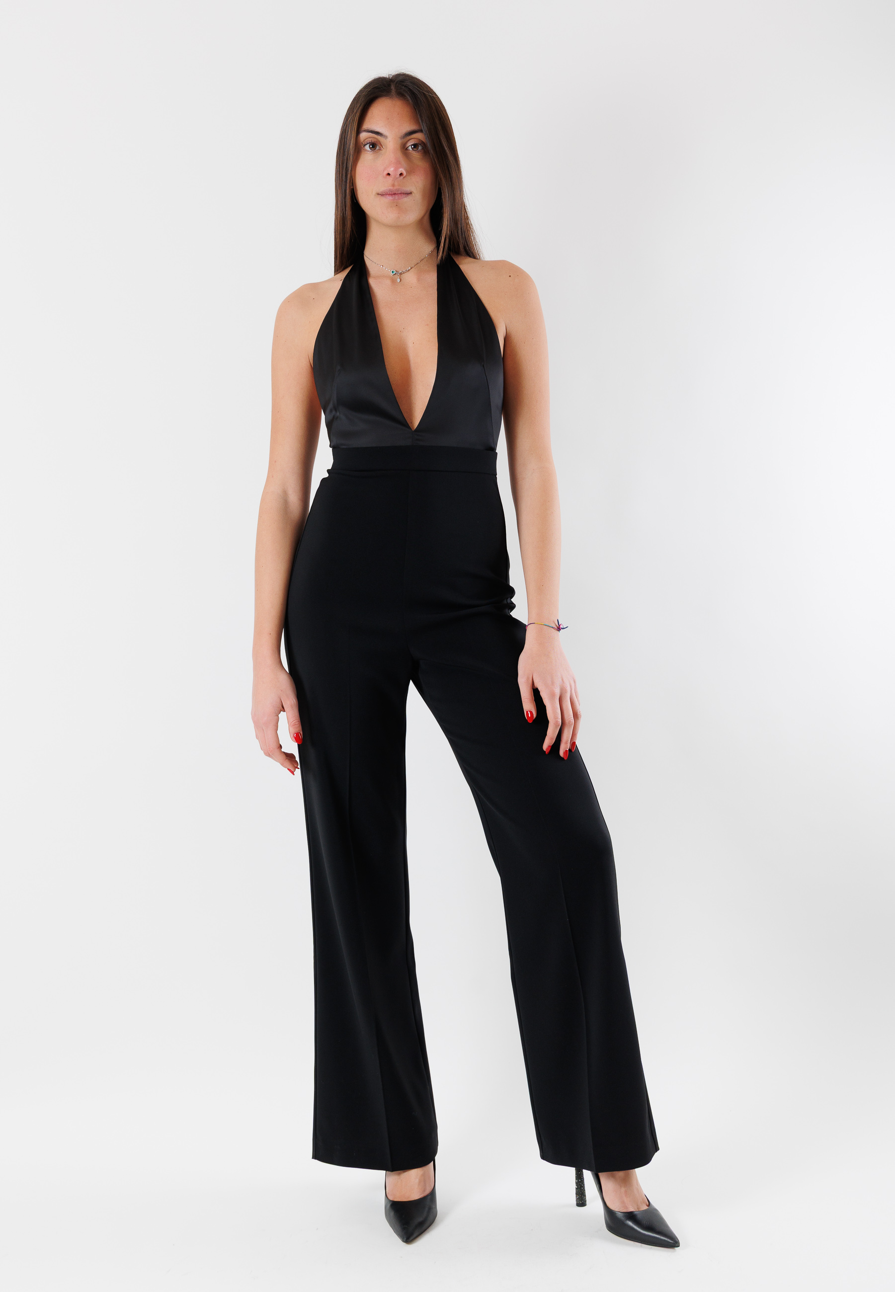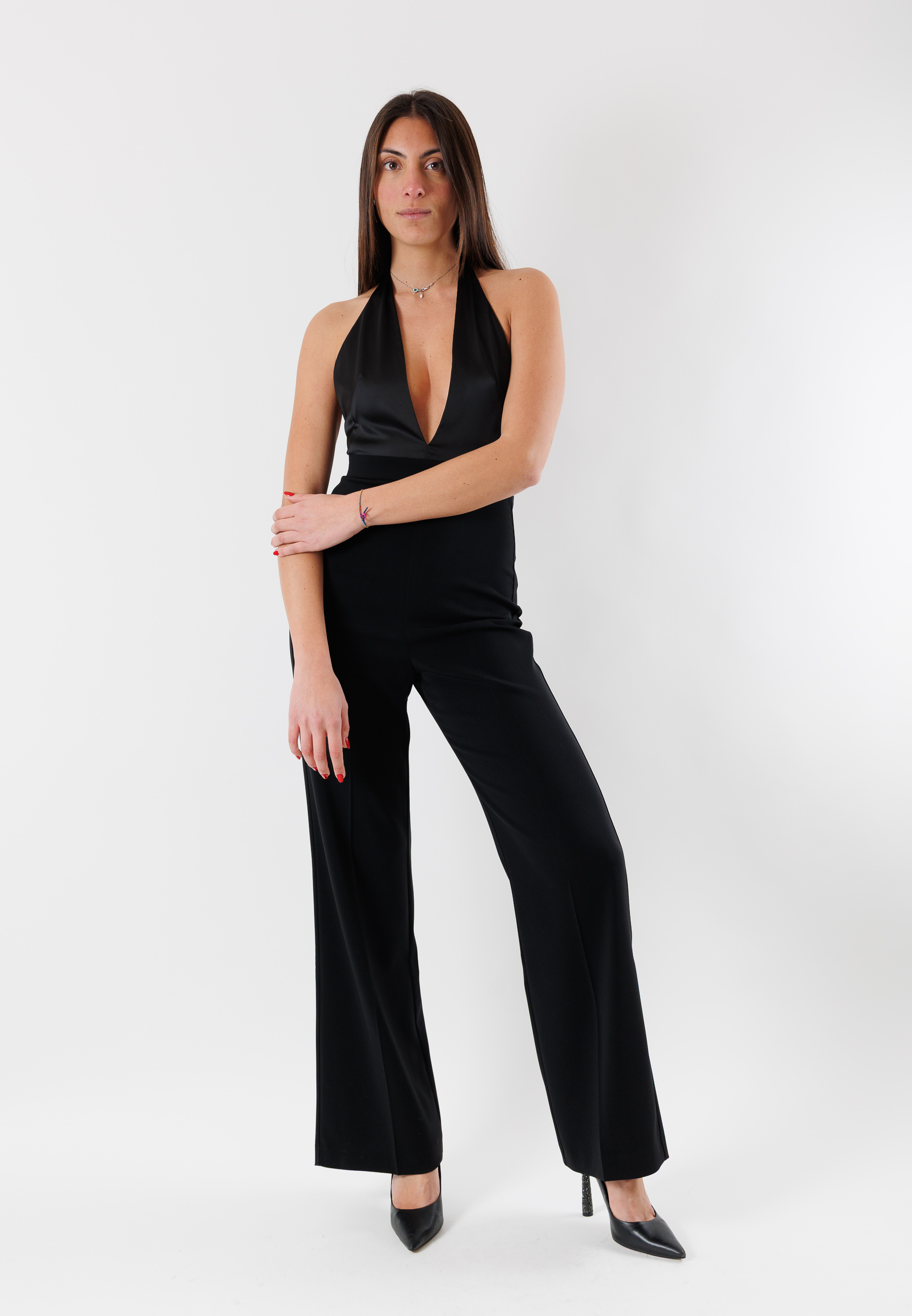 The model features a deep front neckline and a clean line that elongates the figure, while the wide-leg cut adds movement and femininity. Perfect for evening occasions, special events, or refined evening looks, this jumpsuit is a stylish alternative to the classic dress.