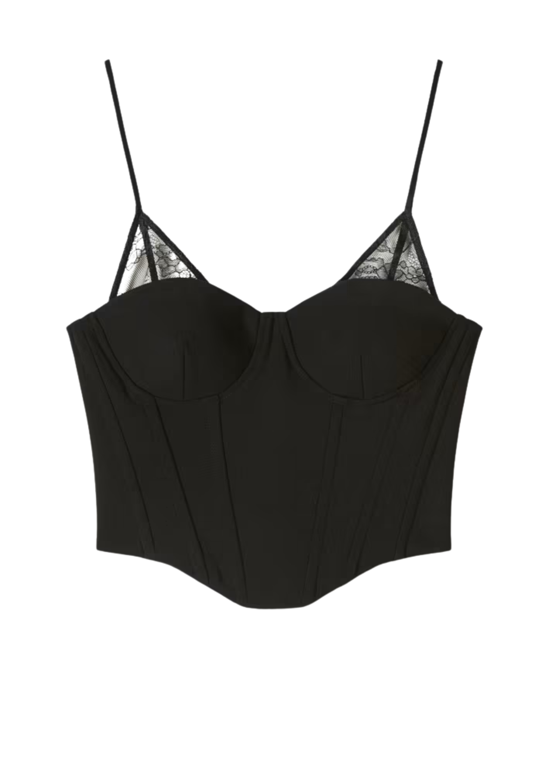 The model with thin straps, molded cups, and lace inserts on the neckline adds a feminine and sophisticated touch, perfect for evening looks or more refined outfits. Ideal to wear under a jacket, with high-waisted trousers or skirts, for a bold and contemporary style.