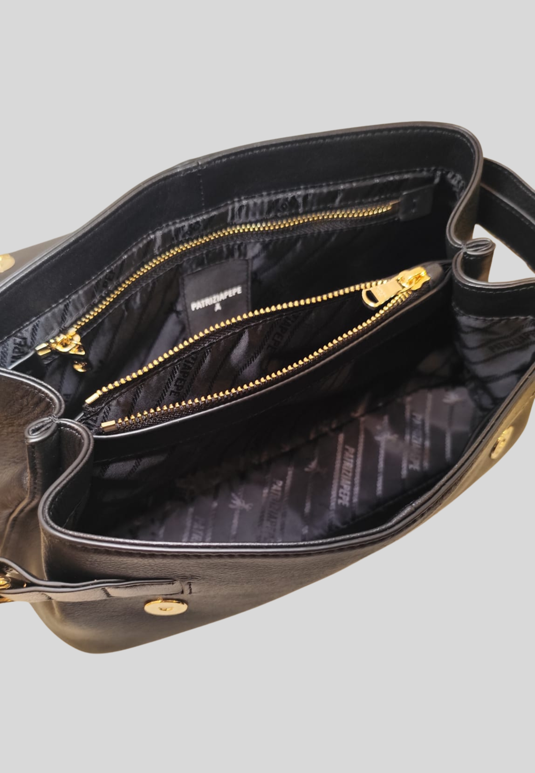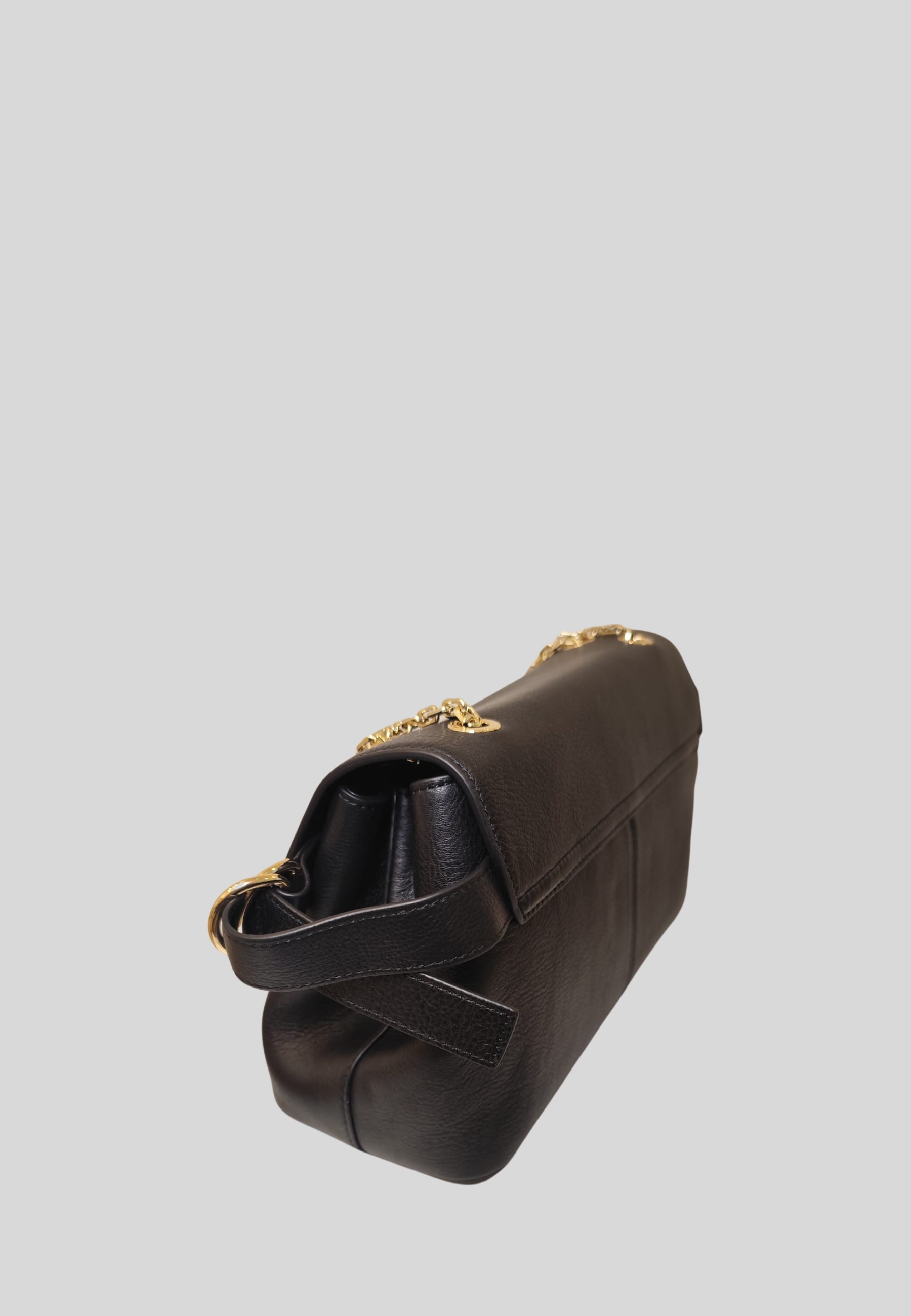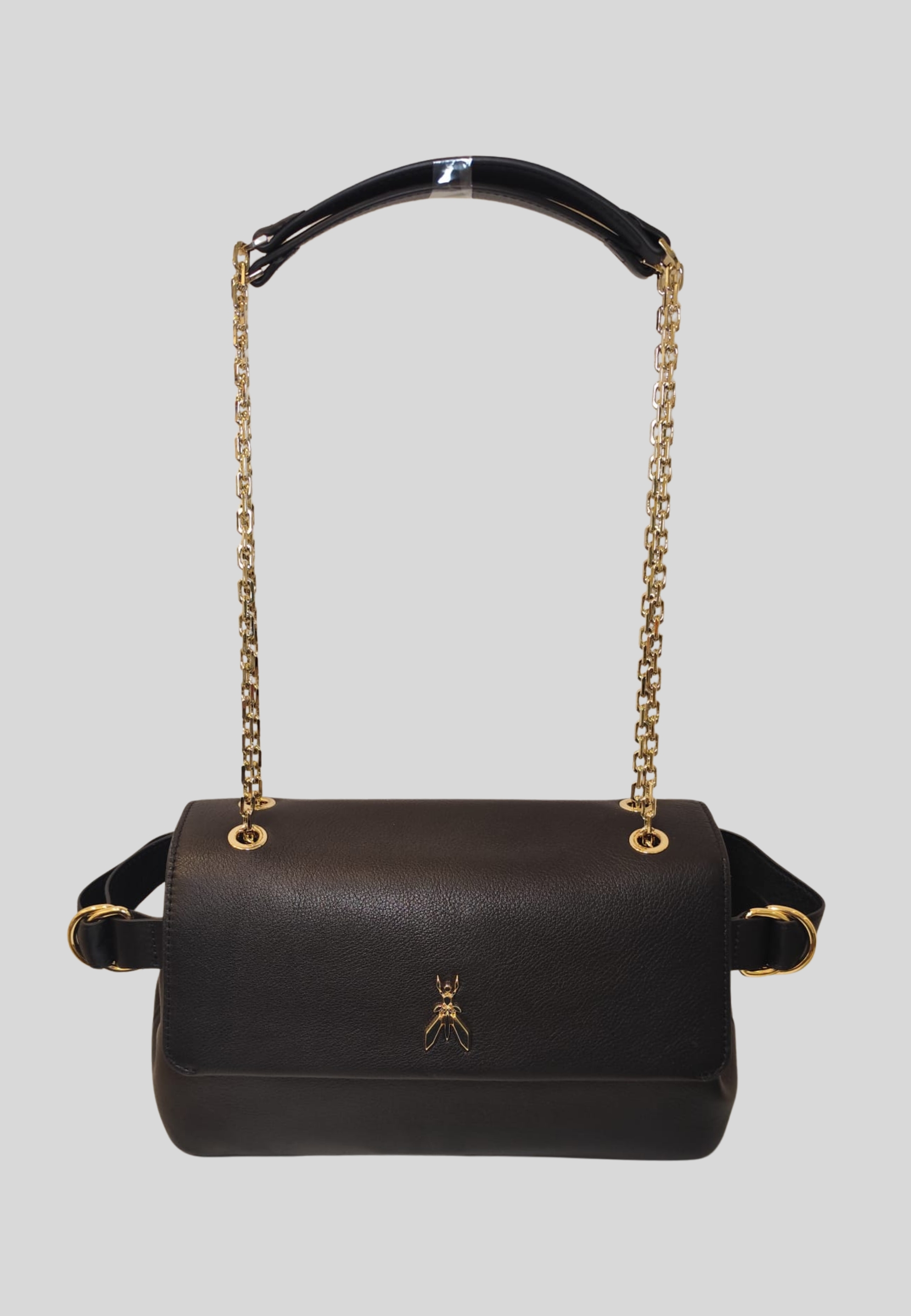 The handbag by Patrizia Pepe represents a perfect balance between contemporary style, elegance, and functionality. An iconic accessory, designed to enhance any look with a sophisticated and feminine touch. Made from 100% calf leather, it offers a soft, durable, and pleasant-to-the-touch texture, a sign of artisanal quality and long-lasting use. The refined finishes and gold-tone metallic details add brightness and character to the design. Equipped with a chain shoulder strap, this bag can be worn both on the shoulder and crossbody, perfectly adapting to daily needs and special occasions. The interior is well-organized, ideal for neatly storing a smartphone, wallet, and small accessories. Perfect for completing casual chic, business, or evening outfits, it pairs easily with jeans, dresses, blazers, and elegant pieces. Its versatile style makes it a must-have in the female wardrobe.