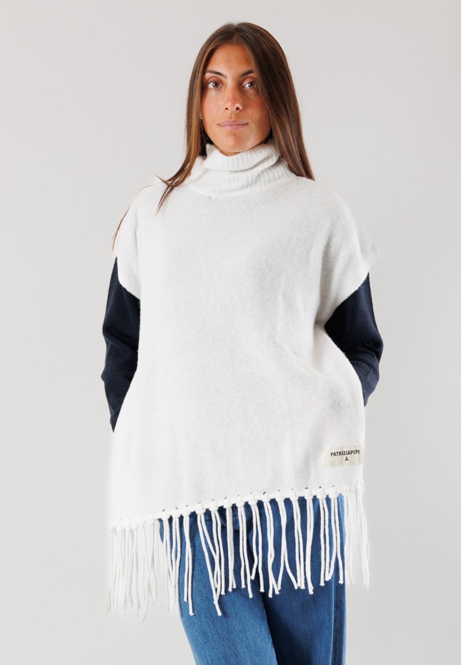 The white Patrizia Pepe poncho is the ideal accessory to face the cold season with elegance. Made from a precious blend of wool and technical fibers (35% wool, 22% polyamide, 37% polyamide, 6% elastane), it offers enveloping warmth and a pleasant softness to the touch.The minimal design is enhanced by fringes at the bottom and the discreet embroidered Patrizia Pepe logo, adding a refined and recognizable touch. The oversized fit and one-size-fits-all make it practical and versatile, perfect to wear over coats, sweaters, or shirts for a chic and contemporary look.A must-have piece from the Patrizia Pepe Autumn Winter collection, perfect for giving personality to your everyday outfits.?? Product detailsBrand: Patrizia PepeCollection: Autumn WinterComposition: 35% Wool, 22% PC, 37% Polyamide, 6% ElastaneFit: soft, one sizeDetails: decorative fringes, Patrizia Pepe logo on the edge
