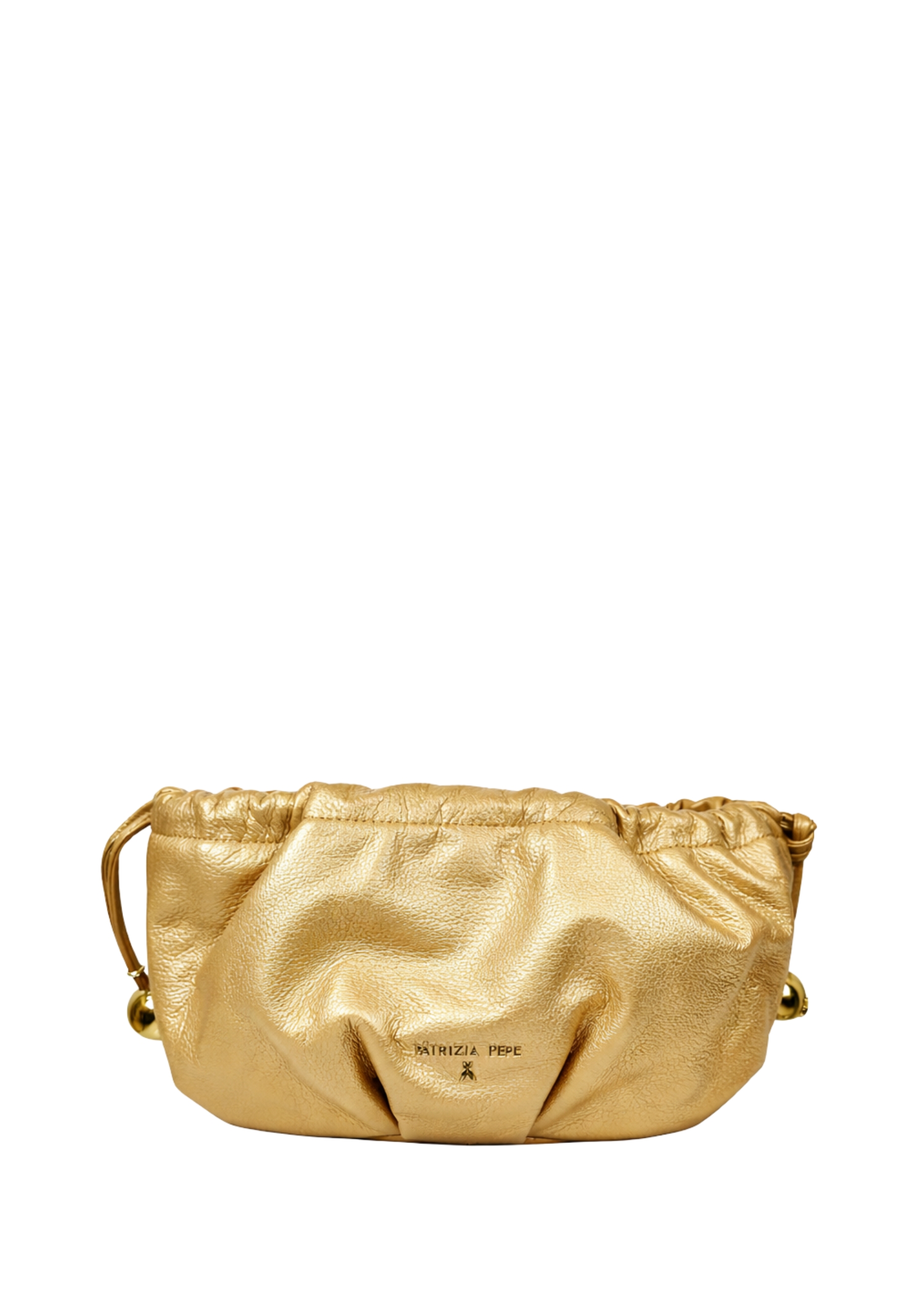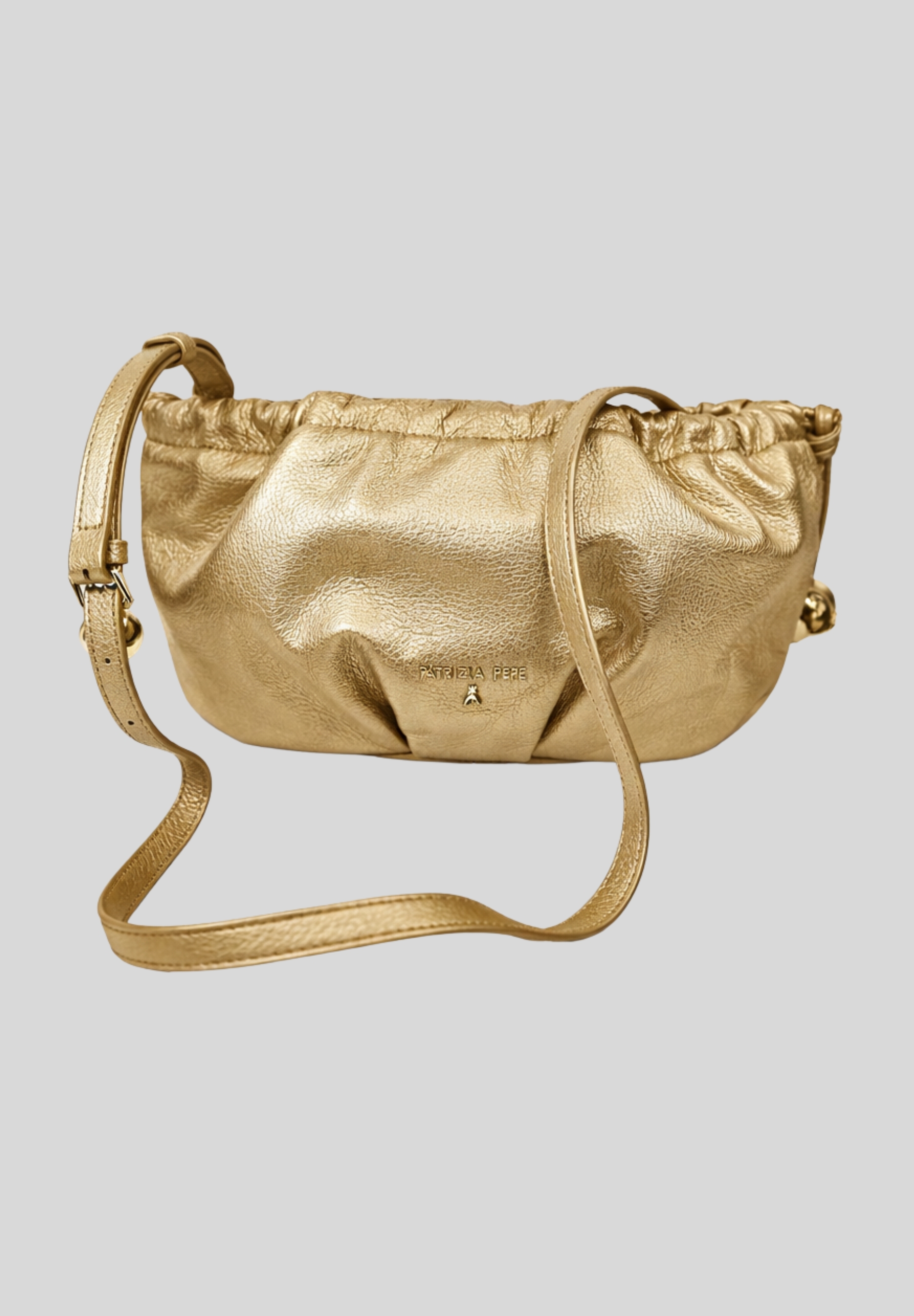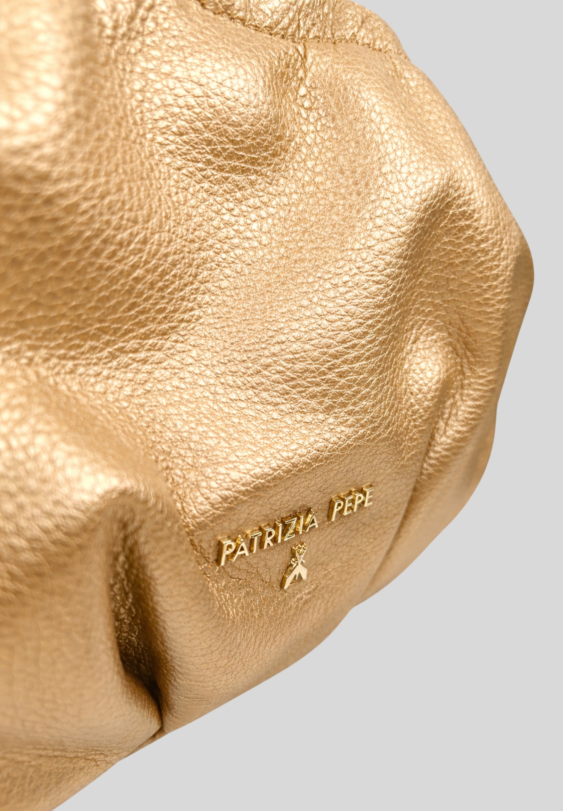 This Patrizia Pepe bag is crafted from 100% calfskin, featuring a soft gathered construction that lends a modern and sophisticated look. The design features a side drawstring closure embellished with metallic details, designed for easy adjustment and a distinctive touch.