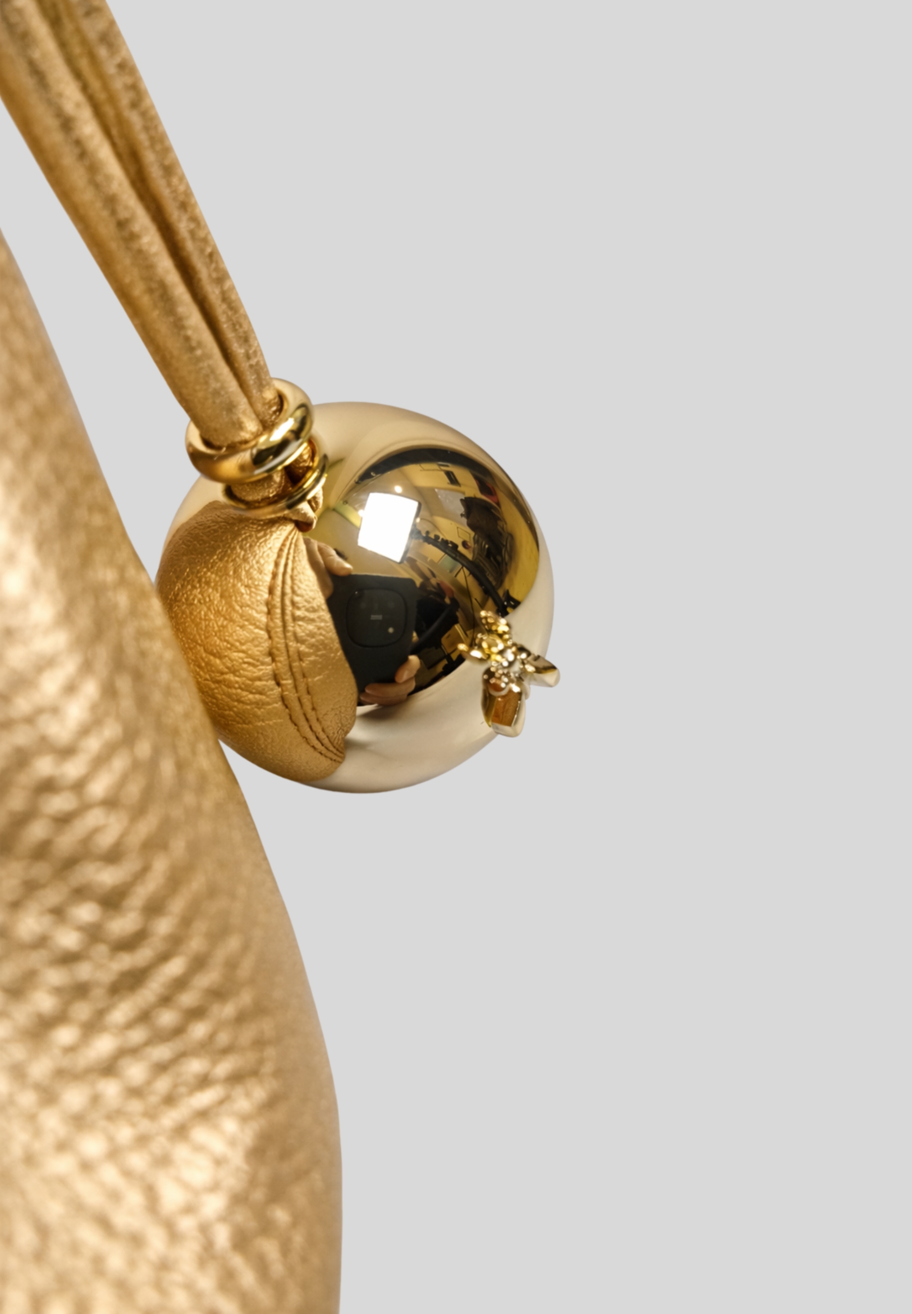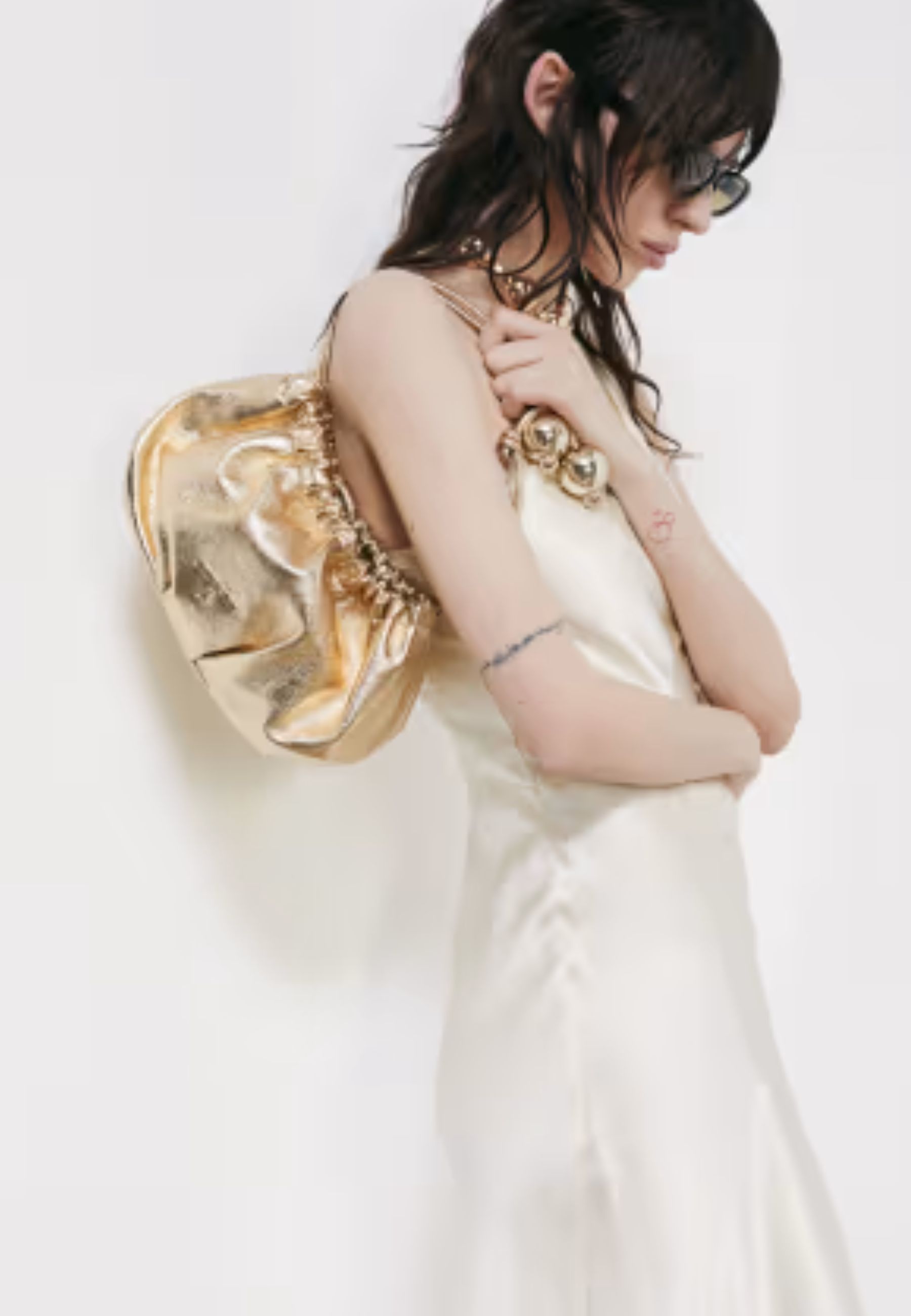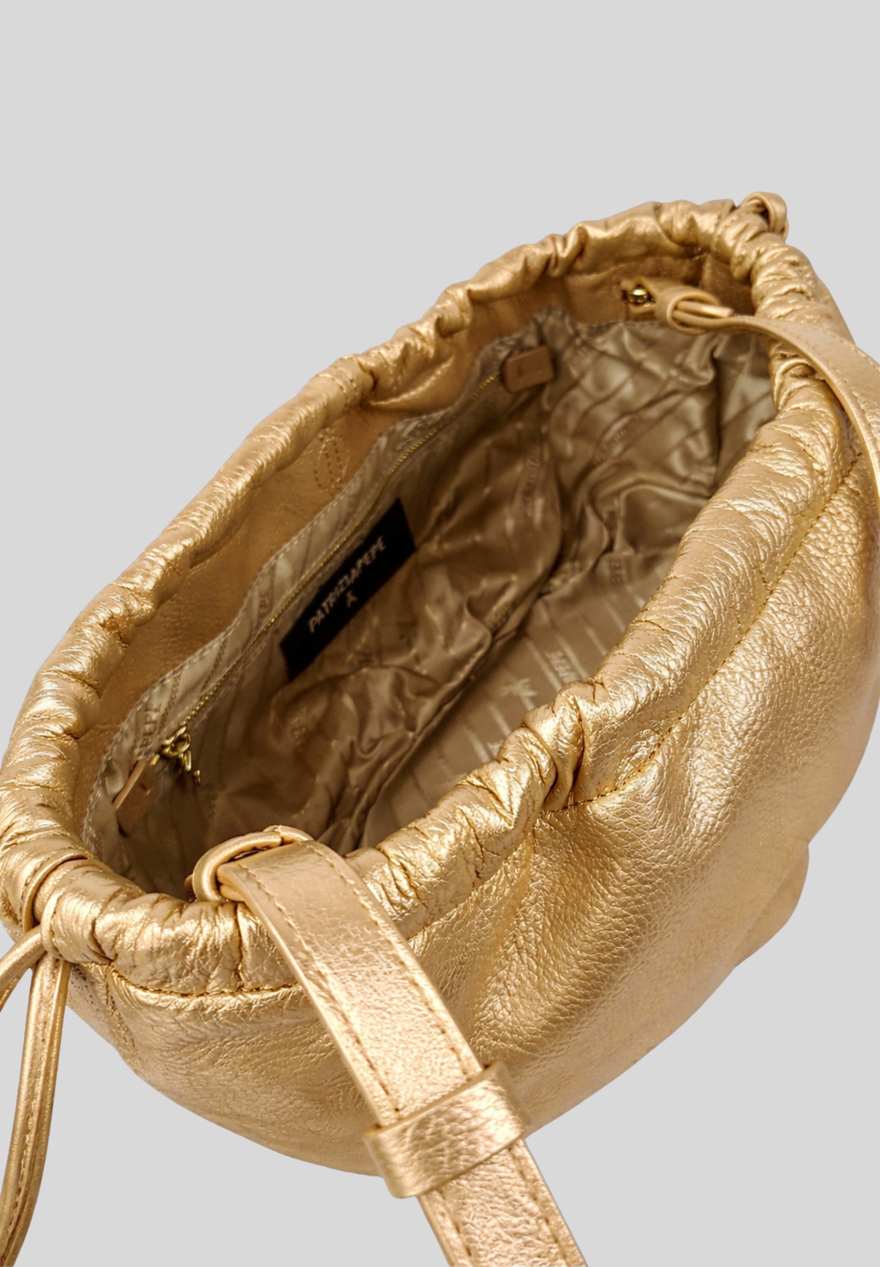 This Patrizia Pepe bag is crafted from 100% calfskin, featuring a soft gathered construction that lends a modern and sophisticated look. The design features a side drawstring closure embellished with metallic details, designed for easy adjustment and a distinctive touch.