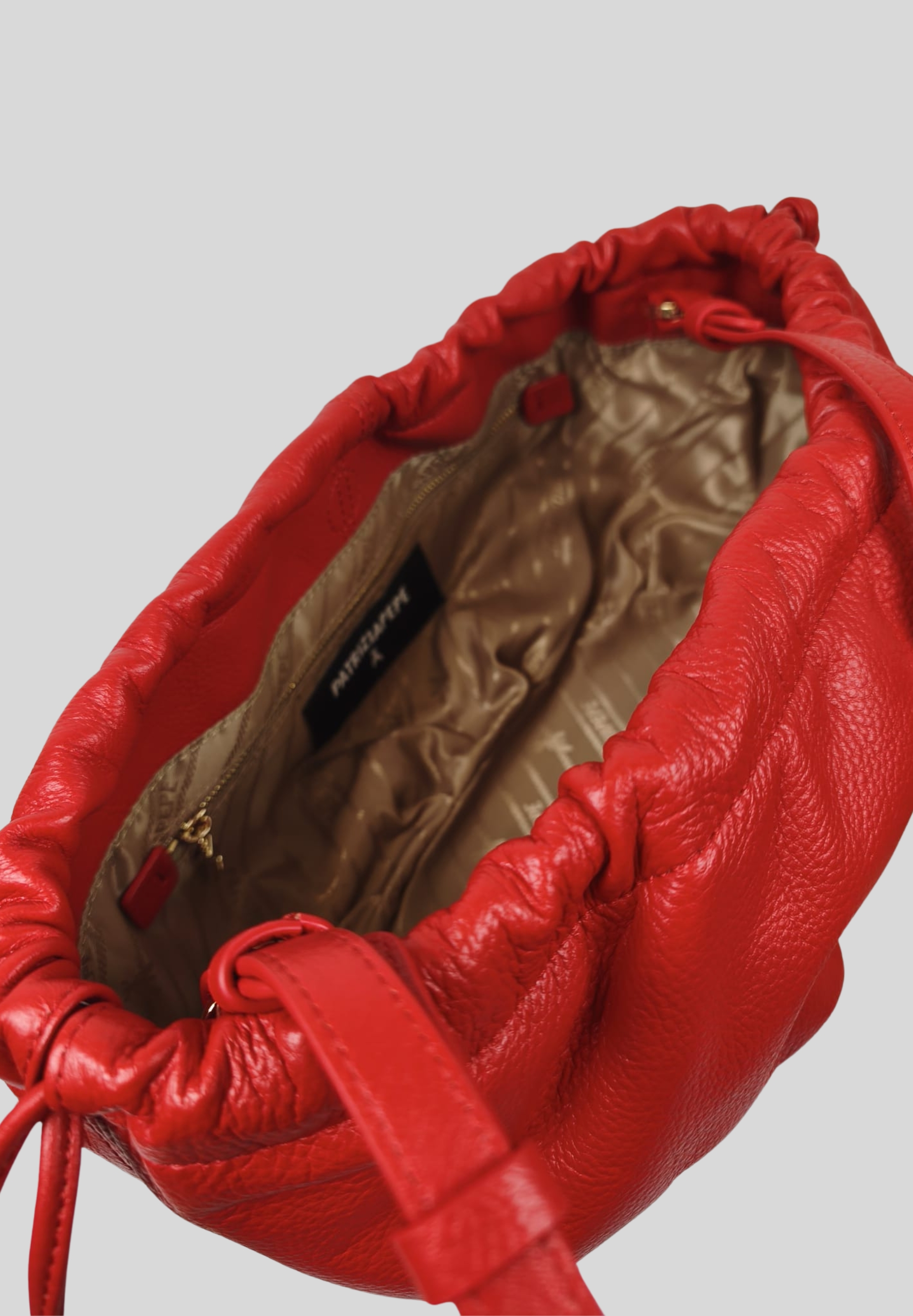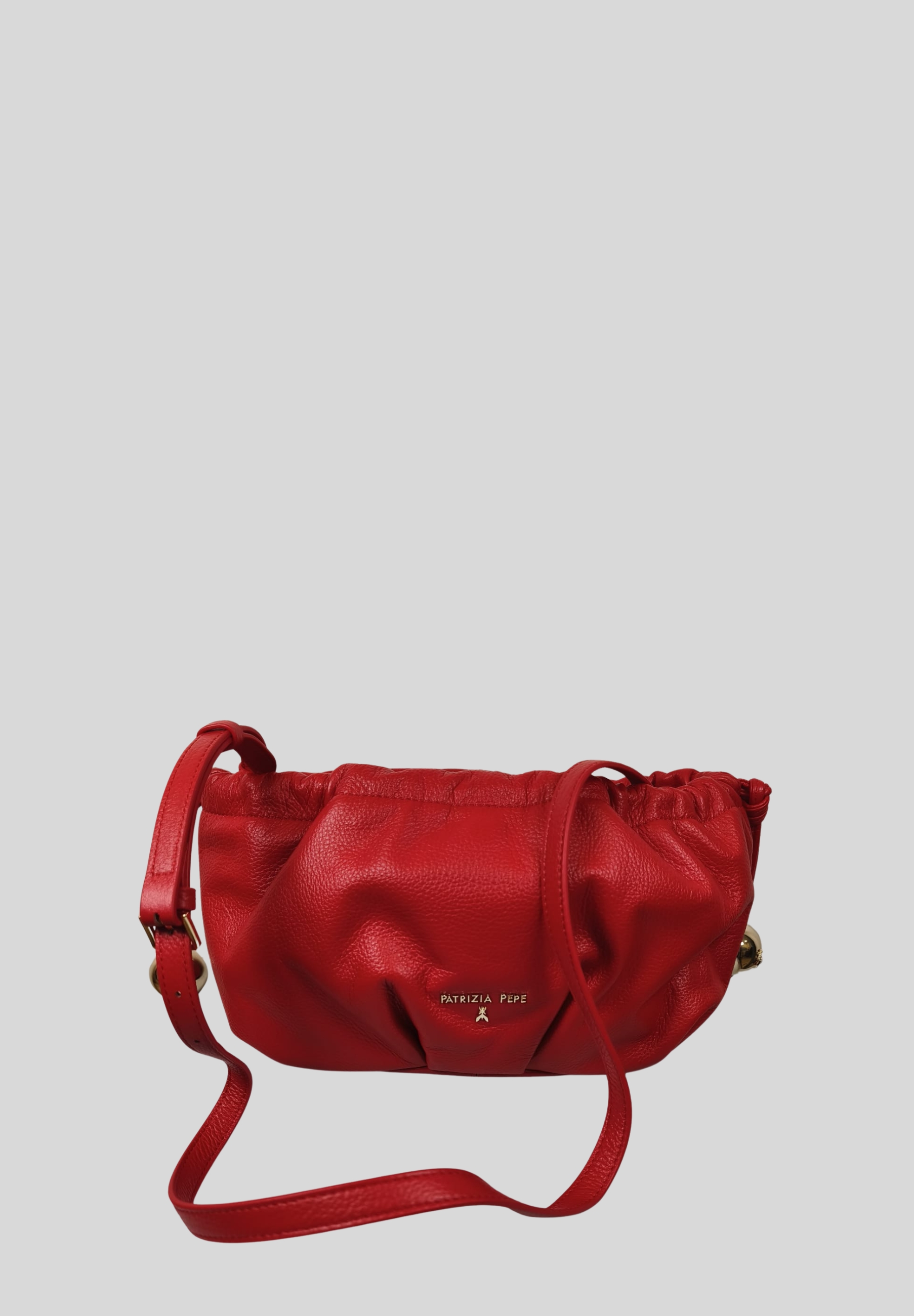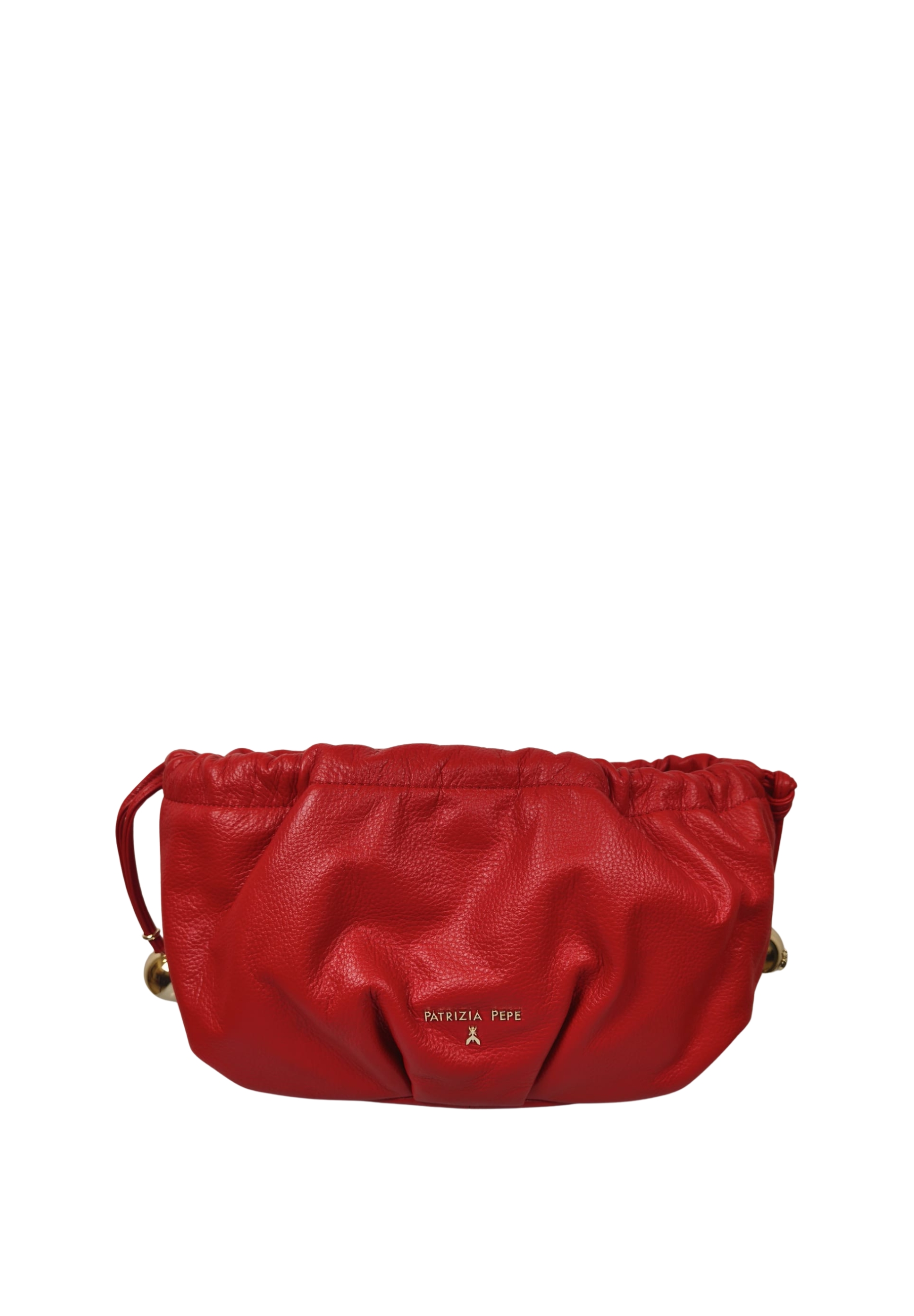 This Patrizia Pepe bag is crafted from 100% calfskin, featuring a soft gathered construction that lends a modern and sophisticated look. The design features a side drawstring closure embellished with metallic details, designed for easy adjustment and a distinctive touch.