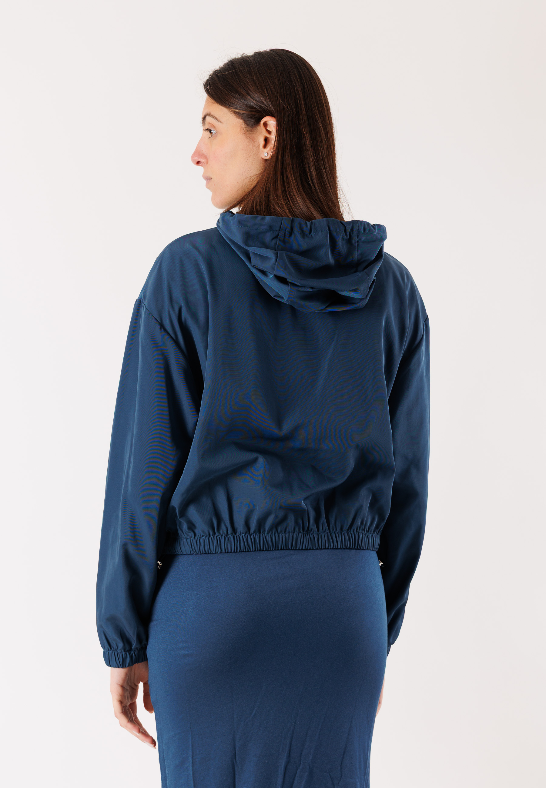 The hooded design, front zip closure, and slightly cinched waist enhance the silhouette, offering a feminine and modern fit. The side pockets add functionality, while the clean lines make this jacket perfect for chic and urban casual outfits.