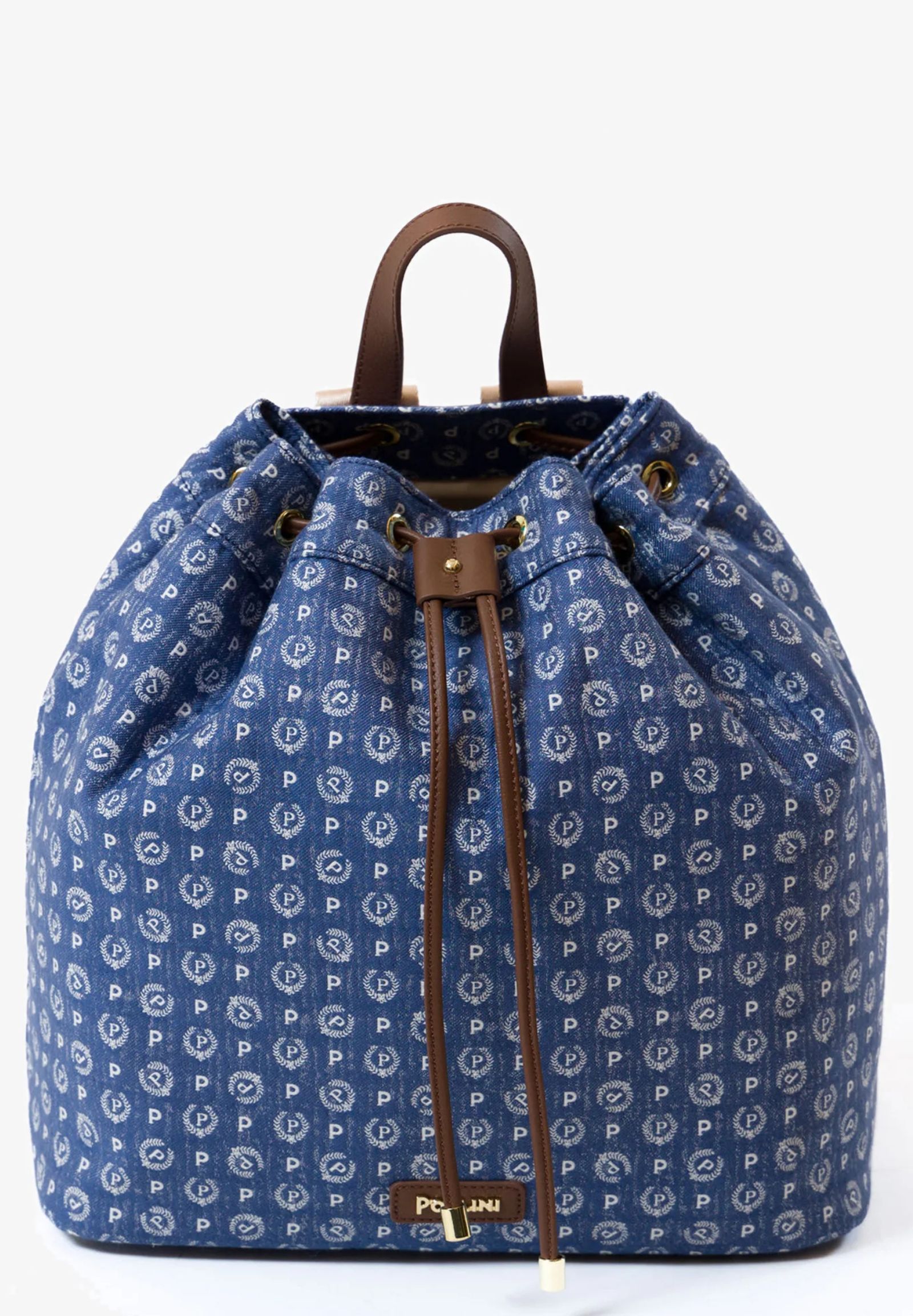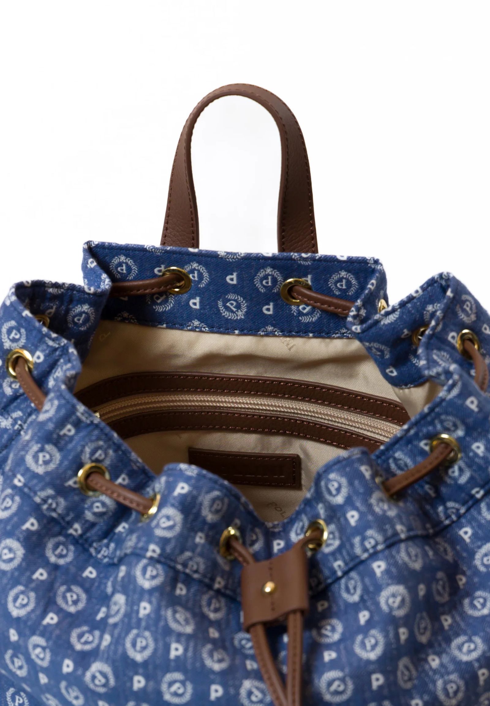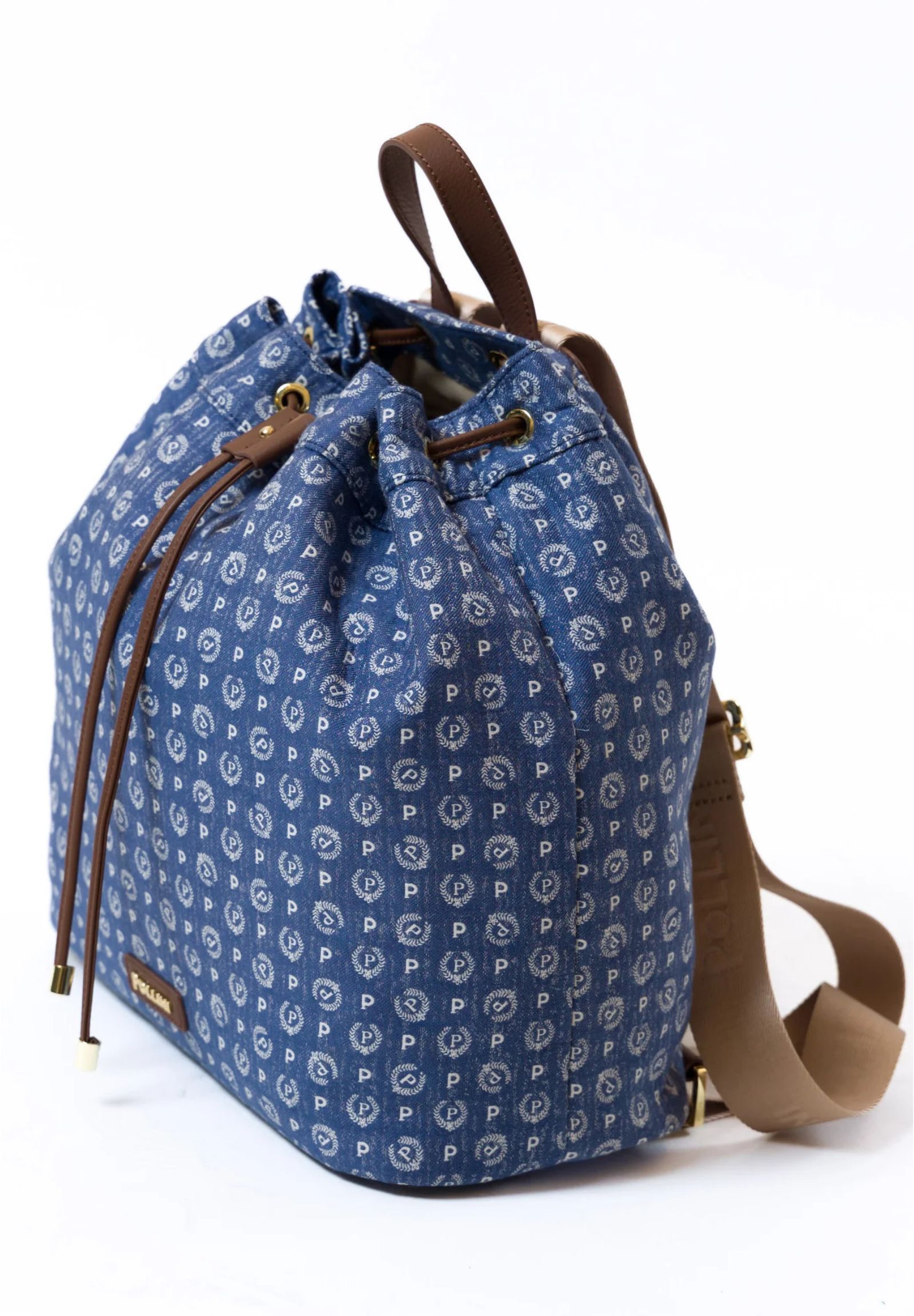 Drawstring backpack made for the exclusive Heritage Denim Jacquard capsule collection. The traditional Heritage pattern is declined in a summer variant in denim-effect jacquard. With a fresh and youthful look, the soft fabric is combined with tan-colored tumbled calfskin details.