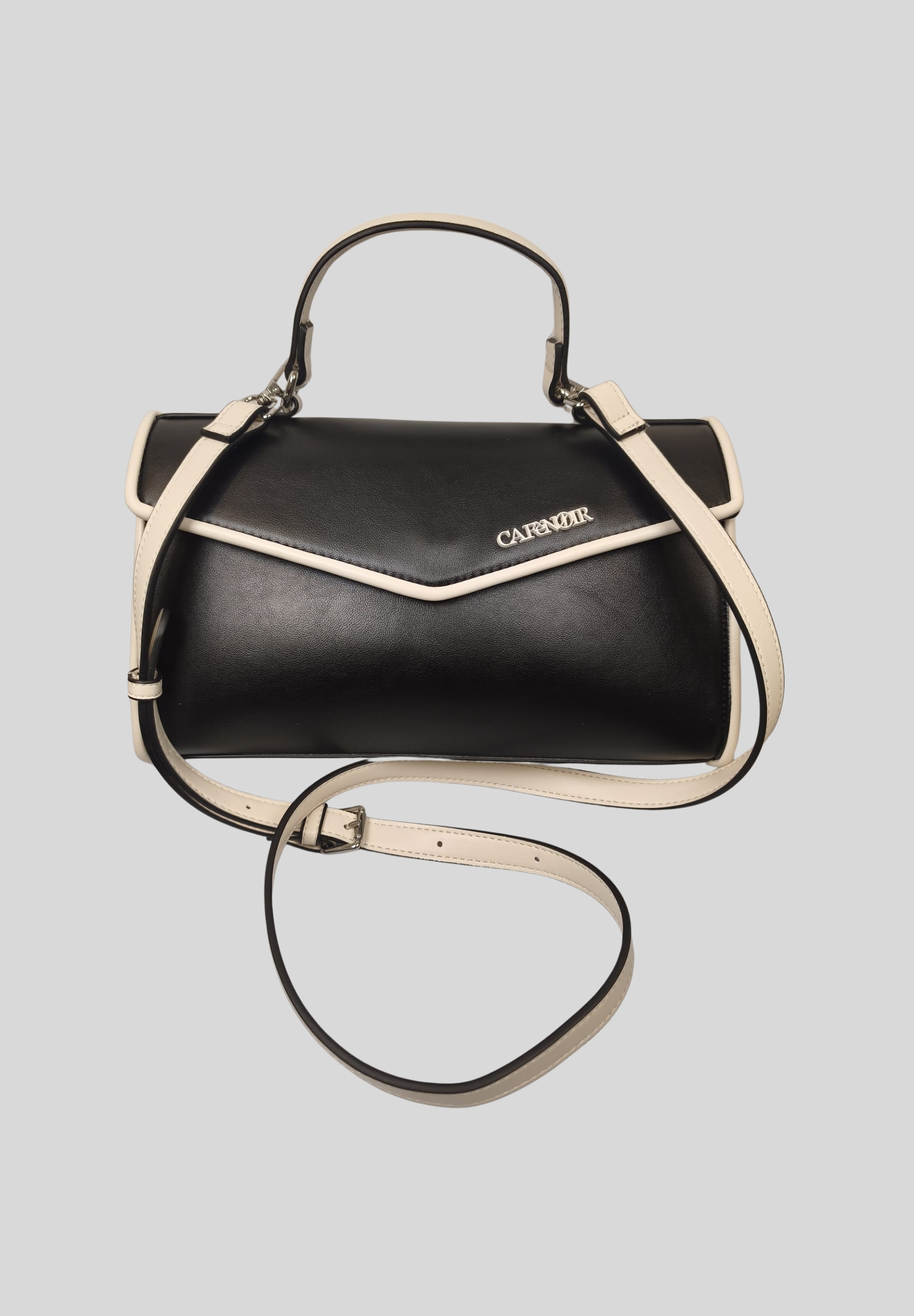 Raffinata e compatta, questa borsa a mano Cafè Noir è realizzata in 100% poliuretano con finitura in similpelle liscia, ideale per completare look eleganti e quotidiani. Il design strutturato è valorizzato dalla patta frontale sagomata con logo applicato, che dona carattere e stile. Dotata di manico rigido e tracolla regolabile e removibile, offre versatilità duso. Linterno foderato con tasca zip consente una pratica organizzazione degli oggetti essenziali. Perfetta per outfit casual chic e serate urbane firmate Cafè Noir.