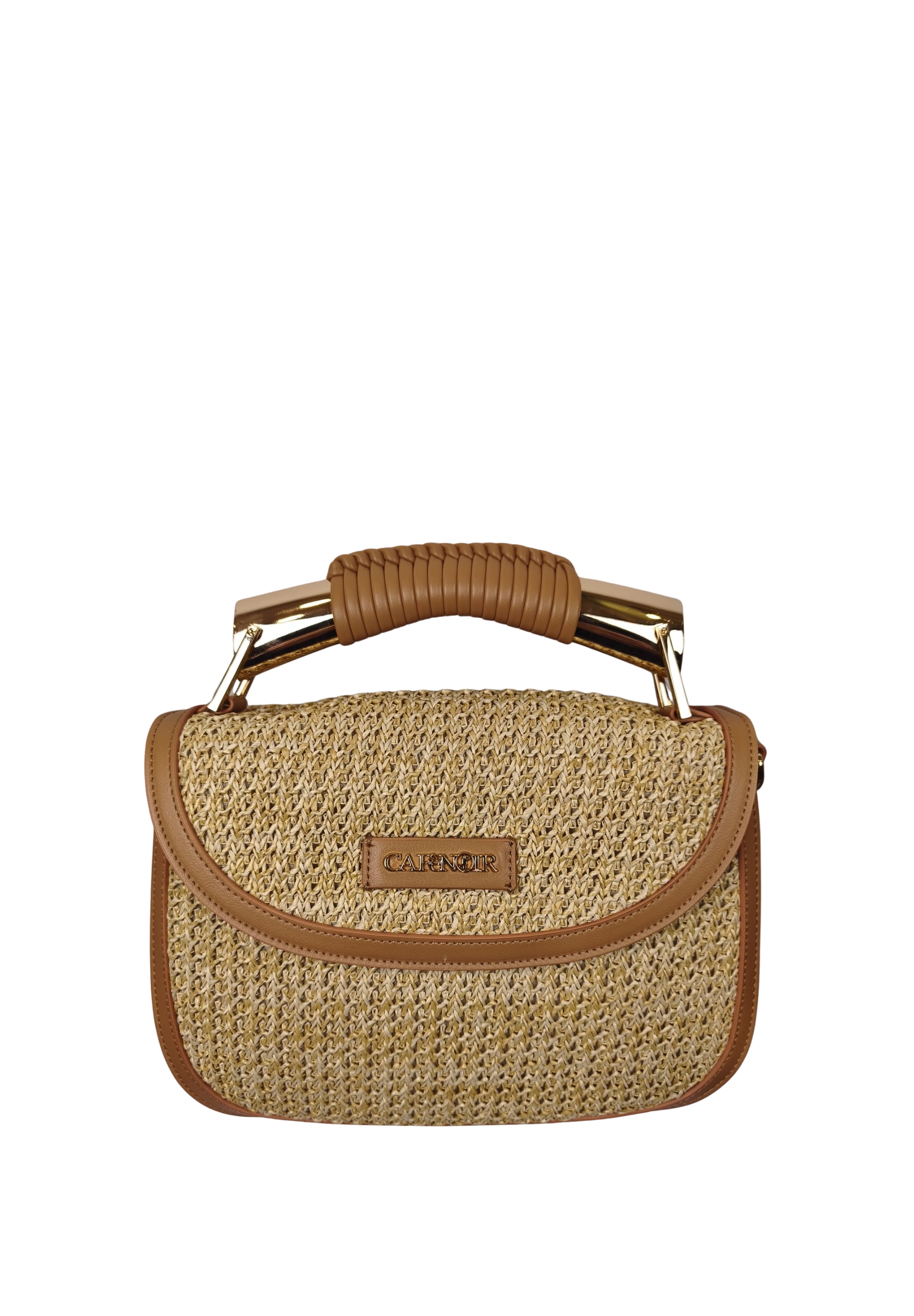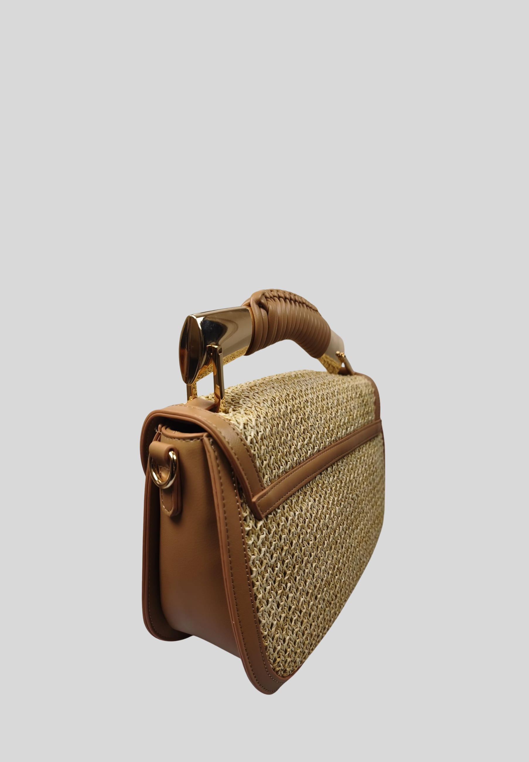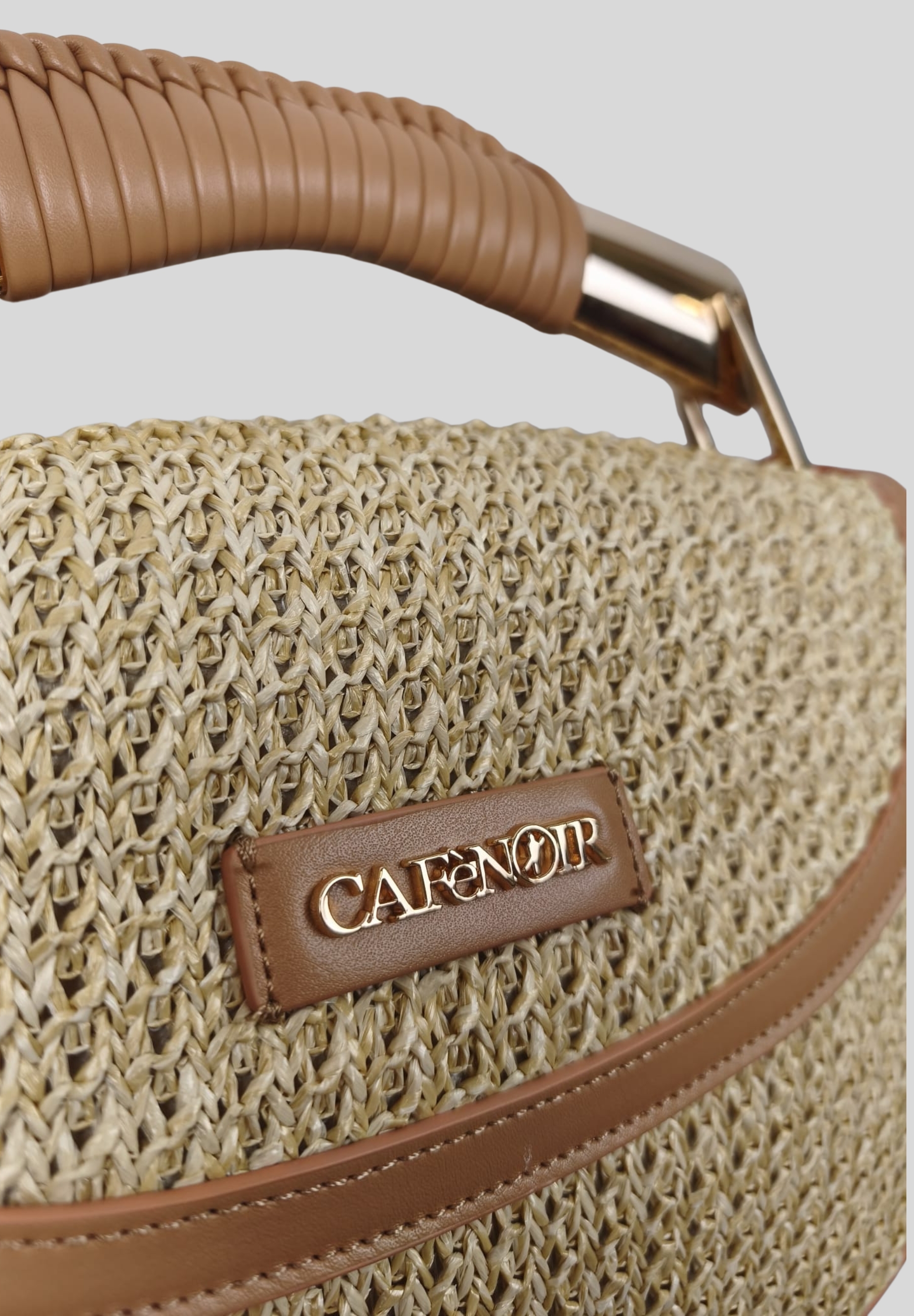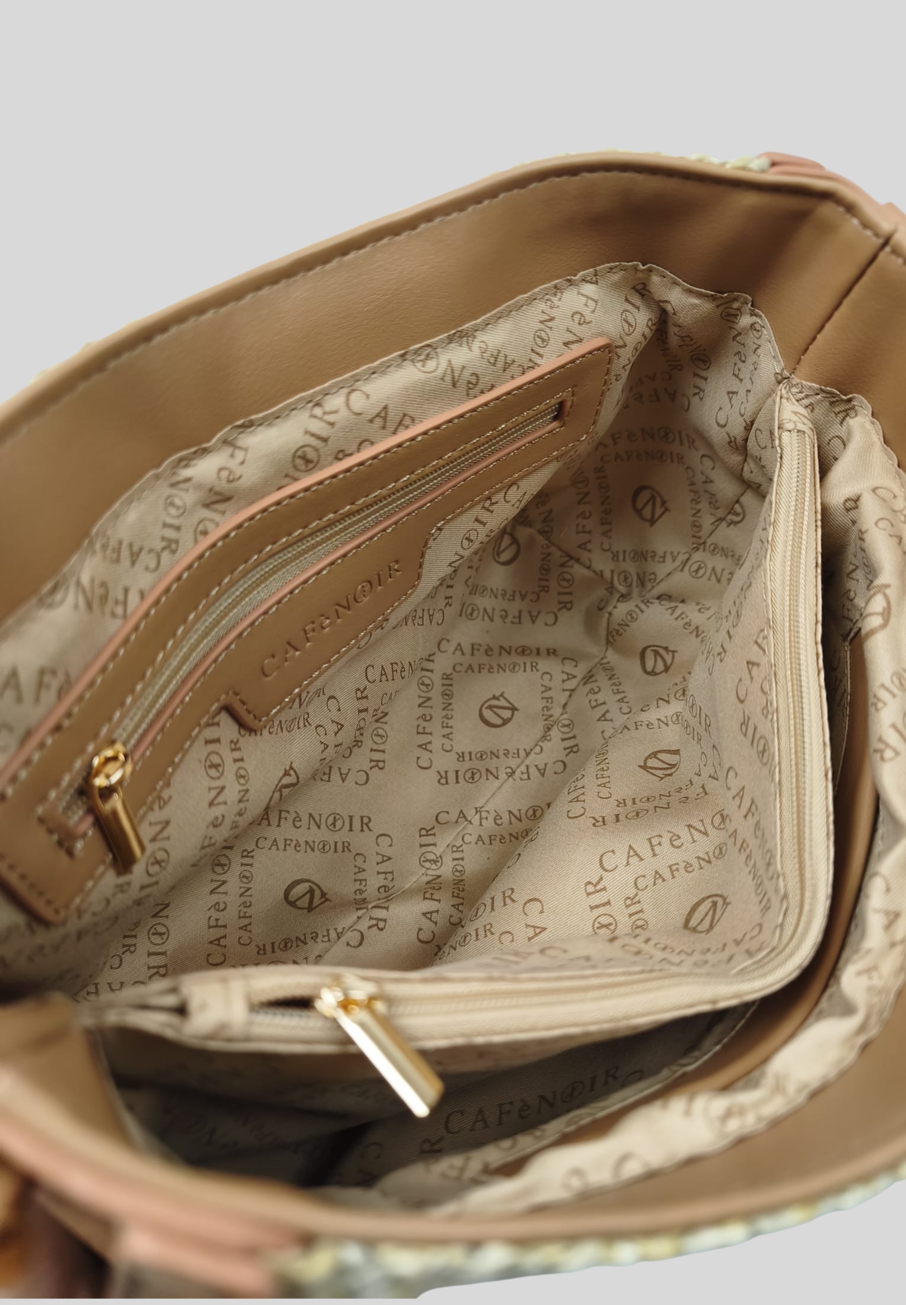 Elegante e di ispirazione estiva, questa borsa a mano Cafè Noir è realizzata in rafia intrecciata con finiture in similpelle poliuretano, che donano struttura e raffinatezza al design. La forma compatta e strutturata è impreziosita da manico rigido rivestito, patta frontale e logo applicato, per uno stile curato nei dettagli. Linterno foderato offre spazio funzionale per gli oggetti essenziali, mentre la tracolla regolabile e removibile consente un utilizzo versatile. Perfetta per look estivi, vacanze e outfit casual chic firmati Cafè Noir.