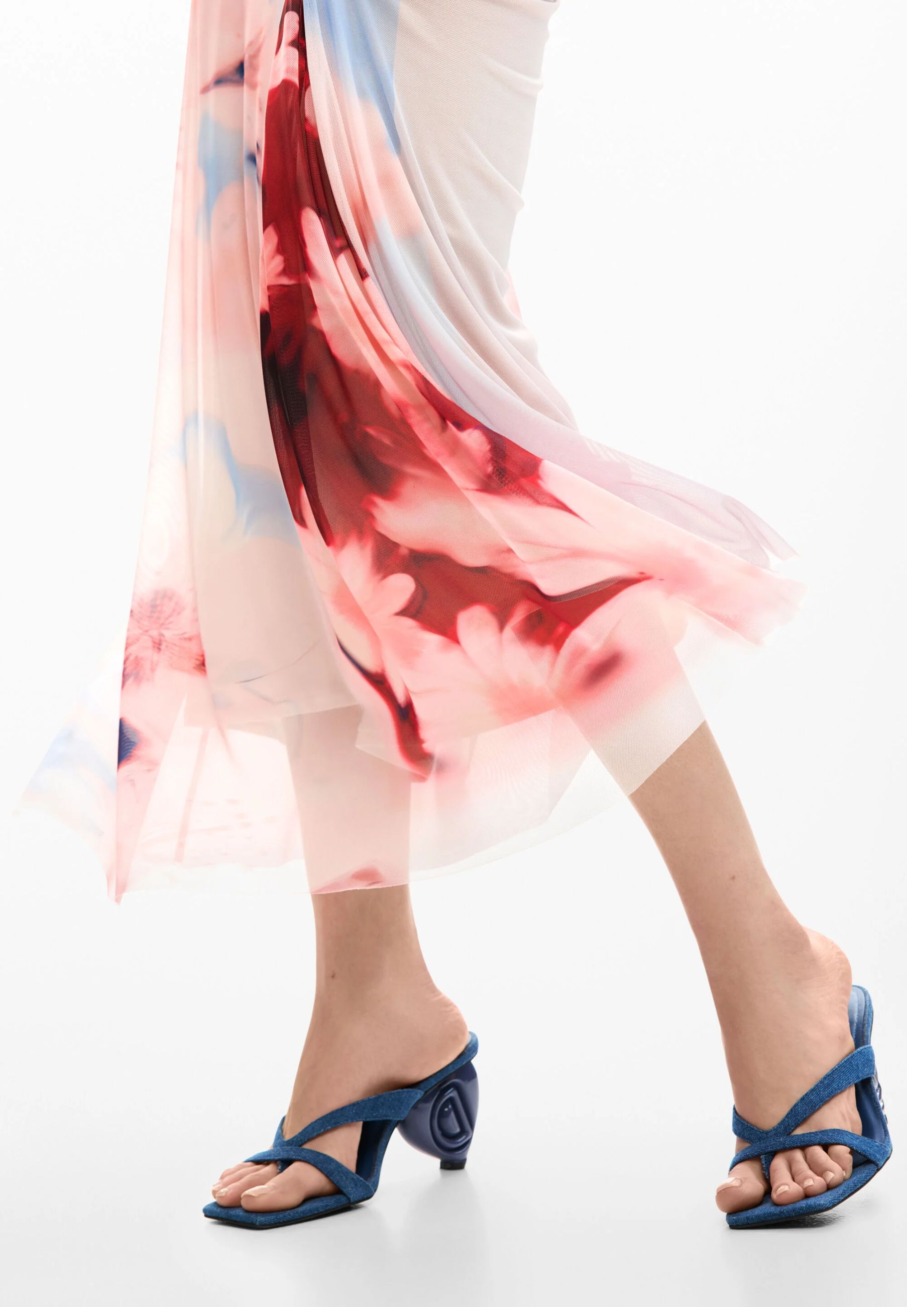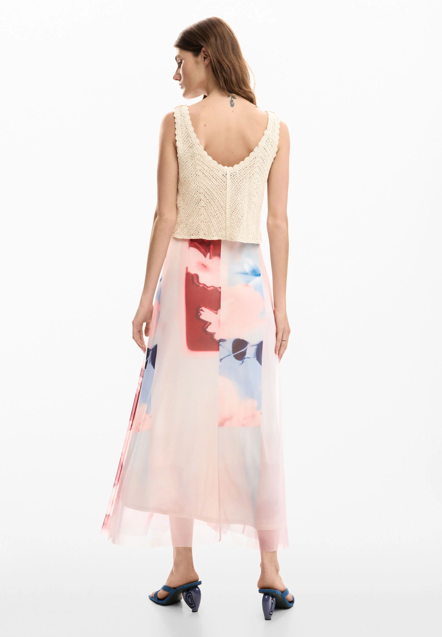 La gonna, realizzata in tessuto morbido e fluido, è caratterizzata da una fantasia acquerellata con motivi floreali e sfumature delicate che donano movimento e un tocco romantico. La caduta morbida del tessuto accompagna i movimenti con naturalezza, creando un effetto elegante e femminile ideale per la stagione estiva.