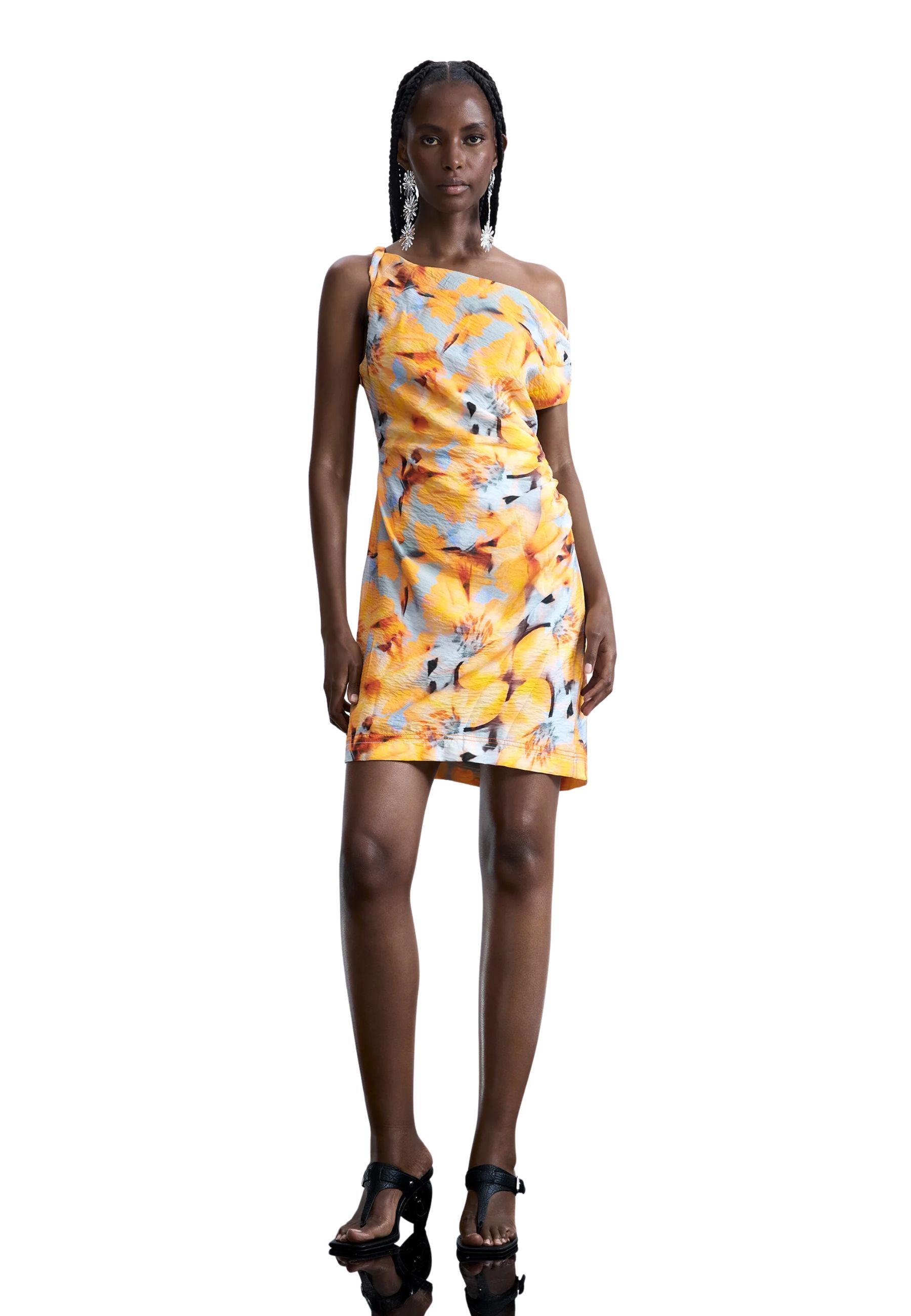Abito corto con scollo asimmetrico e fantasia floreale 26SWVW50