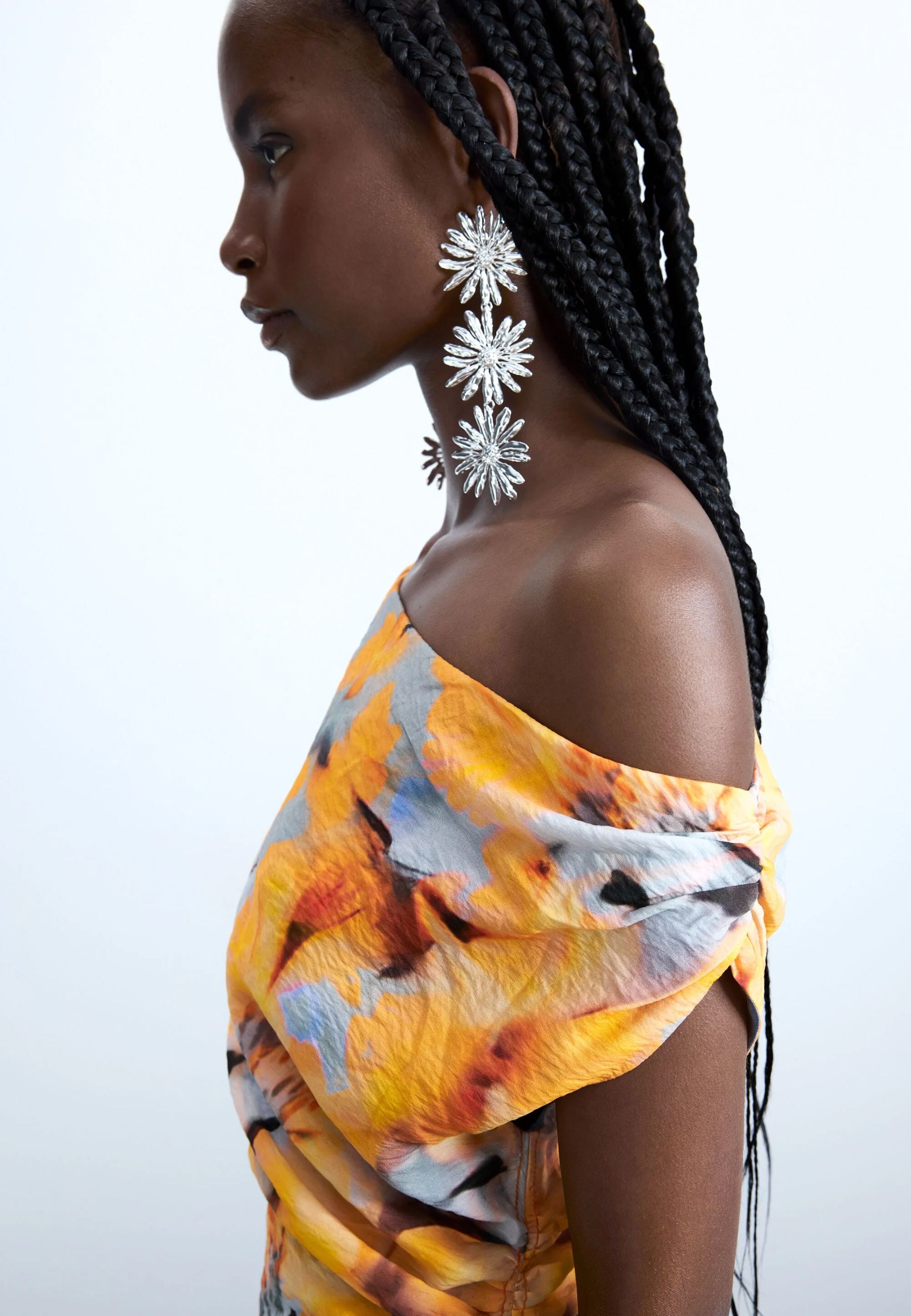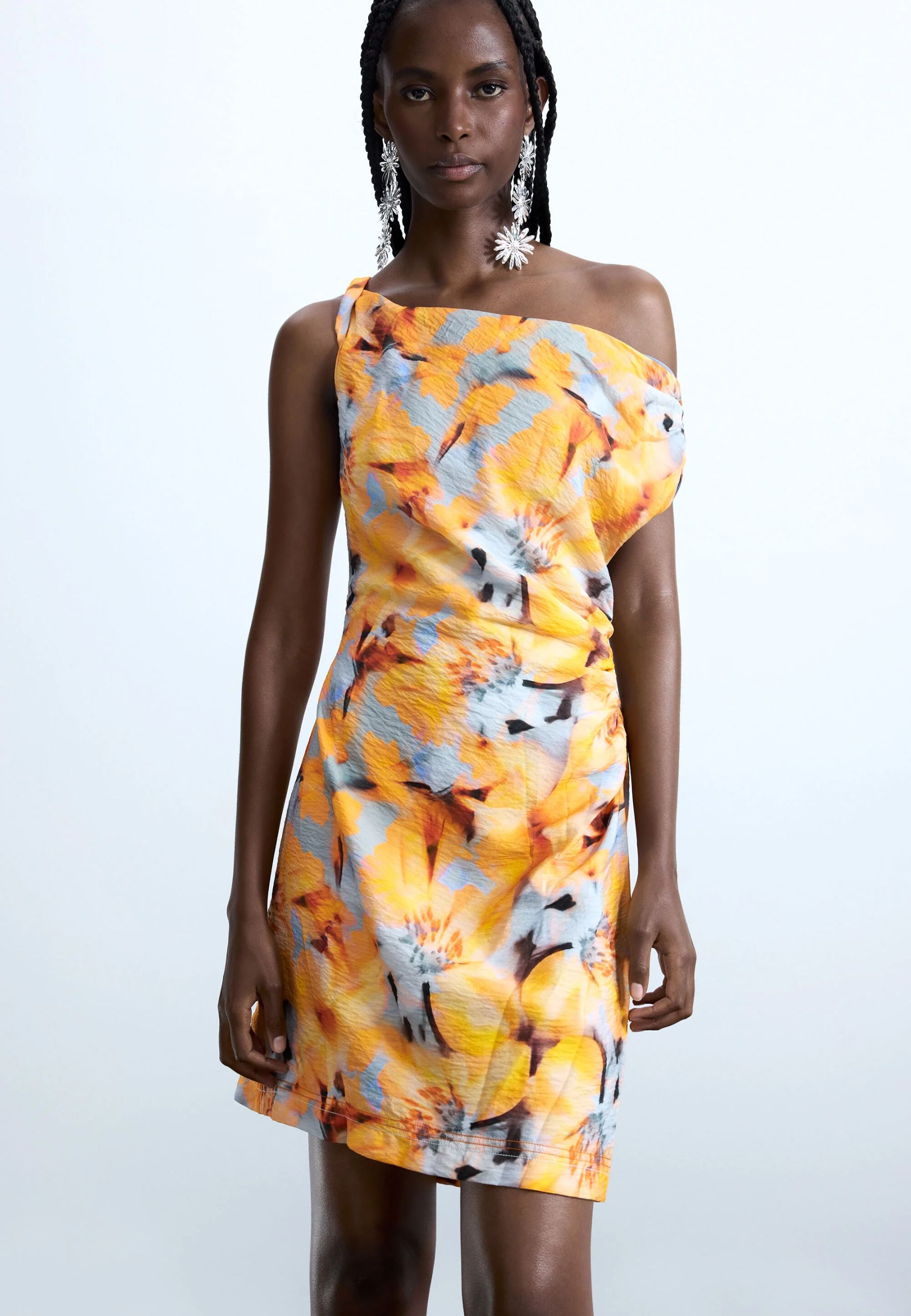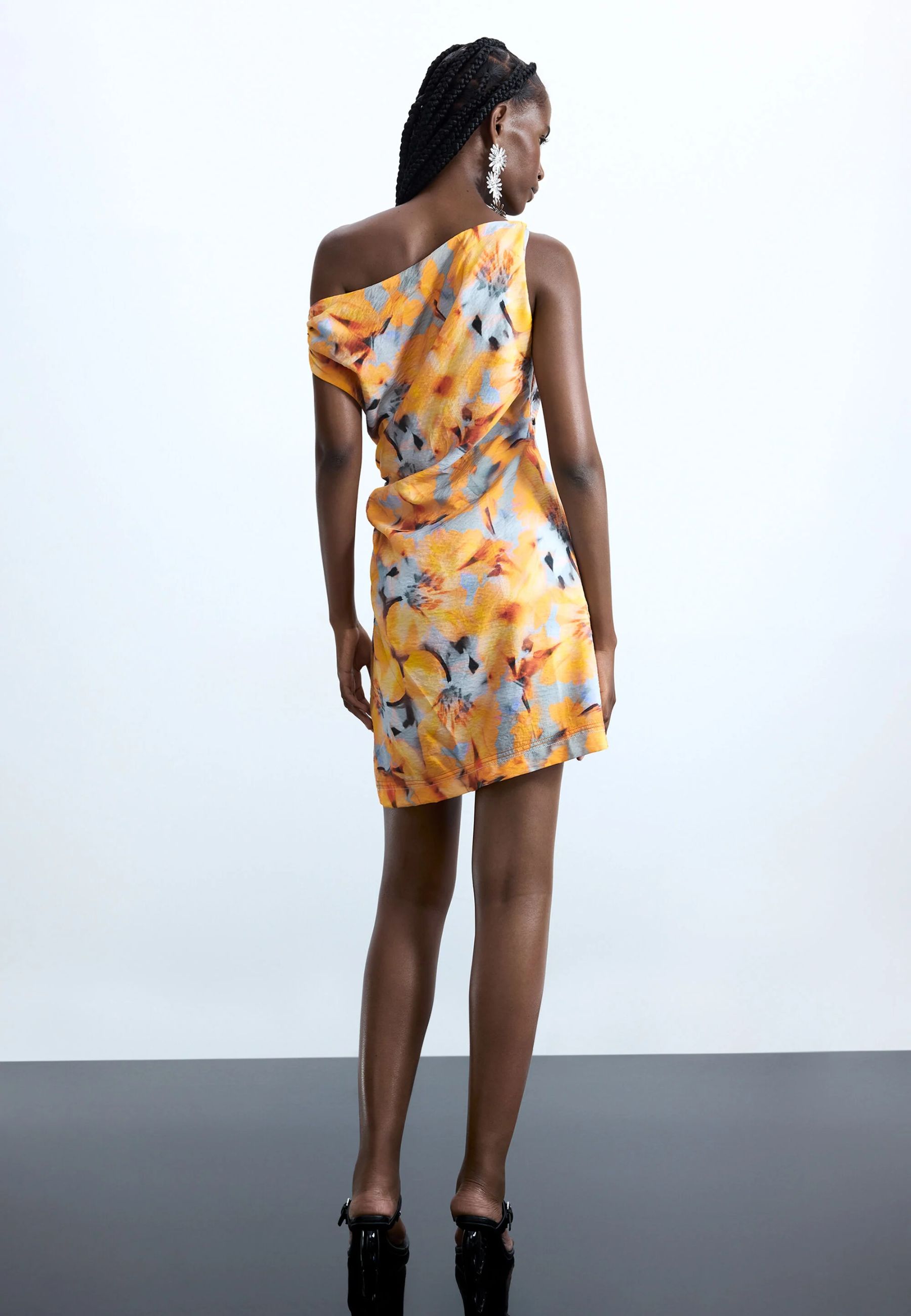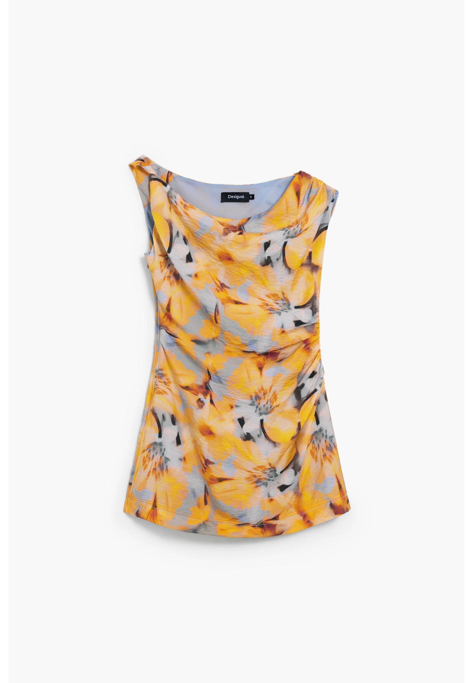 Il design si caratterizza per una stampa floreale vivace e artistica, ricca di colori e dettagli che rendono il capo immediatamente riconoscibile. Lo scollo asimmetrico aggiunge un tocco moderno e dinamico alla silhouette, mentre la lunghezza corta dona freschezza e slancia la figura, creando un look femminile e contemporaneo.
