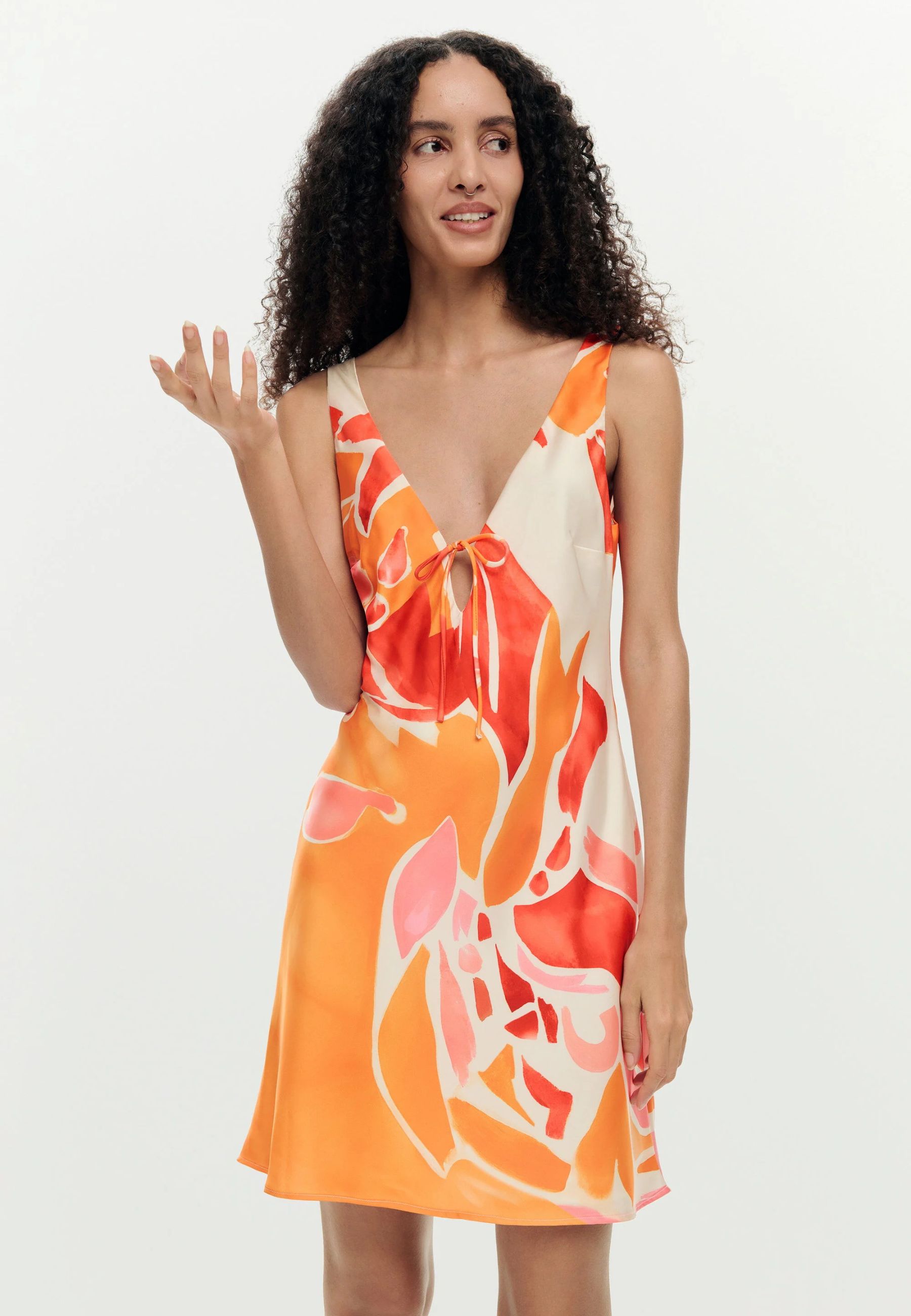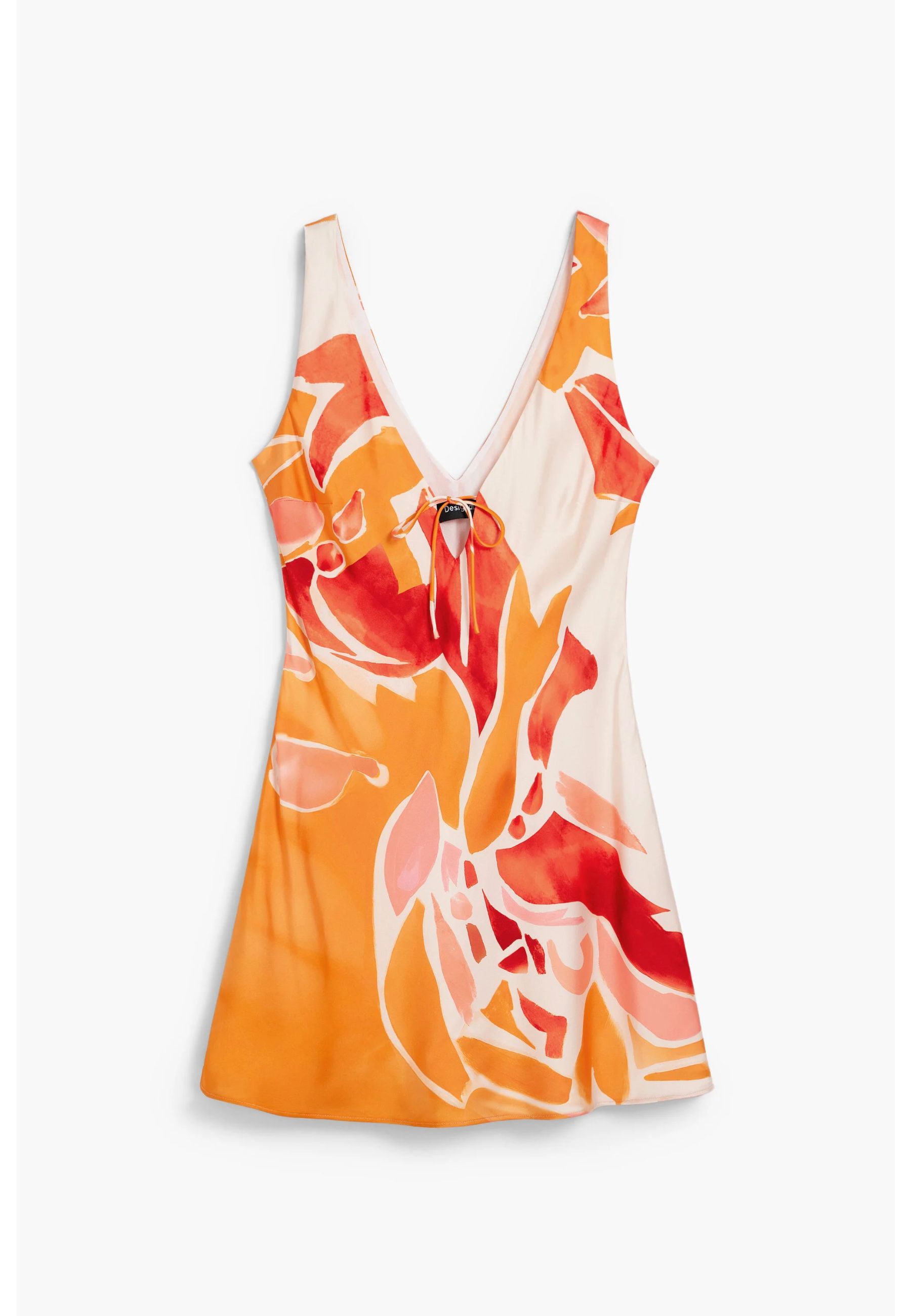 Il design presenta un elegante scollo a V, una linea corta e fluida e una silhouette che valorizza la figura senza risultare aderente. La stampa floreale, caratterizzata da forme morbide e pennellate artistiche tipiche dello stile Desigual, dona al capo un look vivace e immediatamente riconoscibile.