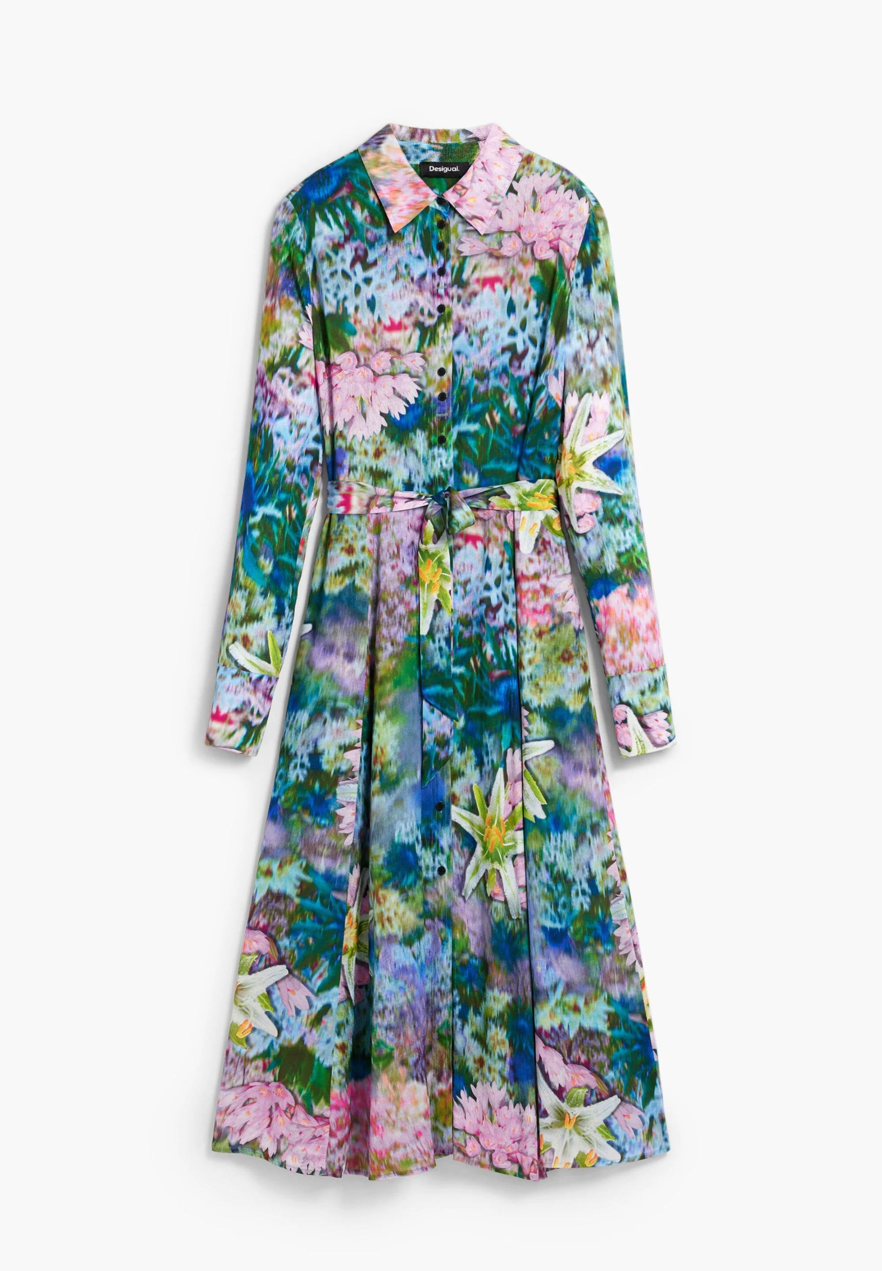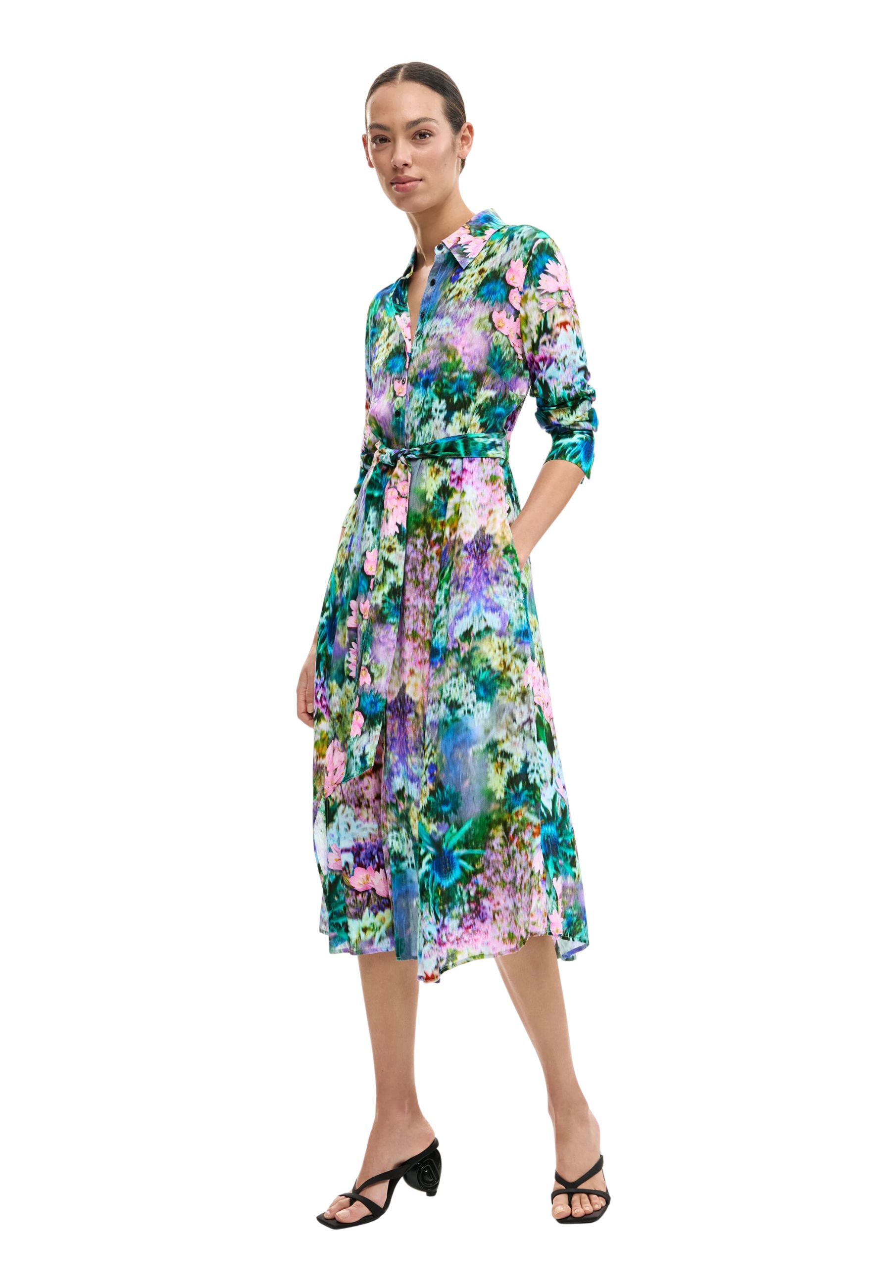 Il design include una cintura coordinata in vita, che definisce armoniosamente le forme, e maniche lunghe con polsino, per un look raffinato e adatto sia al giorno che alla sera. La fantasia floreale multicolore, tipica del mondo Desigual, dona movimento e vivacità allabito, creando un effetto visivo vibrante e moderno.