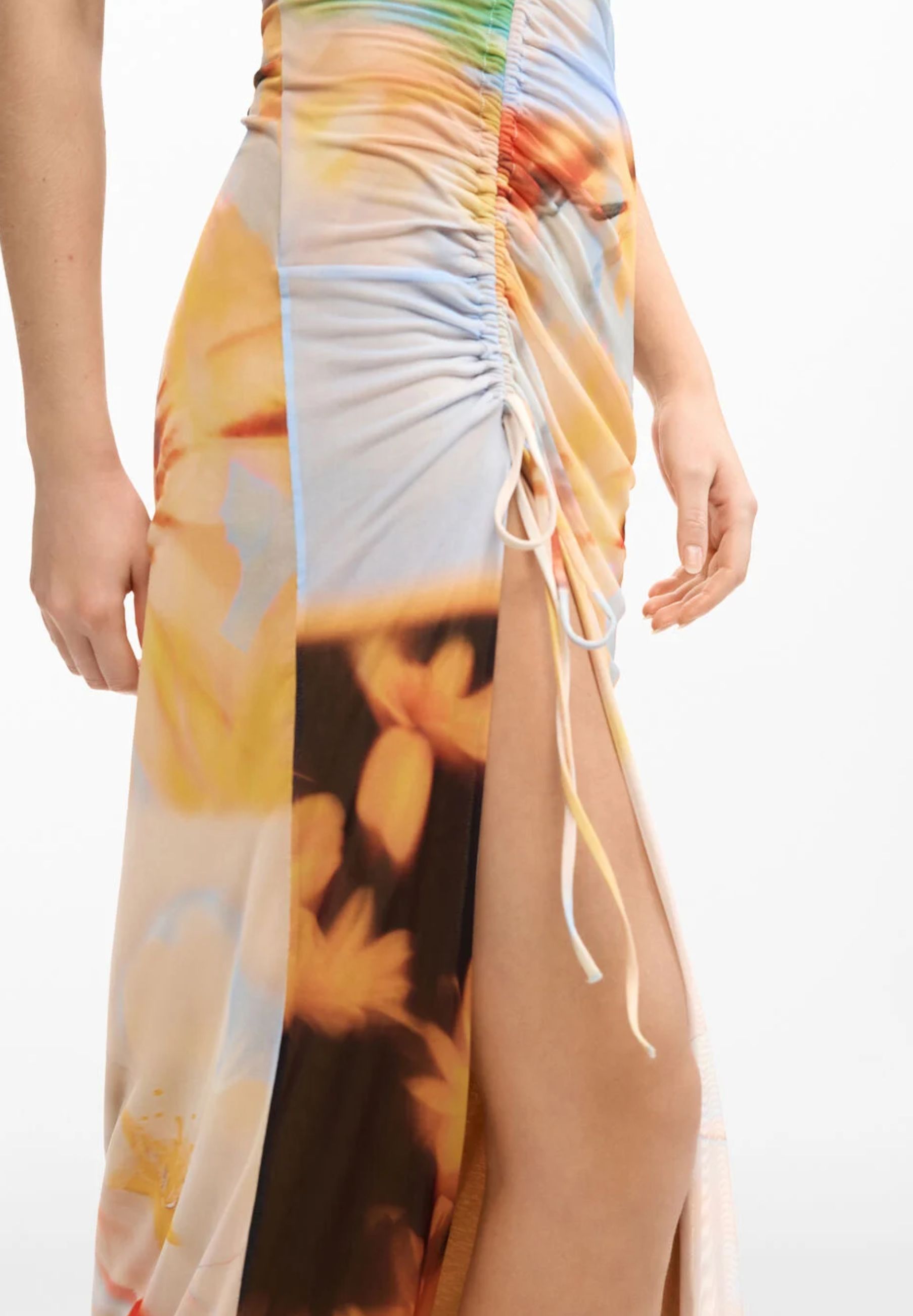 La stampa è il vero protagonista: un mix di motivi sfumati, pennellate artistiche e dettagli astratti, tipici dellidentità Desigual, distribuiti lungo tutta la lunghezza dellabito. Le tonalità brillanti si fondono creando un effetto visivo dinamico e moderno.