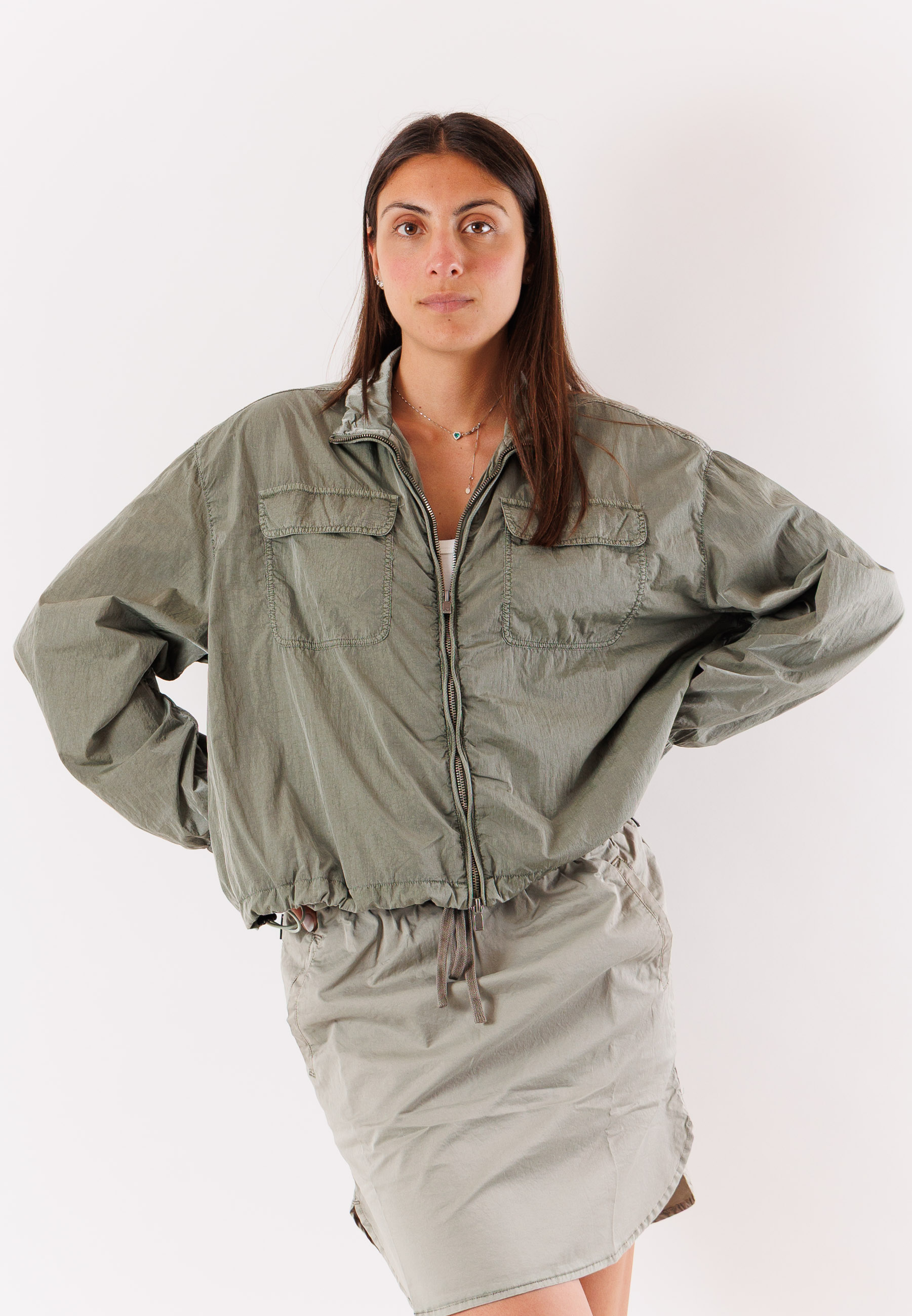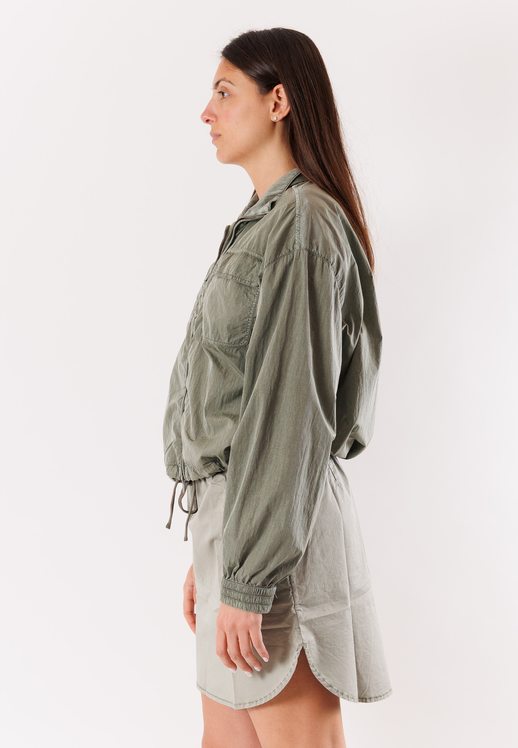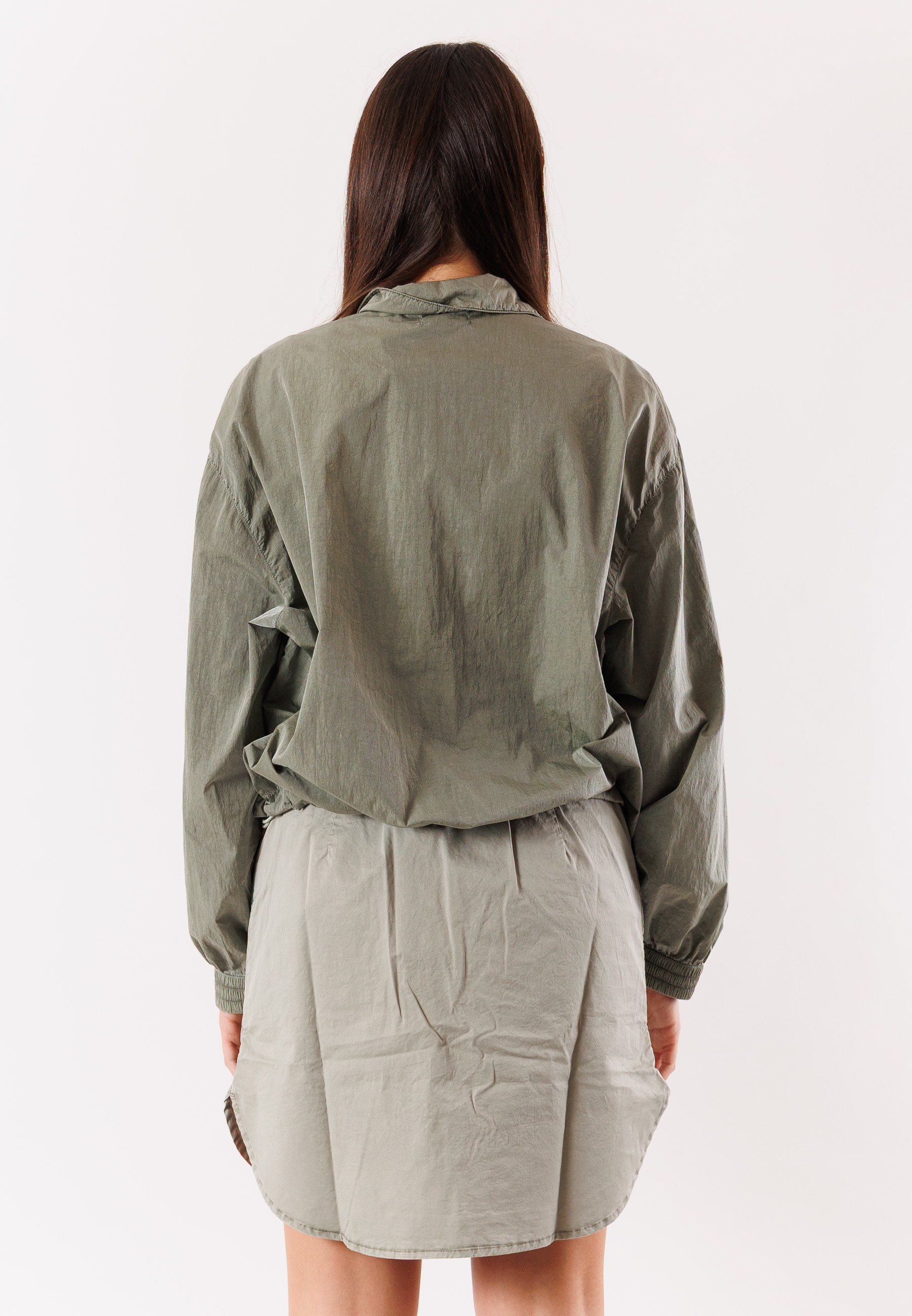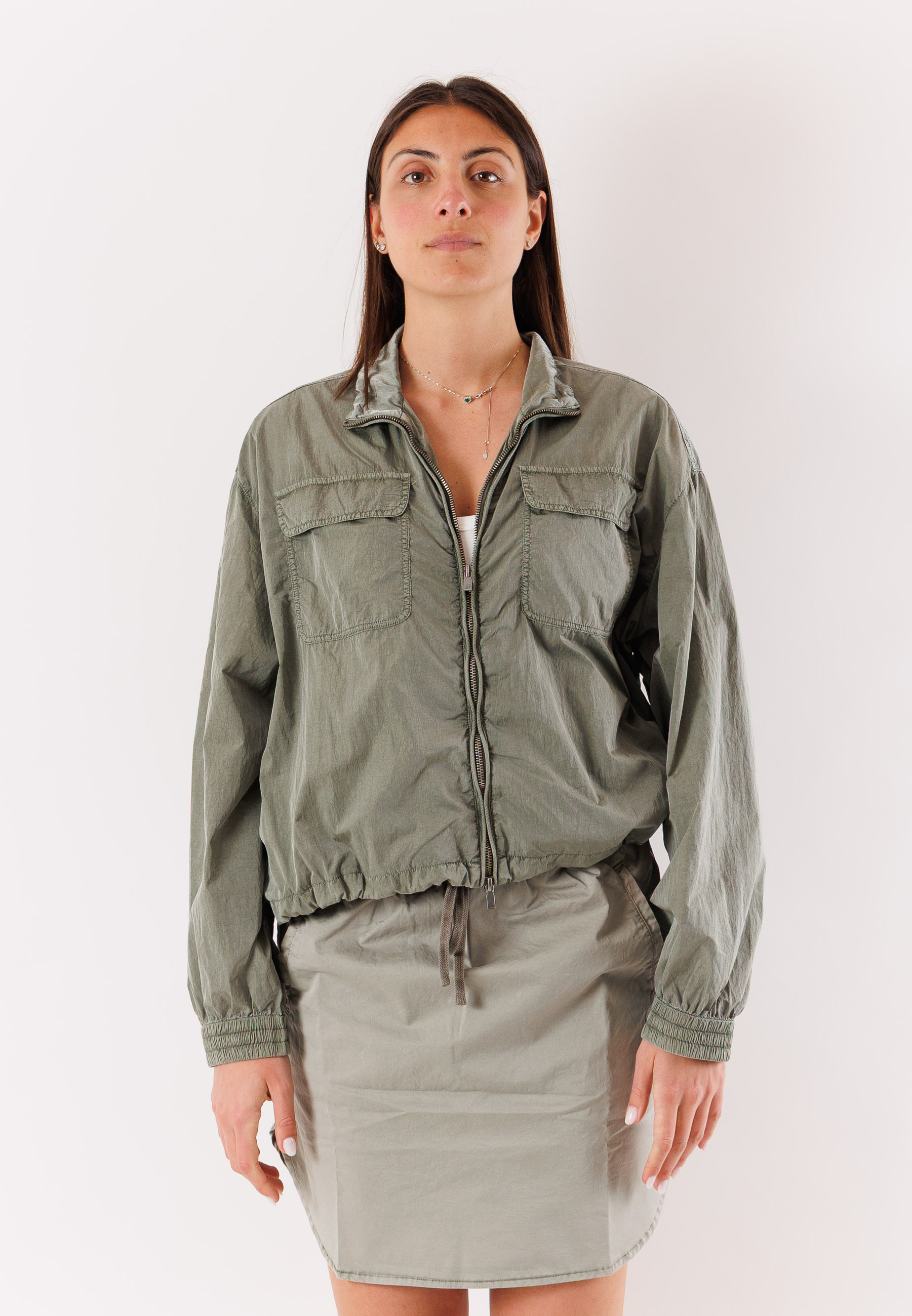 Il design presenta una chiusura frontale con zip, un collo alto e una linea morbida che garantisce comfort e libertà di movimento. Le maniche lunghe con polsini elasticizzati e il fondo leggermente arricciato contribuiscono a una vestibilità pratica e moderna. La struttura essenziale rende la giacca facile da abbinare e adatta a diverse stagioni.