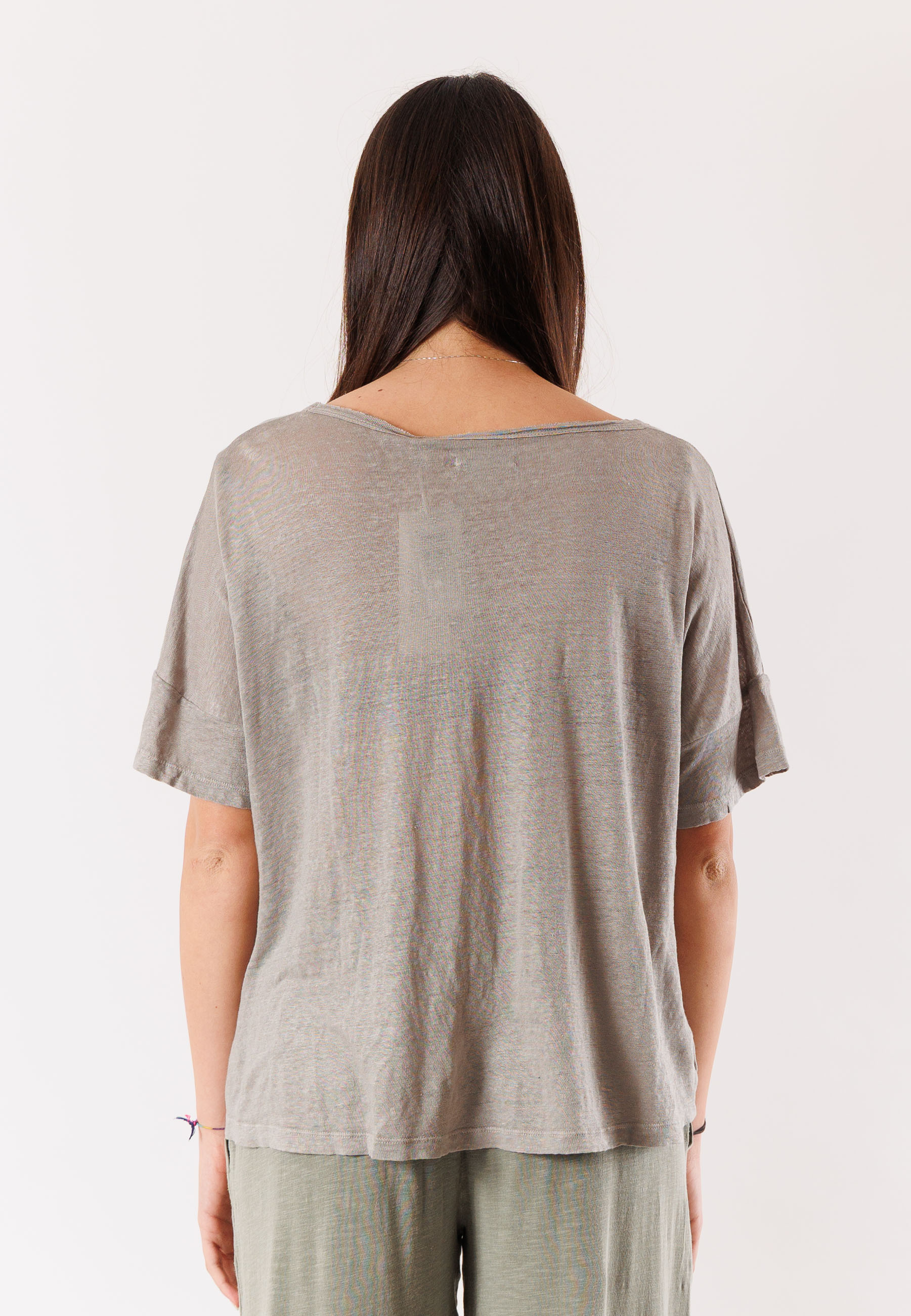 Perfetta da abbinare a pantaloni ampi, denim o gonne, questa T-shirt in lino si presta a look casual, minimal o sofisticati a seconda degli accessori scelti. Un capo essenziale e senza tempo, firmato Keeling, pensato per un guardaroba quotidiano fresco e funzionale.