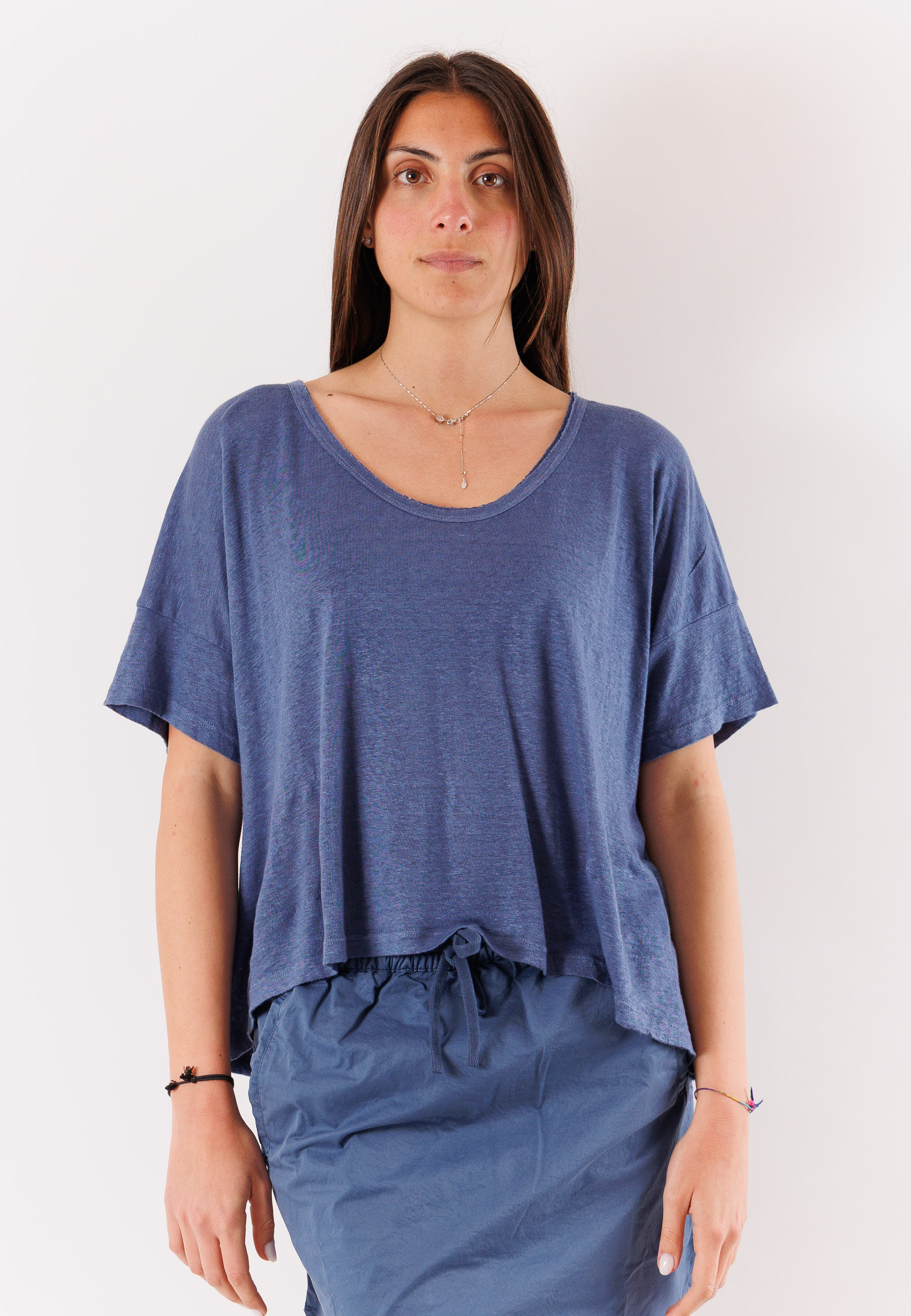Perfetta da abbinare a pantaloni ampi, denim o gonne, questa T-shirt in lino si presta a look casual, minimal o sofisticati a seconda degli accessori scelti. Un capo essenziale e senza tempo, firmato Keeling, pensato per un guardaroba quotidiano fresco e funzionale.