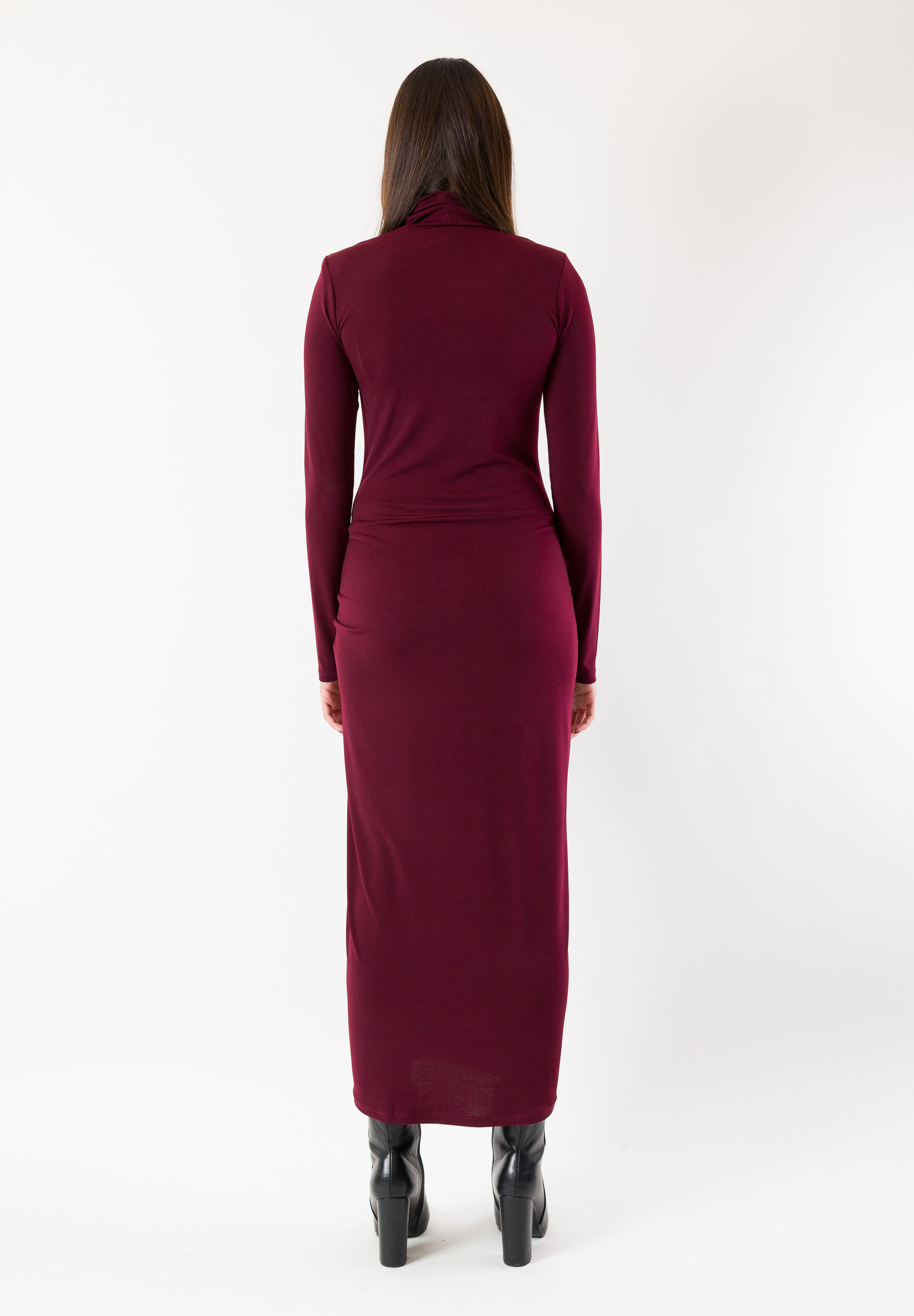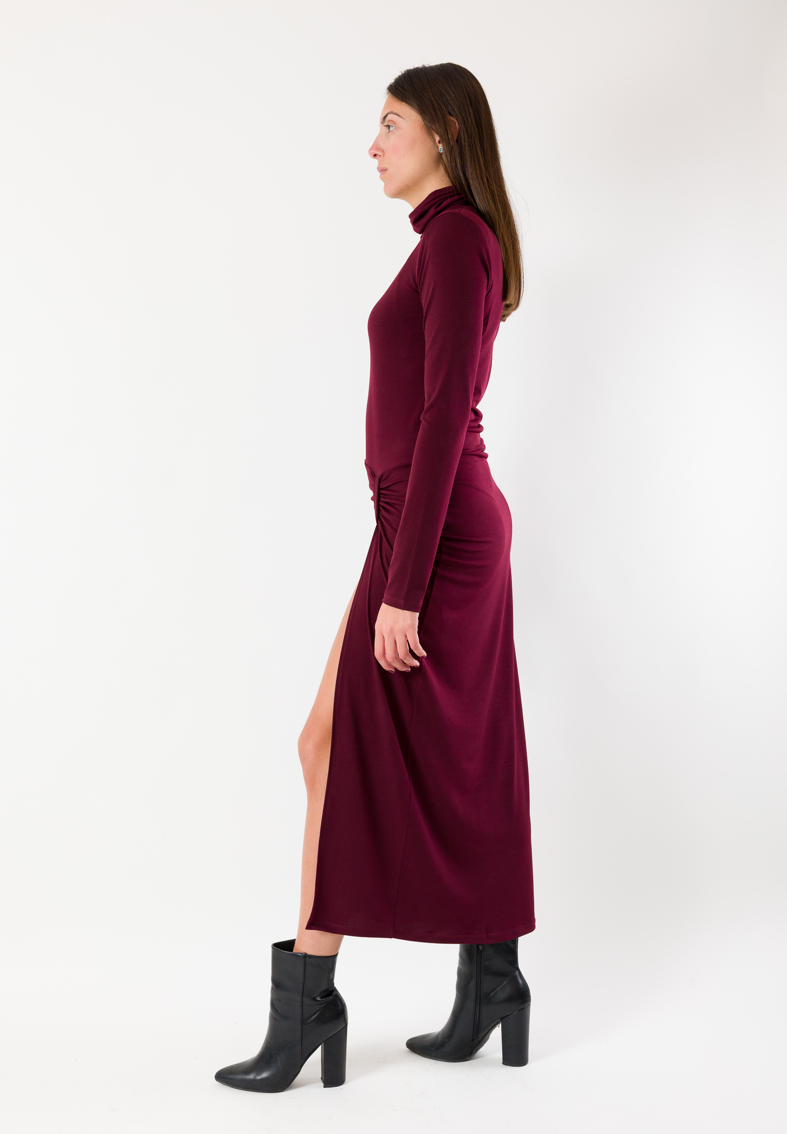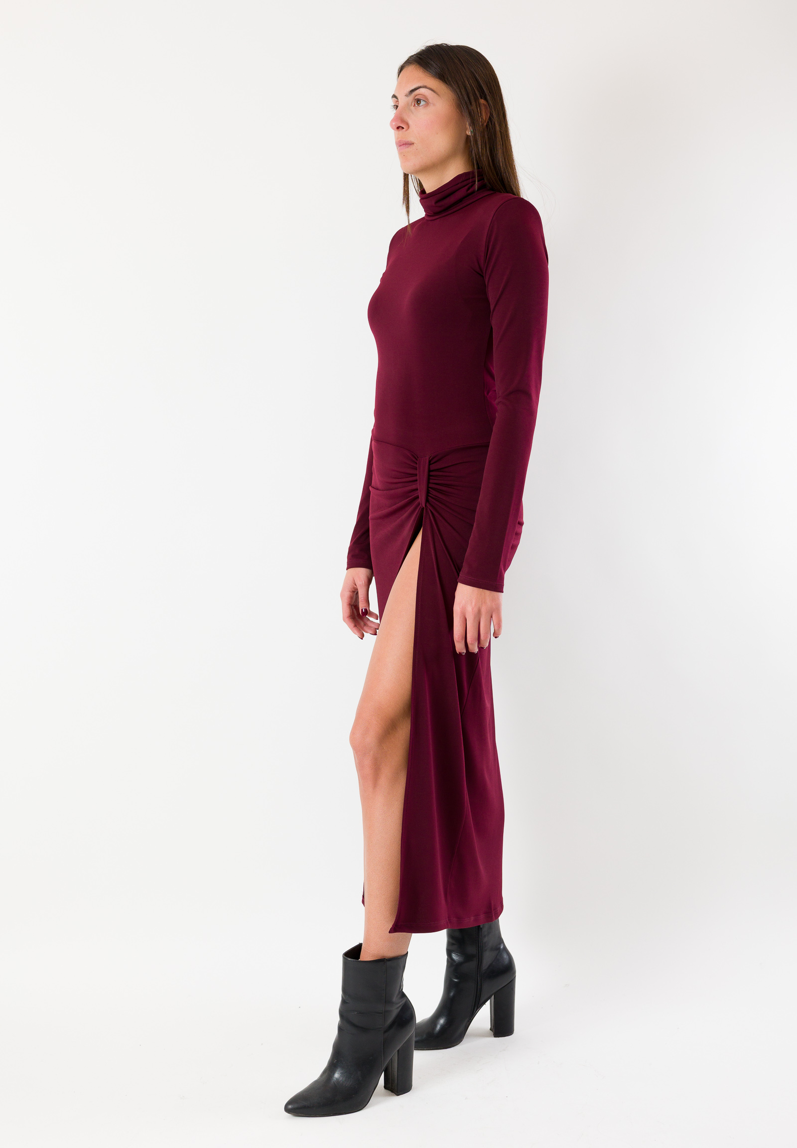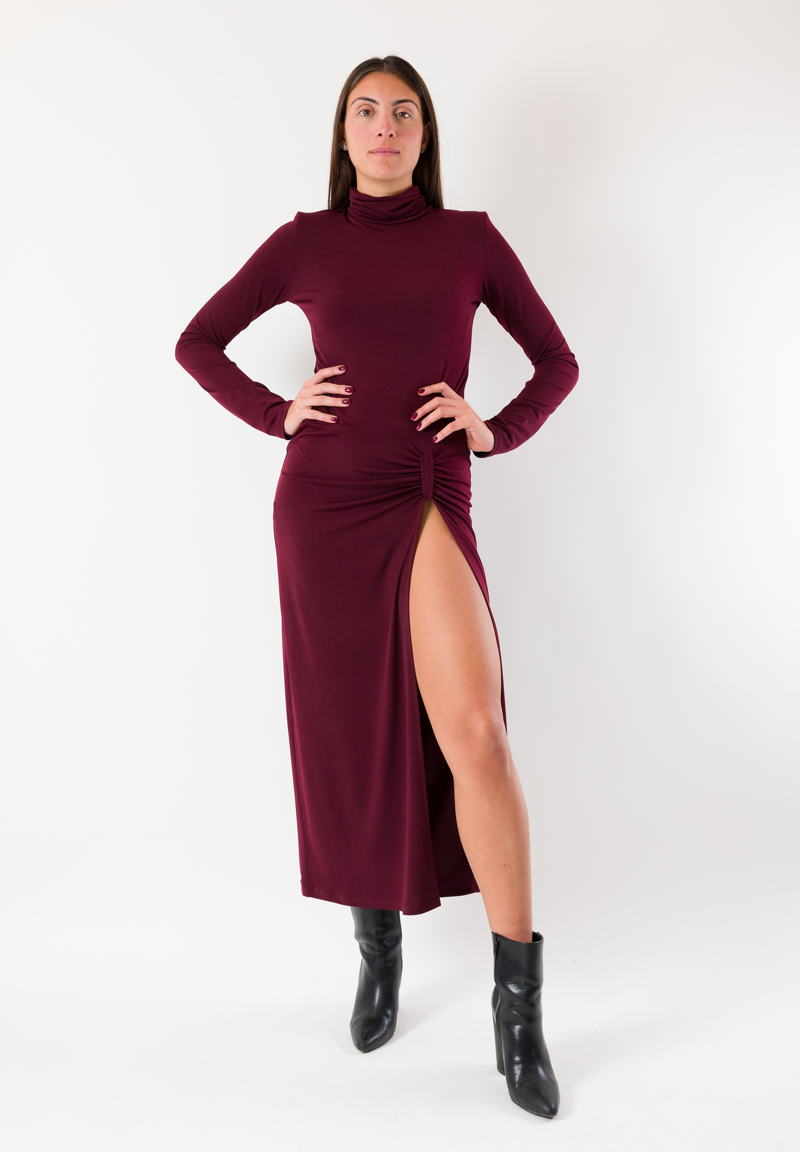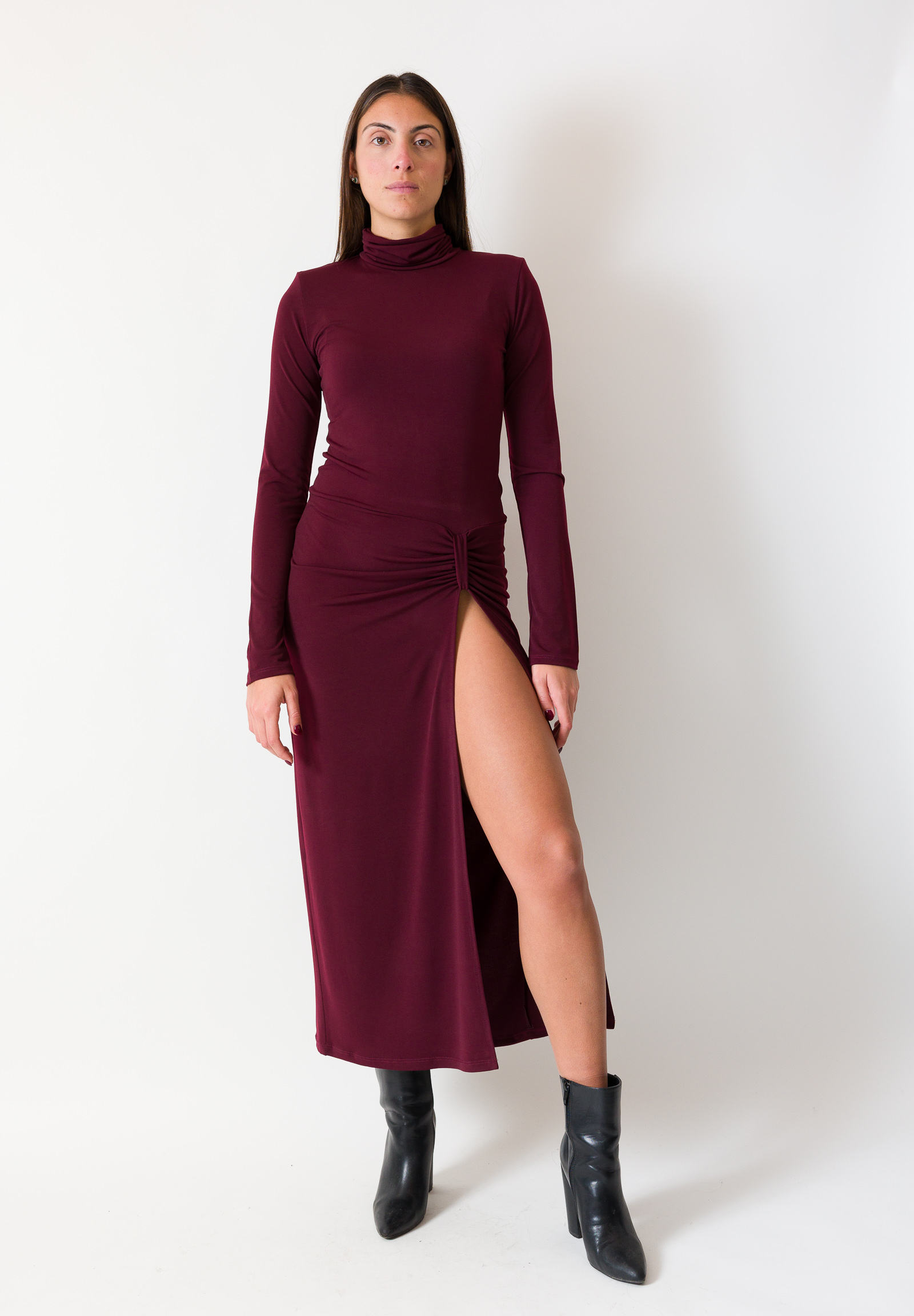 La linea lunga e scivolata slancia la figura, mentre larriccio laterale allaltezza del punto vita crea un effetto modellante che enfatizza le curve. Lo spacco profondo aggiunge un tocco seducente ma sempre raffinato, perfetto per eventi, cene di gala e look da party natalizio.